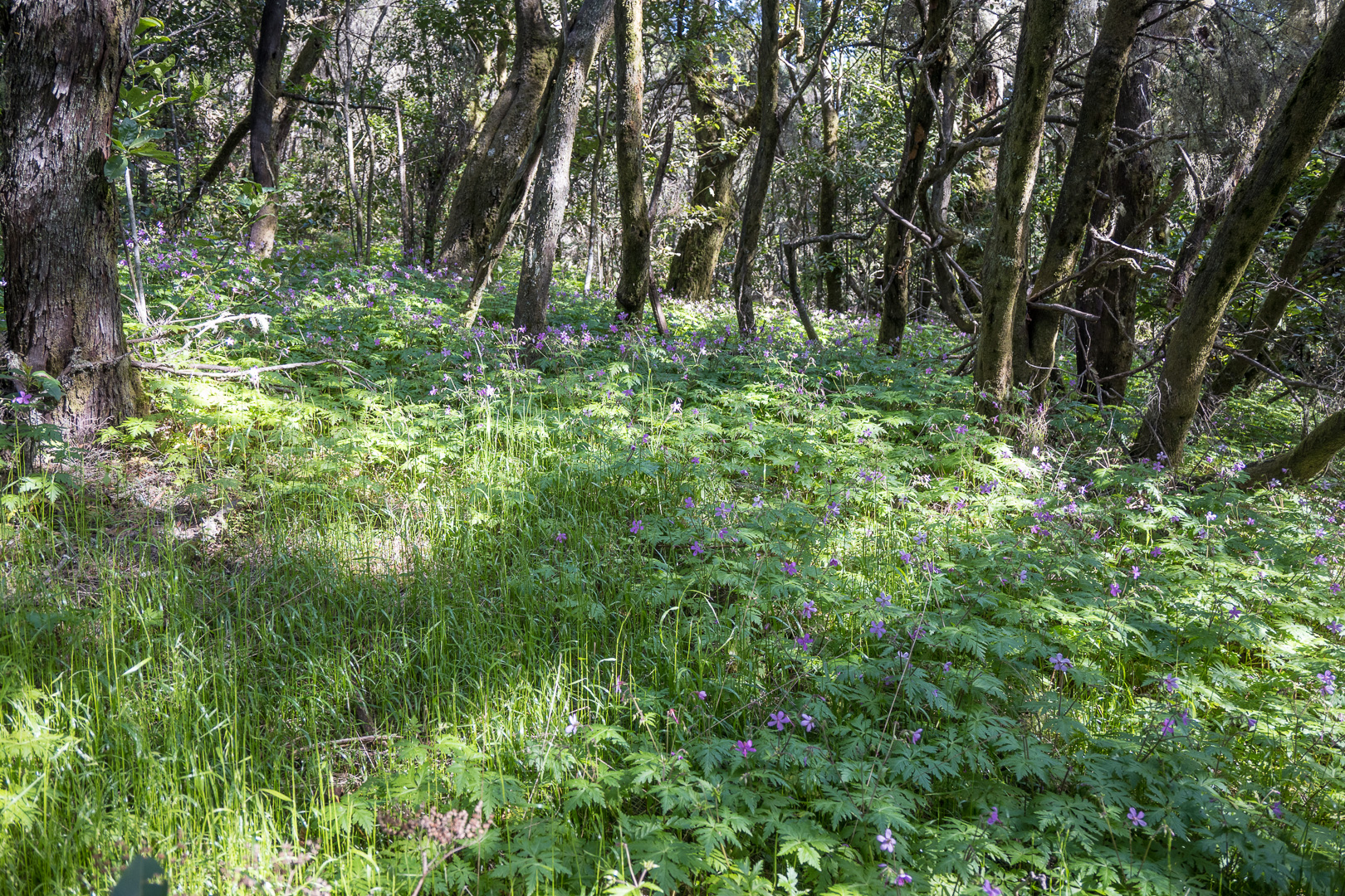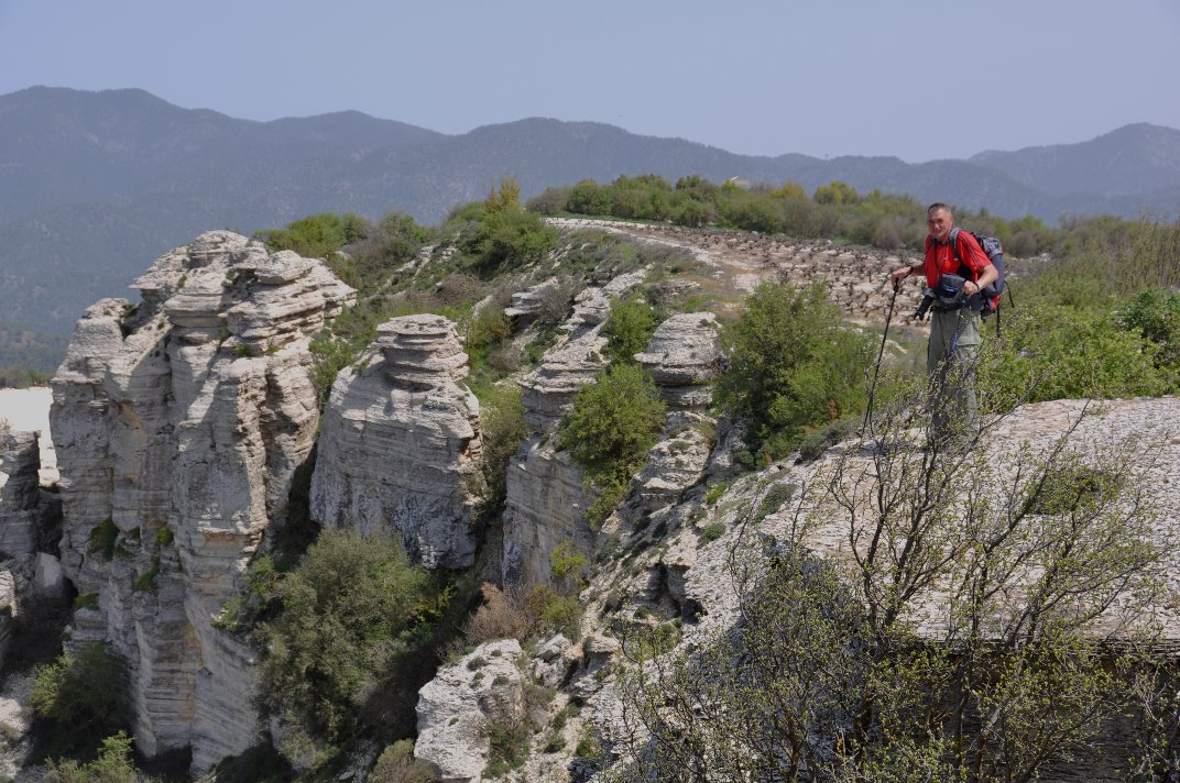 Sunday was probably the hottest day and although we walked from Pano Panagia (marked on map without number) at about 1000m it was all in the sun and quite hot. The vineyards do not of course have any leaves at this time of year and the tracks were wide which did not make the walk very attractive. The guide spotted a new type of orchid but it was very small. At the top there was a small chapel and some interesting rock formations in the limestone. Afterwards we visited the Chryssorogiatisa monastery (47) and had a pic-nic lunch with wine provided in the forest.