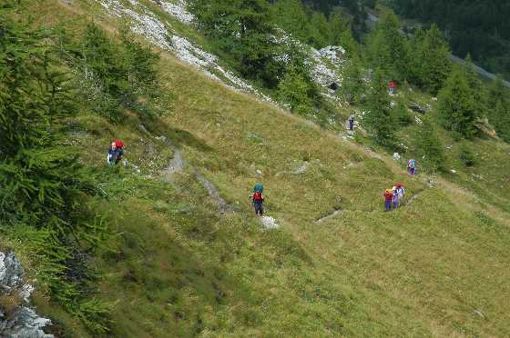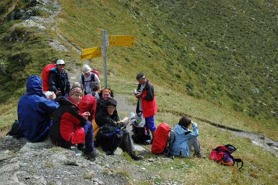 Der erste Teil der Wanderung verlief entlang des Flusses talabwärts, wo auch Spuren von Überflutungen zu sehen waren. Bald aber ging es über Wiesen und steil durch einen Lärchenwald auf der anderen Talseite bergauf. Trotz Sonnenscheins tropfte es immer noch ganz wenig und Ich machte ein Gruppenbild ohne Matterhorn. Im Jahr davor hatten mein Bruder Peter und ich es von dieser Stelle aus gegen blauen Himmel gut sehen können. Wir blieben nicht lange auf der Finestra di Cignana (2,441m), wo es empfindlich kalt blies, sondern liefen schnell hinunter zum Stausee Lago di Cignana, um das Rifugio gegen halbsechs Uhr zu erreichen. |