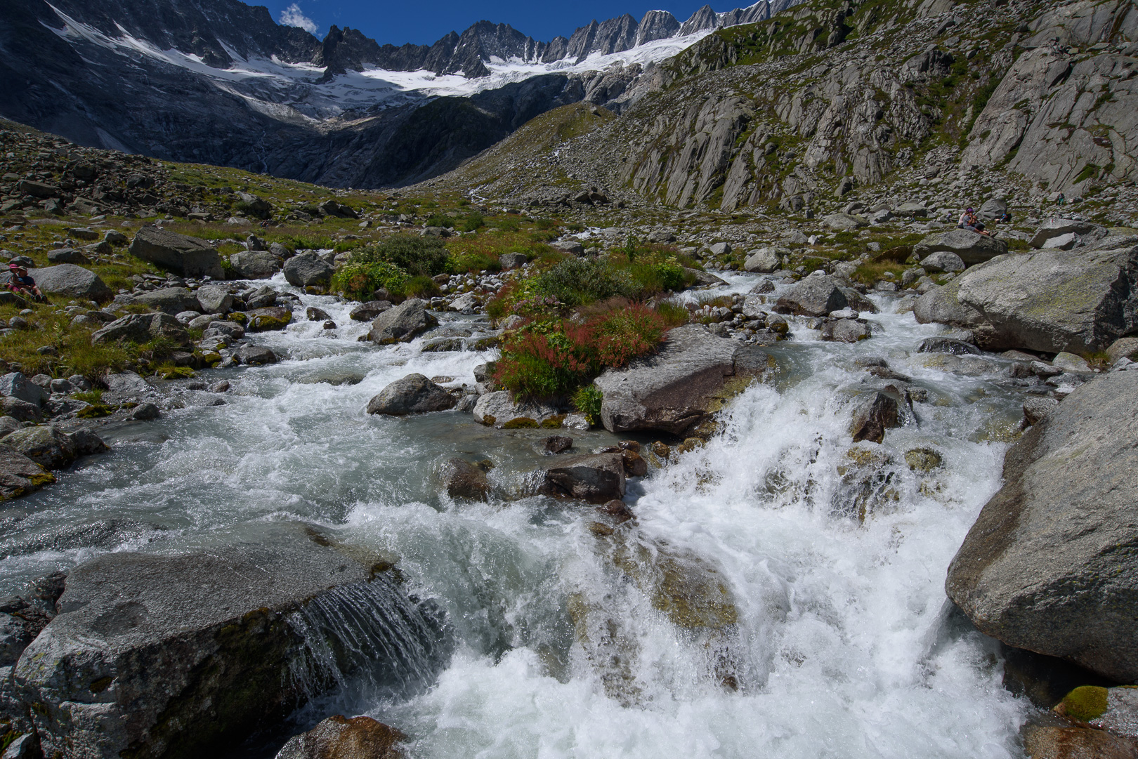 Dort gibt es wieder eine kleine Hütte (Bivacco Luca Reboulaz), die einen netten Eindruck macht. Brigitte und ich kühlen uns ganz kurz im See ab, um anschliessend in den sonnigen Felsen zu liegen. Adrian wiederholt das Gleiche an einer windstillen Stelle auf der anderen Seite des Sees |