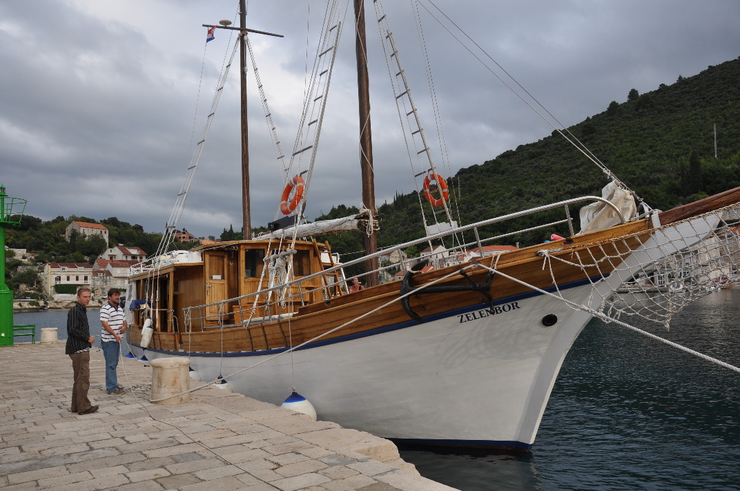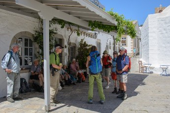 Nachdem wir den überpünktlichen Bus bestiegen und unser ausuferndes Gepäck eingeladen hatten, ging es entlang einer aussichtsreichen Küstenstrasse nach Agios Stefanos, wo unser Schiff bereits im Hafen lag. Die halbstündige Schifffahrt selbst verlief weitgehend ereignislos – zeitweise hat das Boot massiv geschaukelt (ist aber nicht einmal gekentert), wir haben viele kleine Inseln passiert (aber keine gerammt), manchen Leuten wurde leicht übel (aber keiner ist über Bord gegangen). Alles in allem eine geglückte Überfahrt. Um Mut zu machen, haben unsere UPs einstimmig kommentiert, dass bei der Rückfahrt am Nachmittag wohl mit viel stärkerem Wind zu rechnen sei. Aber wer will schon so weit voraus denken. |