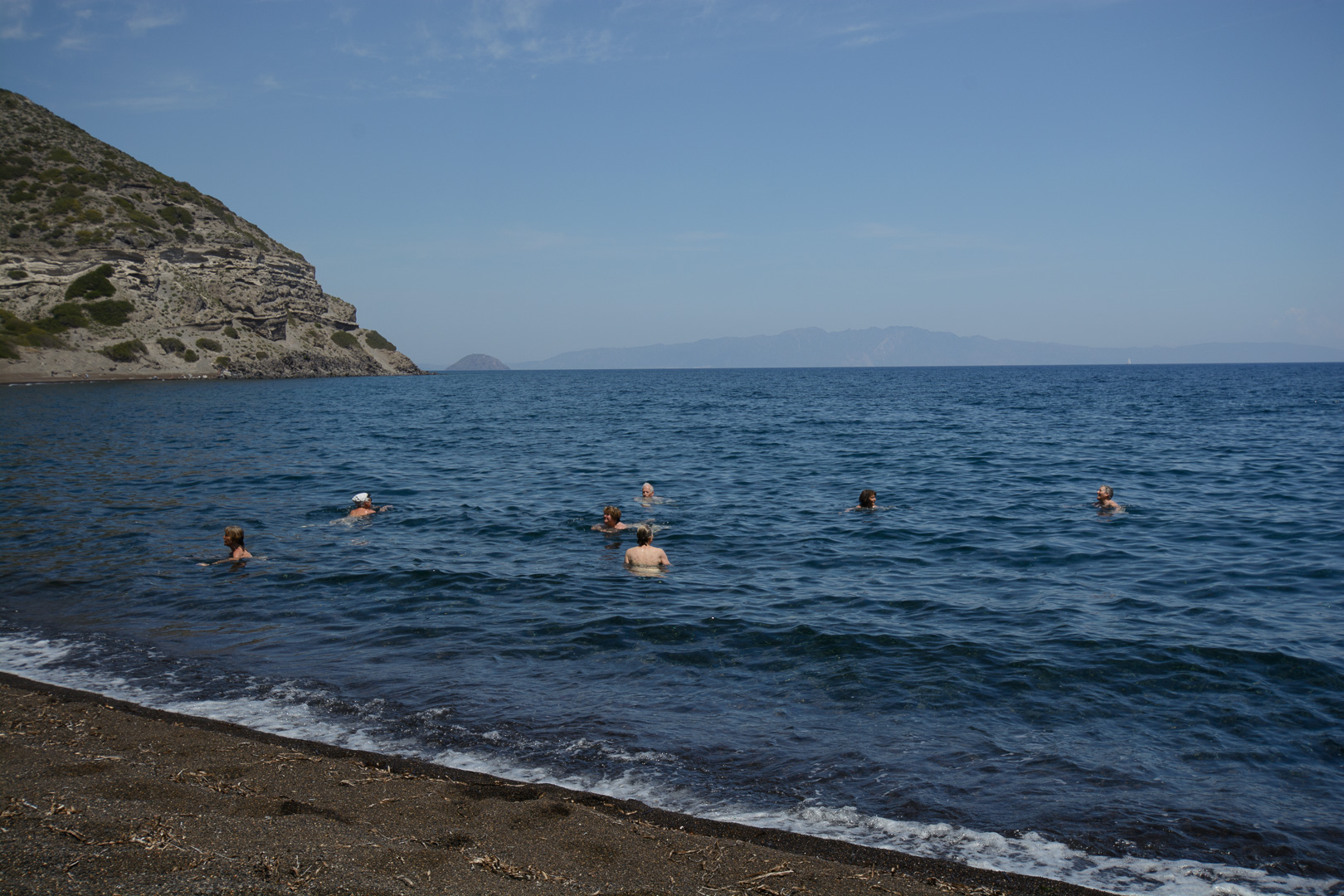 Das mit dem Schwimmen möchte ich kurz erörtern. Wie die meistenInseln hat Mathraki mindestens zwei Seiten, in diesem Fall eine Ost- und eine Westküste. Nun ein Geheimtipp – die leichter zugängliche Ostküste ist nicht nur windig, sondern auch menschen- und quallenverseucht. Die Westküste hingegen ist von einzigartiger Schönheit und menschenleer (weil nur wenige sie finden). Mechthild, Marianne und ich haben als Spähtrupp das Gelände rekognosziert und René als Begleitschutz mitgenommen. Das Gelände war geröllig und unwegsam. Nachdem wir verstanden haben,wie das Gelände funktioniert, haben wir alsbald eine kleine Bucht für uns okkupiert (René ging noch circa zwei Kilometer weiter, um dann schnorchelnderweise das Meer Richtung Italien zu überqueren). |