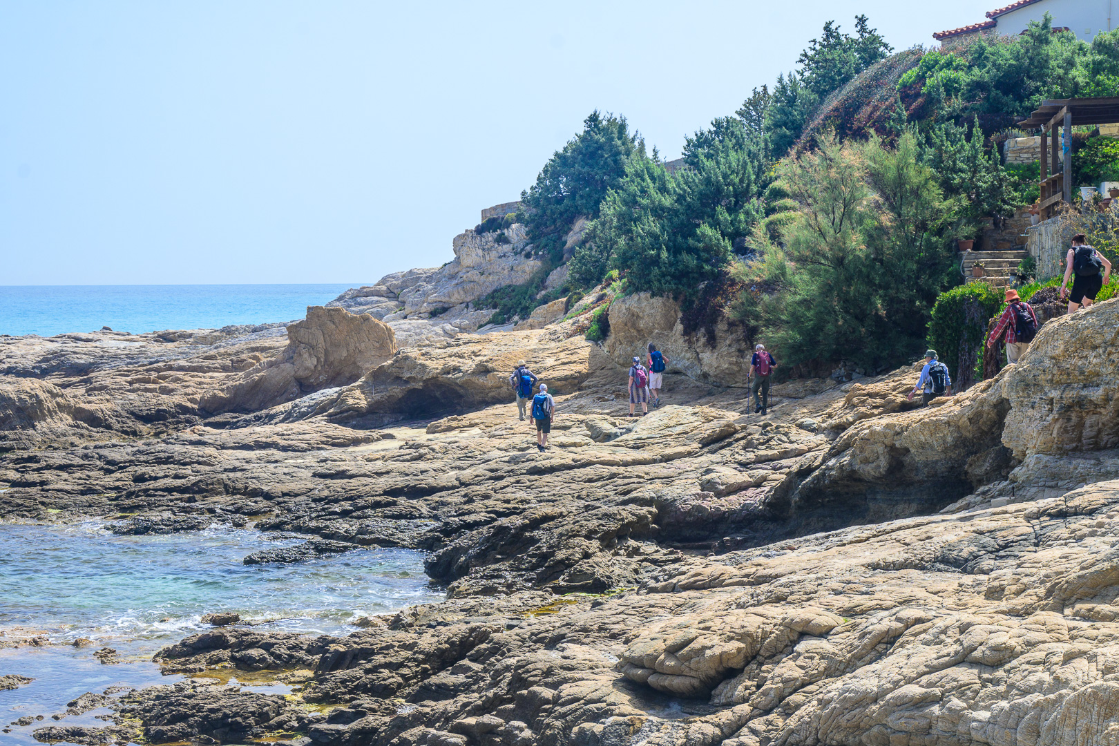 Eine sehr kleine Insel wie Mathraki von ungefähr 3 km Länge hat einen nicht zu unterschätzenden Vorteil – exzessives Wandern ist unmöglich, bei aller Kreativität. Als Nachteil hingegen könnte es dort langweilig werden, weil der Handlungsspielraum etwas limitiert ist. Es freut mich, zu berichten, dass unser Tagesprogramm von einer einzigartigen Vielfältigkeit geprägt war und jeder in unserer Gruppe ihre/seine natürlichen Begabungen voll ausleben konnte. Es gab solche, die jede Bewegung minimierten, einfach den Moment genossen und die unvergesslichen Blautöne des Meers auf sich wirken liessen – diese Leute haben am glücklichsten gewirkt am Abend. Andere haben sich in Steine verbissen und die geologischen Hintergründe der Insel genauestens studiert (alles mathrakiatischer Sandstein, stellenweise tafoni-verwittert). |