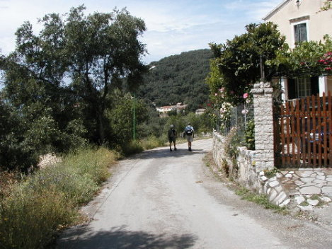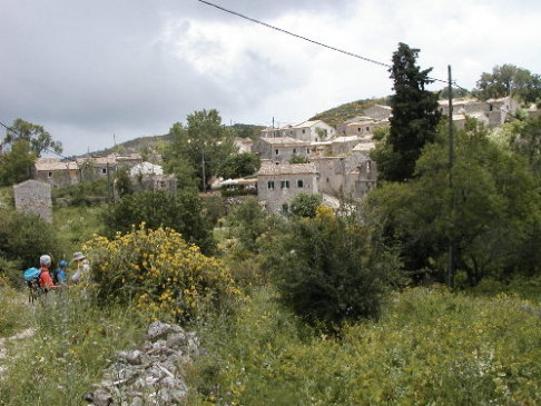 Es war Pfingstsonntag, und als wir an der kleinen griechisch orthodoxen Kirche am Ende des Dorfes vorbeikamen, erschall schöner Chorgesang via Lautsprecher aus dem Inneren der Kirche. Durch das offene Kirchenportal konnten wir die Messe beobachten und etwas Weniges von der feierlichen Stimmung erahnen. Aber weiter ging es für uns aufwärts durch dichten grünen Wald auf schönem Pfad nach Santa, wo wir aber schon beim ersten Haus vor dem Dorfeingang auf eine nach Buch “ruhige” Asphaltstrasse Richtung Mengoulas nach links abbogen. |