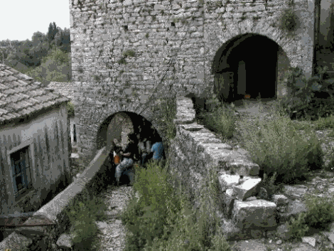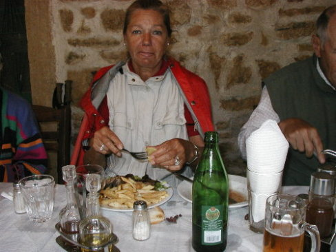 Eine wie mir schien Fata Morgana weckte mich aus der etwas schwermütigen Träumerei auf. War dort geradeaus vorn oben nicht eine Restaurant-Terrasse?? Wie sich herausstellte, gab es sogar zwei Restaurants!! Um nicht einen der beiden Wirte zu enttäuschen, teilten wir uns auf die beiden heimeligen und typisch lokalen Tavernen auf. In meiner Gruppe schmeckten einheimische Bratwürste mit einem Glas Bier herrlich. Brigitte liess sich zu einem besonderen Schlemmermahl hinreissen! Wir merkten überhaupt nicht, dass während dem ganz nahe von uns ein Gewitter mit Hagel vorbei-zog, denn wo wir waren, regnete es kaum. Nach einer Stunde zogen wir wieder weiter. Ein Stück breiten Weges, der in ein Tälchen führte und dann endete, führte uns auf einen schmalen, aber gut befolgbaren Pfad. Jetzt erst sahen wir, dass Hagel am Boden lag! Und schon ging es durch klatschnasses und dichtes Farngestrüpp. Unsere Schuhe waren im Nu durchnässt, auch eventuelle lange Hosen. Bald aber weitete sich der Weg und näherte sich in kleinem Zickzack dem Talgrund. Es ging jetzt auf gutem Weg durch herrlich grünen dichten Wald. Nach gut eineinhalb Stunden erreichten wir Krinias – kein Restaurant – und bald darauf nach kurzem Ab- und Aufstieg Portes. |