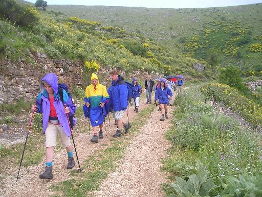 Göttervater Zeus jedoch hegte einen Groll gegen uns Fremdlinge: unvermittelt liess er Gewitterwolken aufziehen, schleuderte ohne Vorwarnung einen furchterregenden Blitz in grosse Nähe zu uns und schwang dabei gewaltig seinen Donnerkeil. Dies jagte uns einen grossen Schrecken ein: einige vollführten fast einen Salto. Zeus sandte zur Untermauerung seines Grolls in kurzer Folge noch etwa drei bis vier weitere Blitze mit entsprechendem Getöse gegen uns, und so waren wir alle bestrebt so rasch wie nur möglich das nahe und heute fast verlassene Dorf Mengoulas zu erreichen, wo wir etwas angstvoll in einem alten Turmgemäuer Schutz suchten. Glücklicherweise lenkten Zeus aber bald dringendere Geschäfte ab, wahrscheinlich Frauen, und so liess er uns bald wieder zufrieden, das Gewitter verzog sich wieder so rasch wie es gekommen war, und wir konnten weiterziehen. |