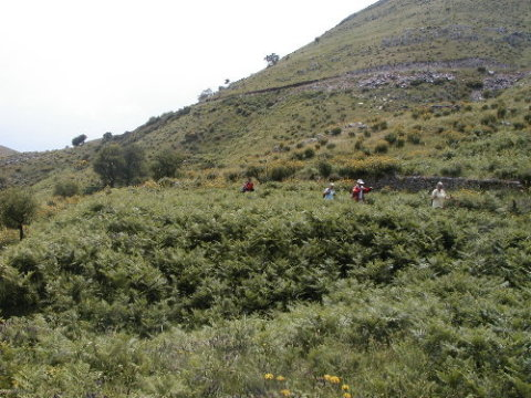 Jetzt aber wurde es wieder ernst. Ein Steinhäufchen am Wegrand zeigte den Einstieg zu einem Pfad, den man kaum erkennen konnte. Auch im Buch stand, der Pfad sei schwierig zu erkennen. Durch dichtes Farngestrüpp suchten wir den kaum sichtbaren Pfad, einigen nützlichen Anweisungen im Buch wie “Baum ansteuern” (welchen?), “kleines Ruinengemäuer rechts”, “Steingemäuer entlangehen” (welchem?), “Gully linke Seite” (welches Gully?) nachfolgend. Pfadfindertum war im dichten Gestrüpp gefragt. Ein Schuh blieb in einer Steinspalte hängen und ging fast verloren. Schliesslich wurde der Weg aber doch wieder klarer und wir kamen, auf der linken Seite eines Gully absteigend, auf ein Strässchen hinunter. Old Perithia, heute nahezu verlassen, war nah. Die nicht mehr genutzte Kirche wie auch andere verfallende einst stattliche Häuser erzeugten beim Durchwandern ein leicht beklemmendes Gefühl. Aber halt, es gab auch ein kleines Baugerüst: kehren einige Talbewohner wieder zurück in das Bergdorf, wenn vielleicht auch nur zum Wochenendaufenthalt? |