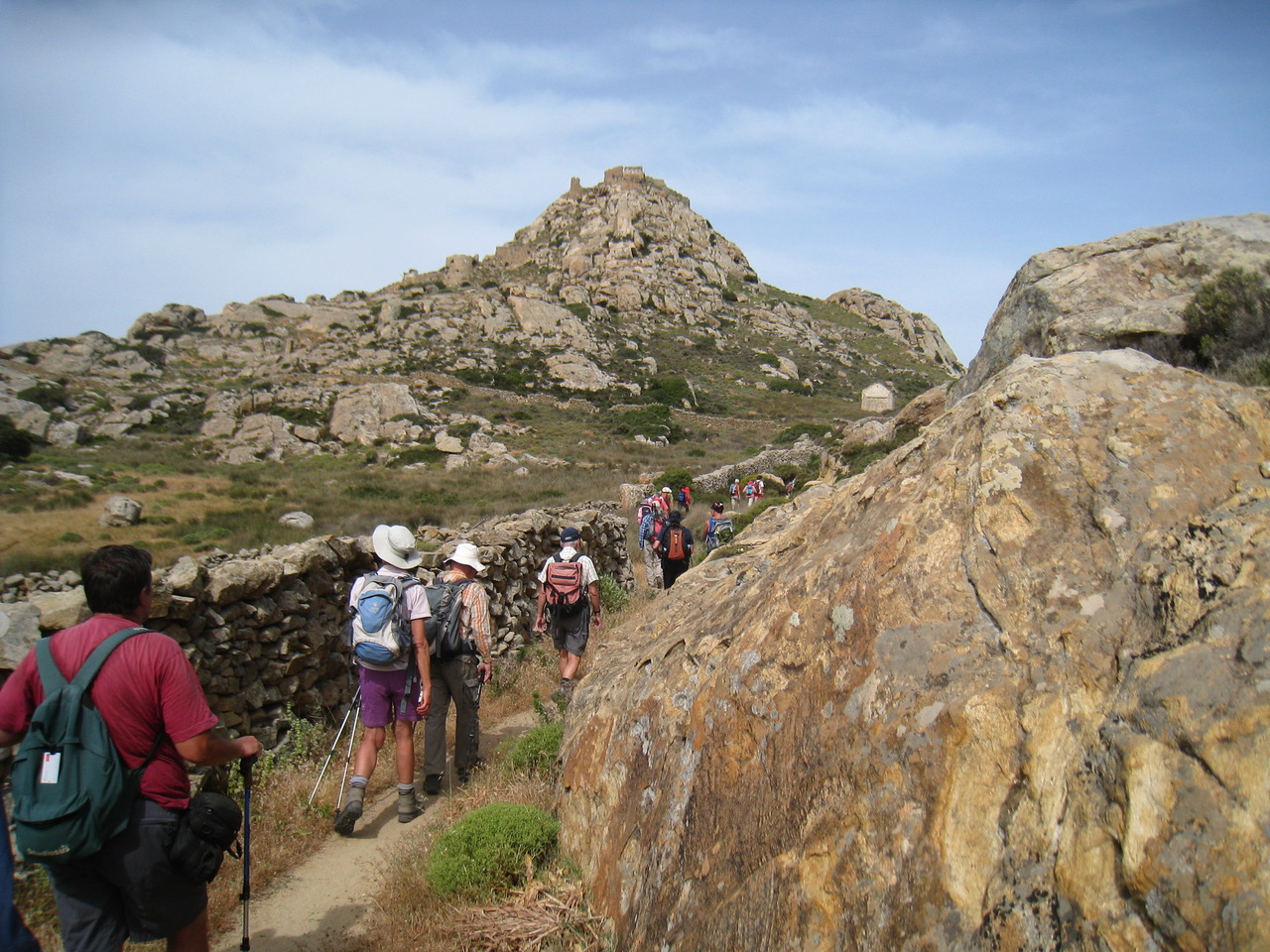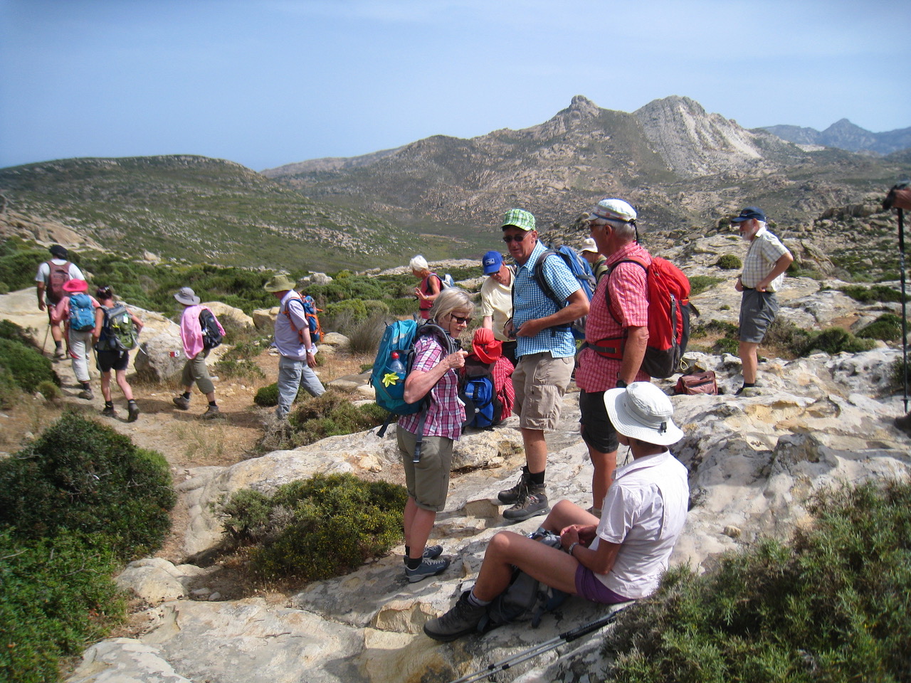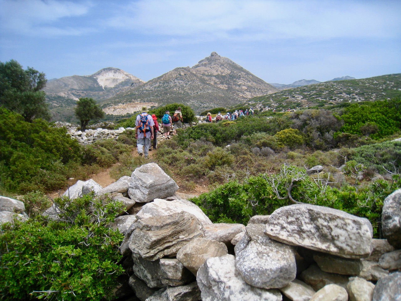 Durch das Dorf wandern wir durch eine Art von Hohlweg und befinden uns bald in einer typischen griechischen, zeitlosen Landschaft, wo zwischen Olivenhainen und Felsbrocken die Schafe grasen. Wahrscheinlich sah es vor sehr langer Zeit gleich aus wie heute. Wir werden später auf der Wanderung noch die Abbildern der Menschen aus ferner Zeit kennenlernen. In Tsikalarió kommen wir an einem Brunnen vorbei, wo früher die Wäsche gewaschen wurde.Unser Weg führt jetzt zwischen Felsen und Ziegenmauern hindurch und schon bald sieht man oben auf einem Gipfel das Apano Kástro, eine Festungsruine. Dieser Wegabschnitt ist sehr malerisch und gefällt mir sehr gut. An einer Steinmauer entlang steigen wir auf einen Pass, der zu Füssen der Ruine liegt. Hier gibt es einen Trinkhalt und Informationen zur bewegten Geschichte. |