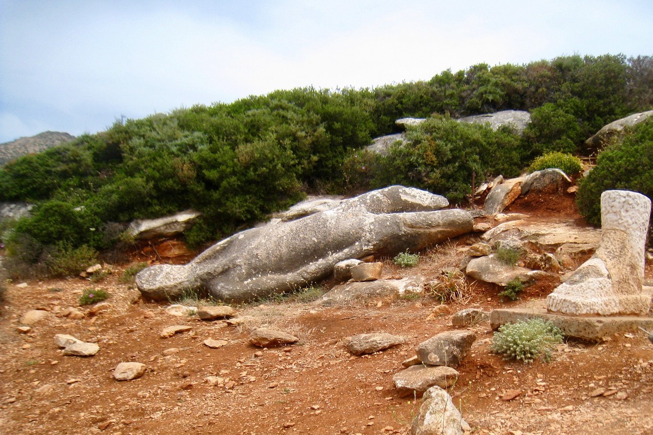 Dann geht es weiter hinunter zu einem Bach, der ein rarer Anblick ist in Naxos. Wir folgen ihm eine Weile, dann steigt der Weg wieder an und wir gelangen in die mit vielen Mauern durchsetzte Landschaft, durch welche wir dann zum berühmten Kouro von Flerio gelangen, der seit Jahrhunderten hier liegt und nun von unzähligen Touristen besucht wird. Ein Fuss ist abgebrochen, ein Grund warum die Statue an diesem Ort liegengelassen wurde. |