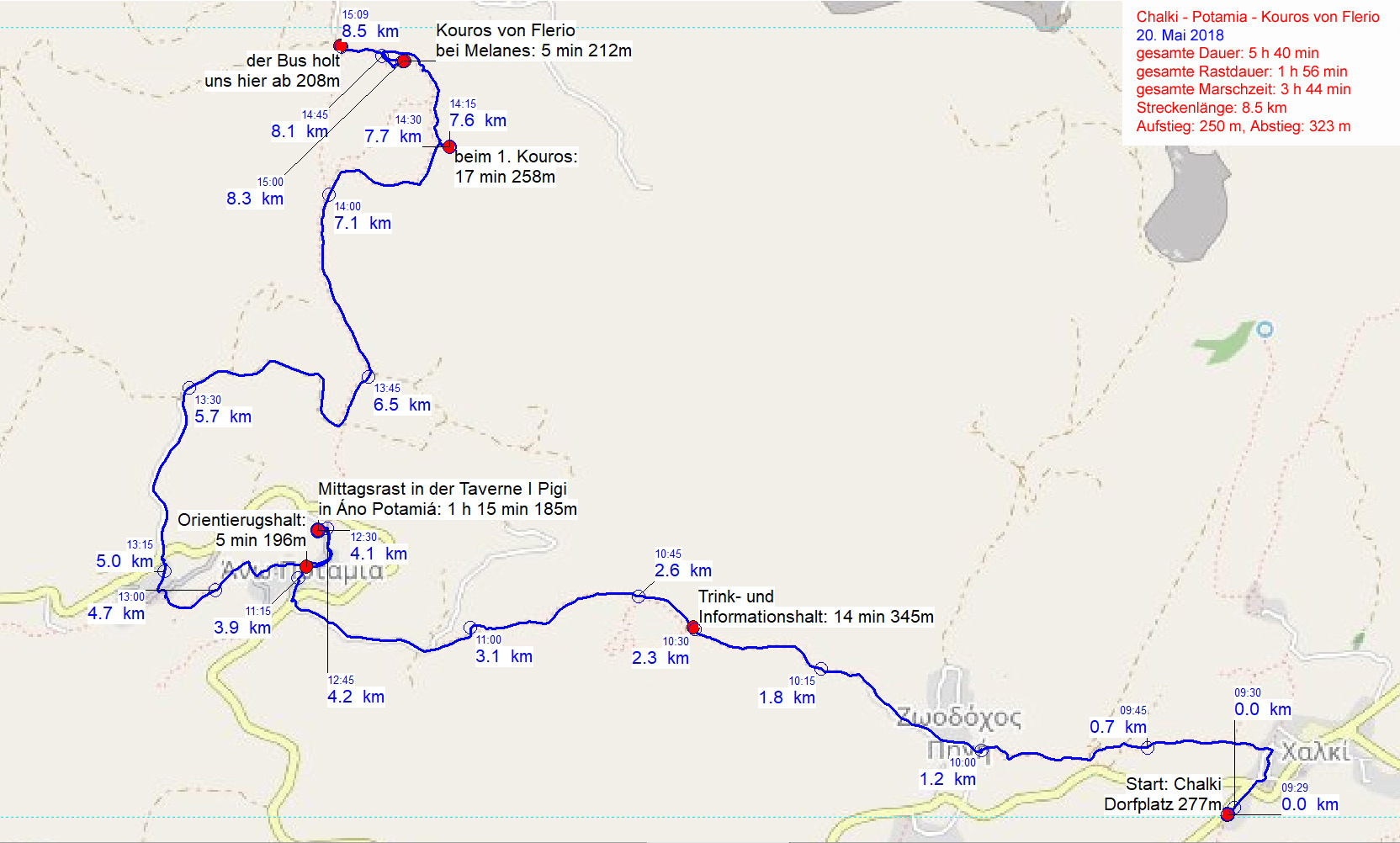 20.Mai, von Chalki über das Apano-Kastro nach Potamia und zu den Kouro von Flerio
