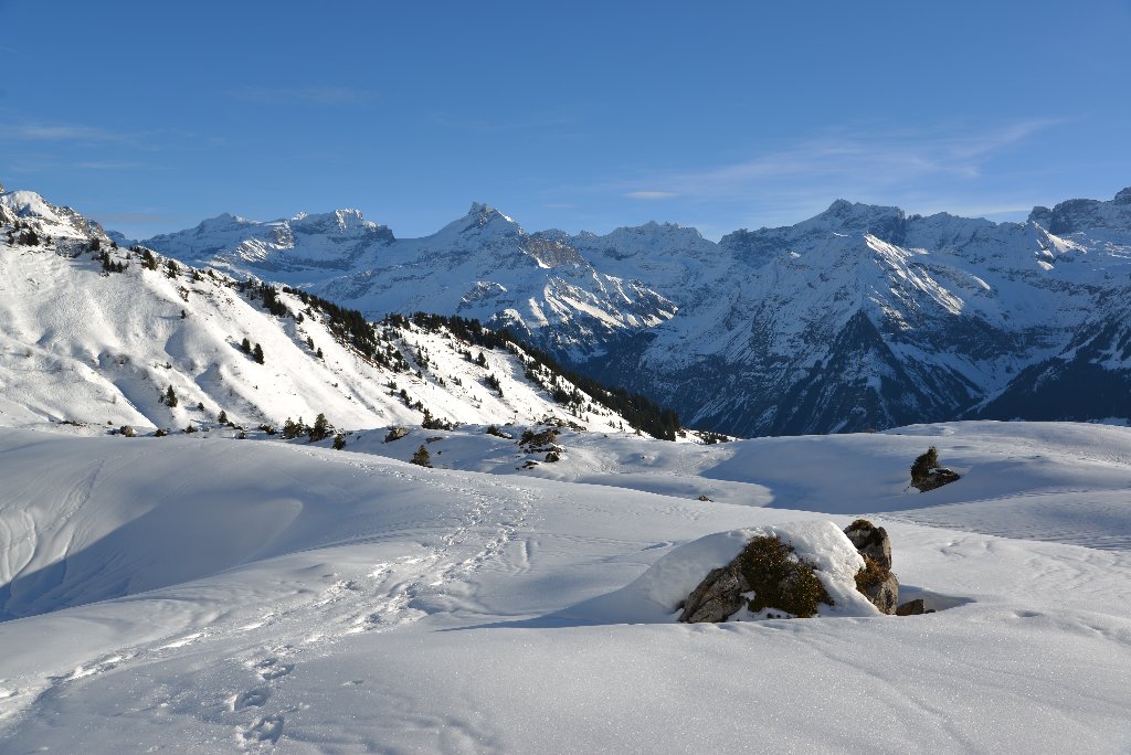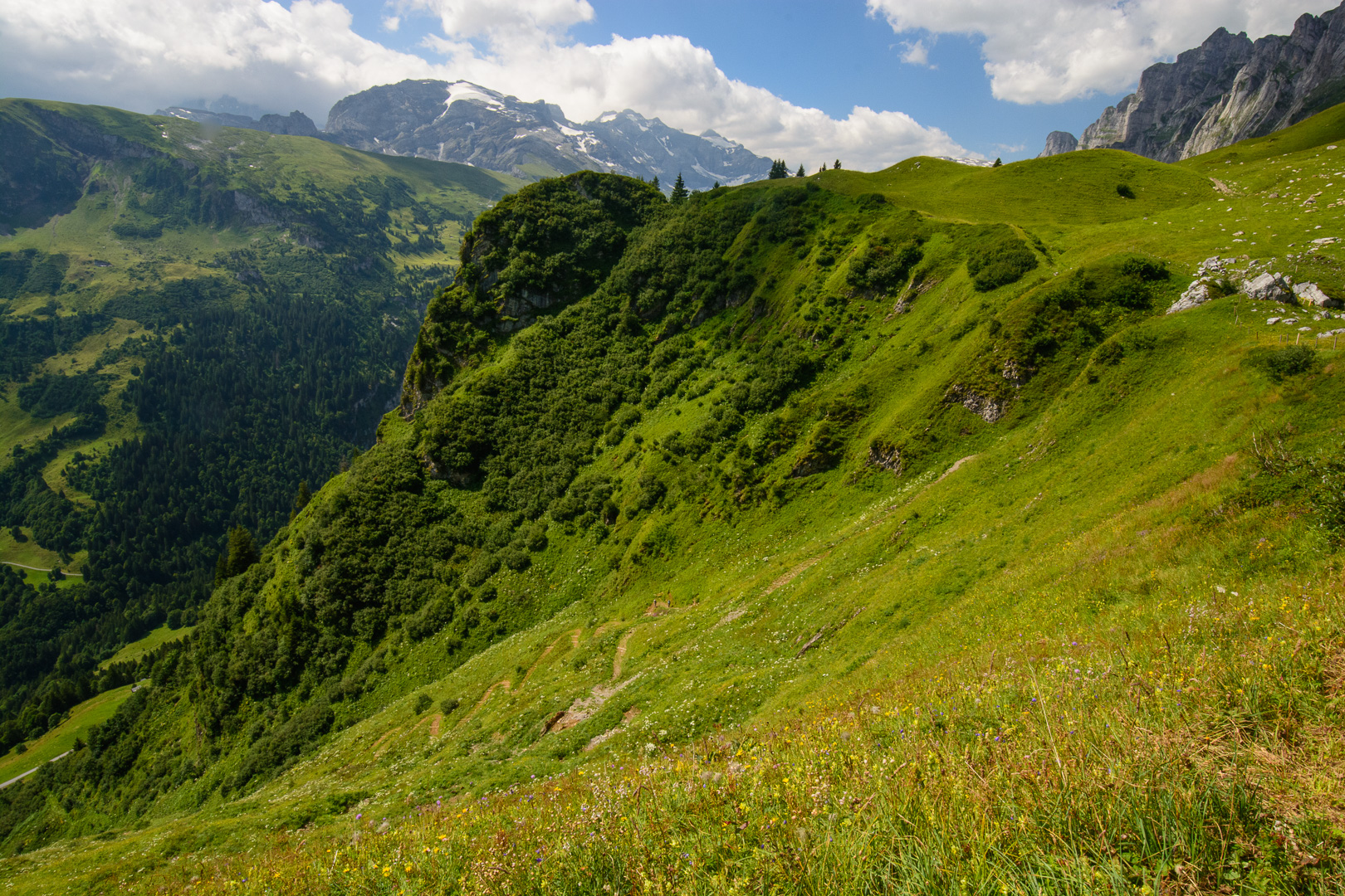 Oberhalb der Alp können wir uns auf einer Bank ausruhen und vom kleinen Brunnen mit Quellwasser nebendran trinken. Von hier aus hat man einen schönen Ausblick auf die Alp bis ins Tal. Wir sehen auch den Fels von welchem 1991 der Felssturz abging und ca. 15Mio. m3 Fels zu Tal stürzten. |
