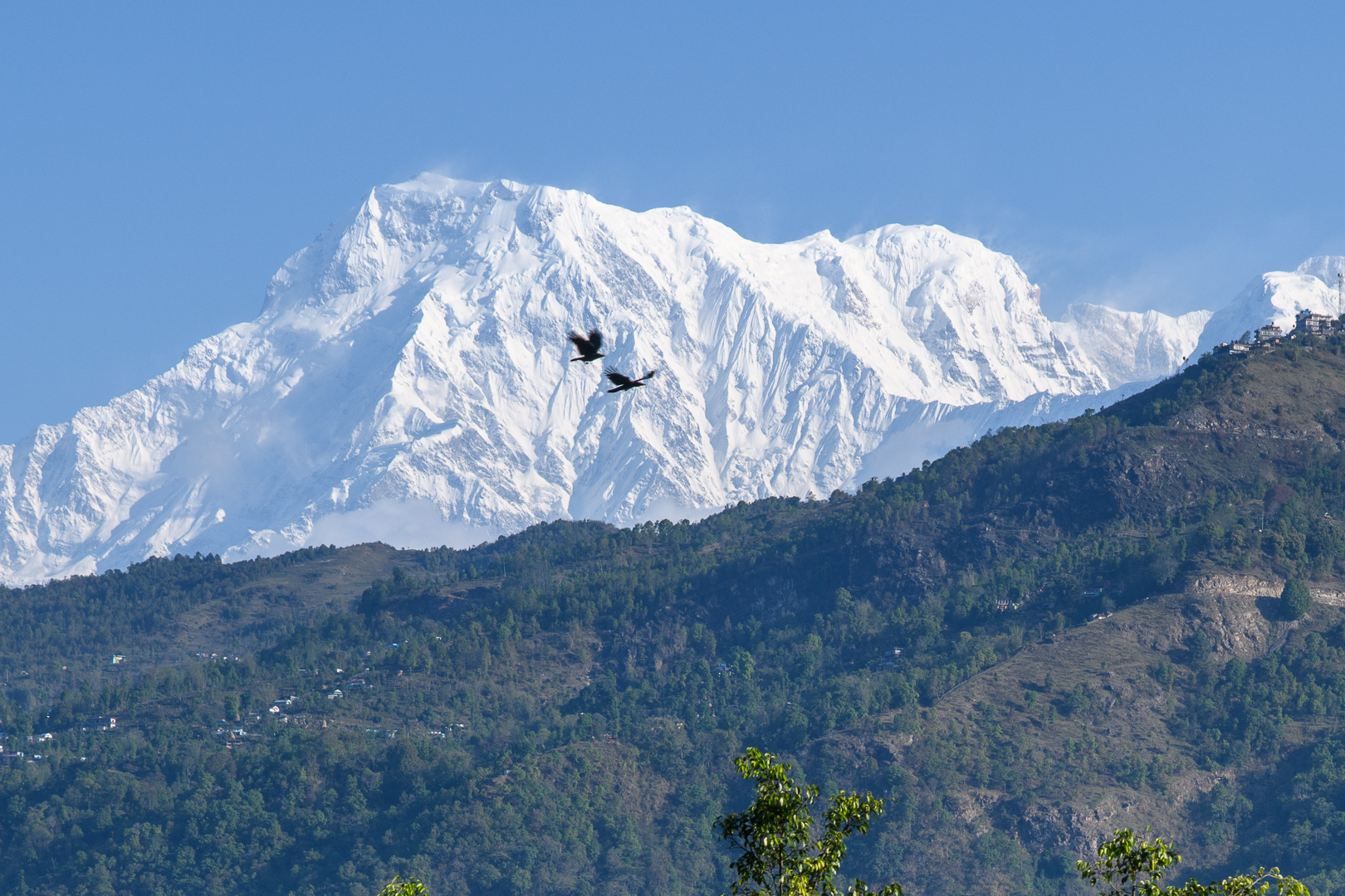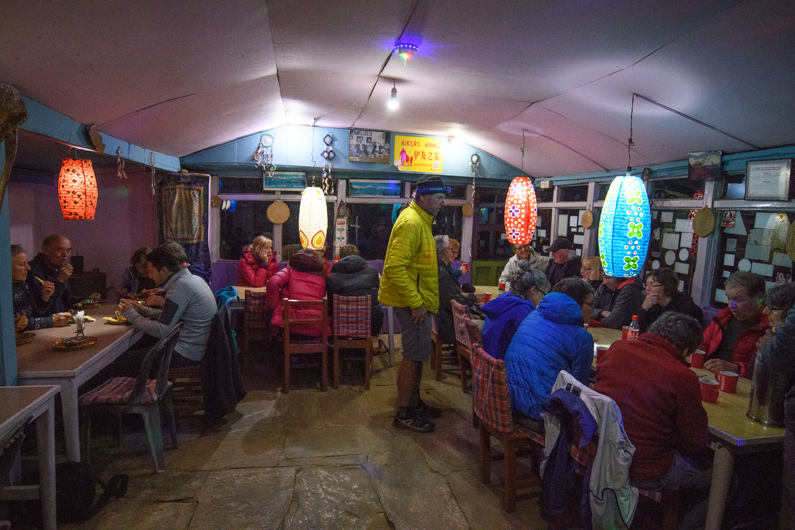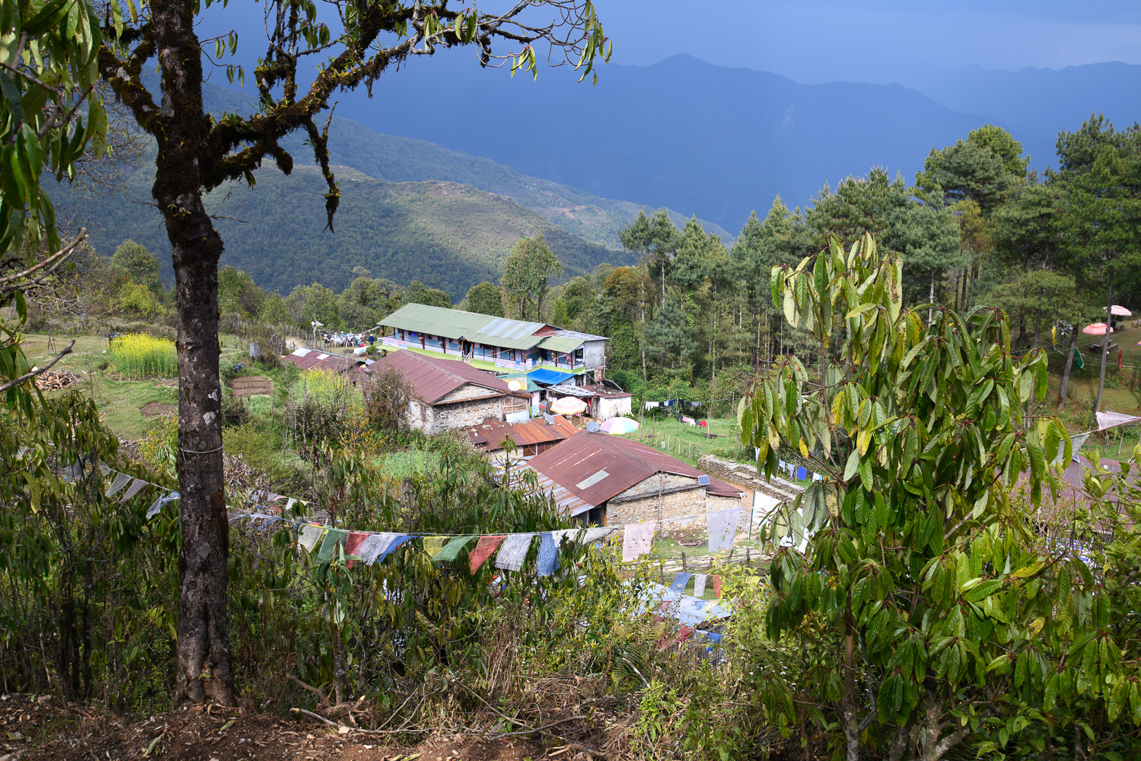 20 years I had organised a similar trek but including the Annapurna Sanctuary. At that time we walked along part of this ridge but now it is all a paved road. After leaving the road the route took us with various downs and ups through forest and some fields to a wayside restaurant at Damphus 1650m for lunch and soon afterwards we reached our overnight destination, Pothana 1900m. This was a village of tourist lodges typical of several which we would be visiting. There was still time for a short excursion up a hill behind the lodge where there were a few Rhododendron still in bloom to be seen. The mountains were however no longer visible and the sky looked quite threatening. We were safely inside again when a storm started, but the sky cleared again in time for us to see the sunset. Machapuchre looked particularly impressive against the darkening sky. It was actually New Year’s day according to the Nepalese calendar and the dining room was decorated with large colourful lanterns.