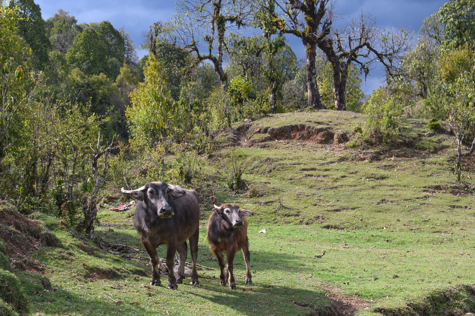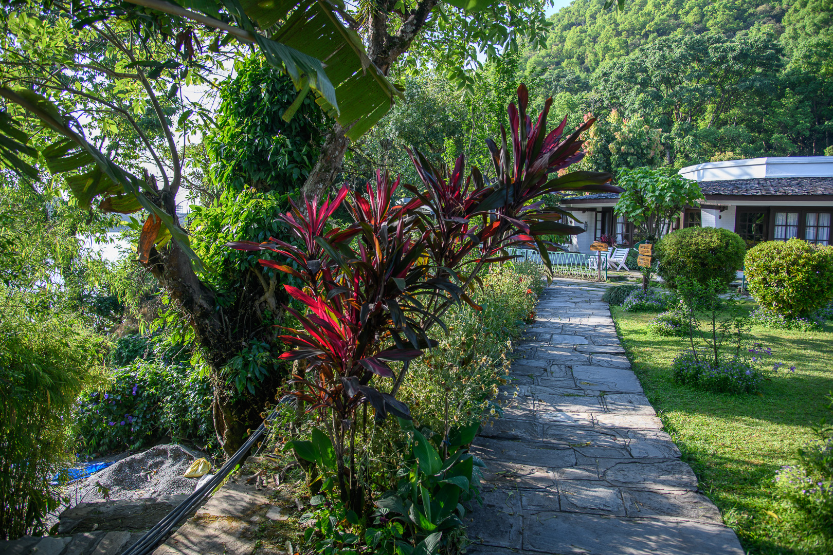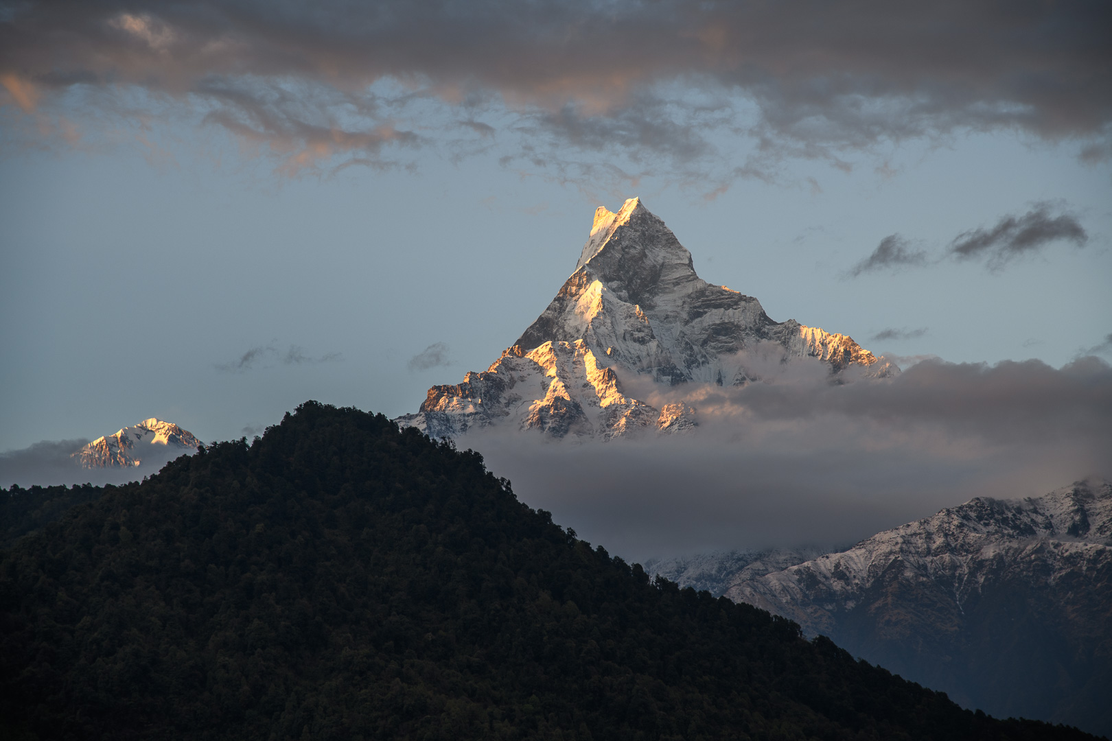 20 years I had organised a similar trek but including the Annapurna Sanctuary. At that time we walked along part of this ridge but now it is all a paved road. After leaving the road the route took us with various downs and ups through forest and some fields to a wayside restaurant at Damphus 1650m for lunch and soon afterwards we reached our overnight destination, Pothana 1900m. This was a village of tourist lodges typical of several which we would be visiting. There was still time for a short excursion up a hill behind the lodge where there were a few Rhododendron still in bloom to be seen. The mountains were however no longer visible and the sky looked quite threatening. We were safely inside again when a storm started, but the sky cleared again in time for us to see the sunset. Machapuchre looked particularly impressive against the darkening sky. It was actually New Year’s day according to the Nepalese calendar and the dining room was decorated with large colourful lanterns.