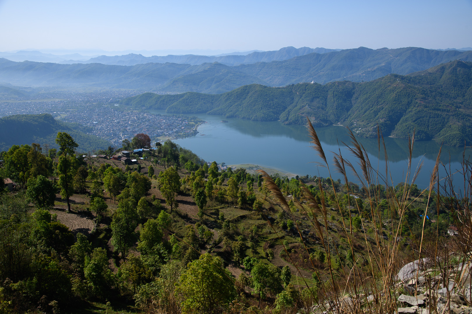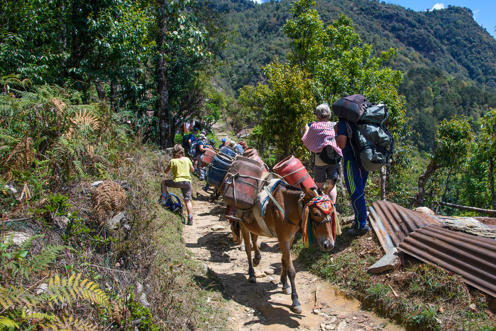 We were out before dawn at 5.45 to see the views of Annapurna and Machapuchre (Fishtail Peak) across the water for which the Fish Tail Lodge has a reputation. The weather was perfect for it – clear and soon quite warm so that we could breakfast outside by the lake at 7.00. We had repacked our luggage taking only what we needed for the trek in bags with us and leaving our cases in the hotel. At 8.15 everything had been ferried with the raft across the narrow stretch of water to the road and packed onto the roof of our minibus. A very steep road brought us up a ridge above the lake giving fine views and this was followed for some distance until the bus started making strange noises, lost power and ground to a halt. Fortunately we were only a few hundred meters from Kande, the starting point of the trek, so we set off from there, leaving the bus to its fate. It was a good job that this had not happened the day before!