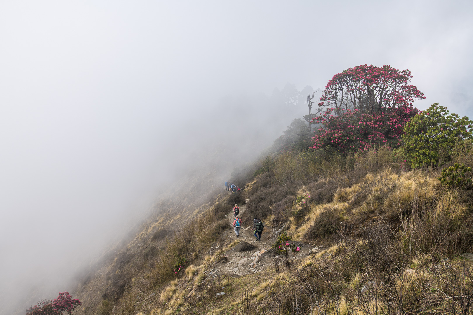 This was the first of the two longest trekking days, so we again made an early start at 7.45. A steep descent with many high steps down to a small river followed by an equally steep but much shorter ascent brought us to the settlement of Banthanti 2520m where we had a short rest and a welcome drink. Then there was a long climb through an impressive river gorge with high cliffs on each side. Flowering rhododendrons became more numerous as we gained height. It was mostly sunny but at times the mist swirled in and reminded me of films I have seen of the Himalayan nature. We reached Deurali 2987m, which consists only of tourist restaurants, for an enjoyable lunch surrounded by spectacular rhododendron displays.