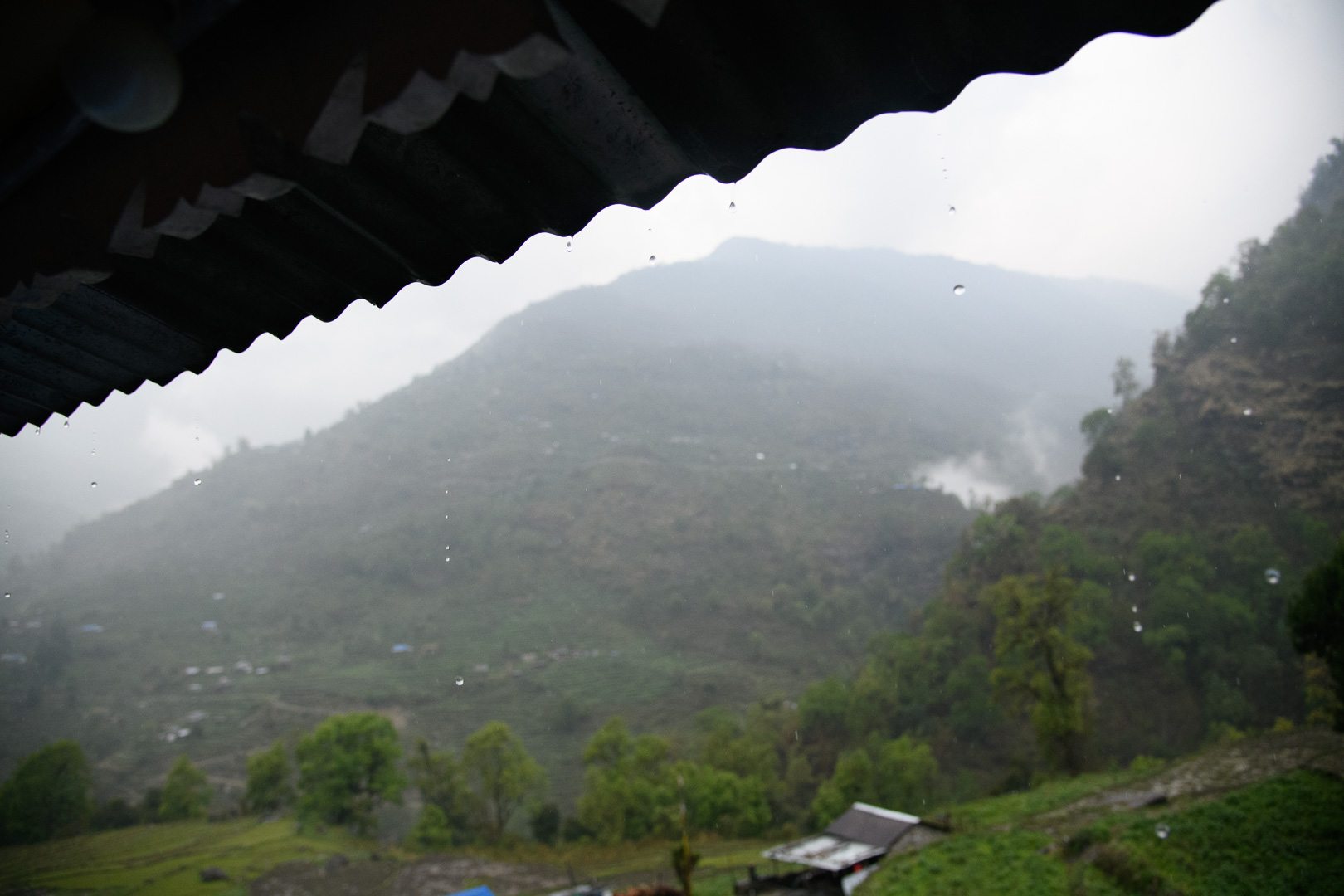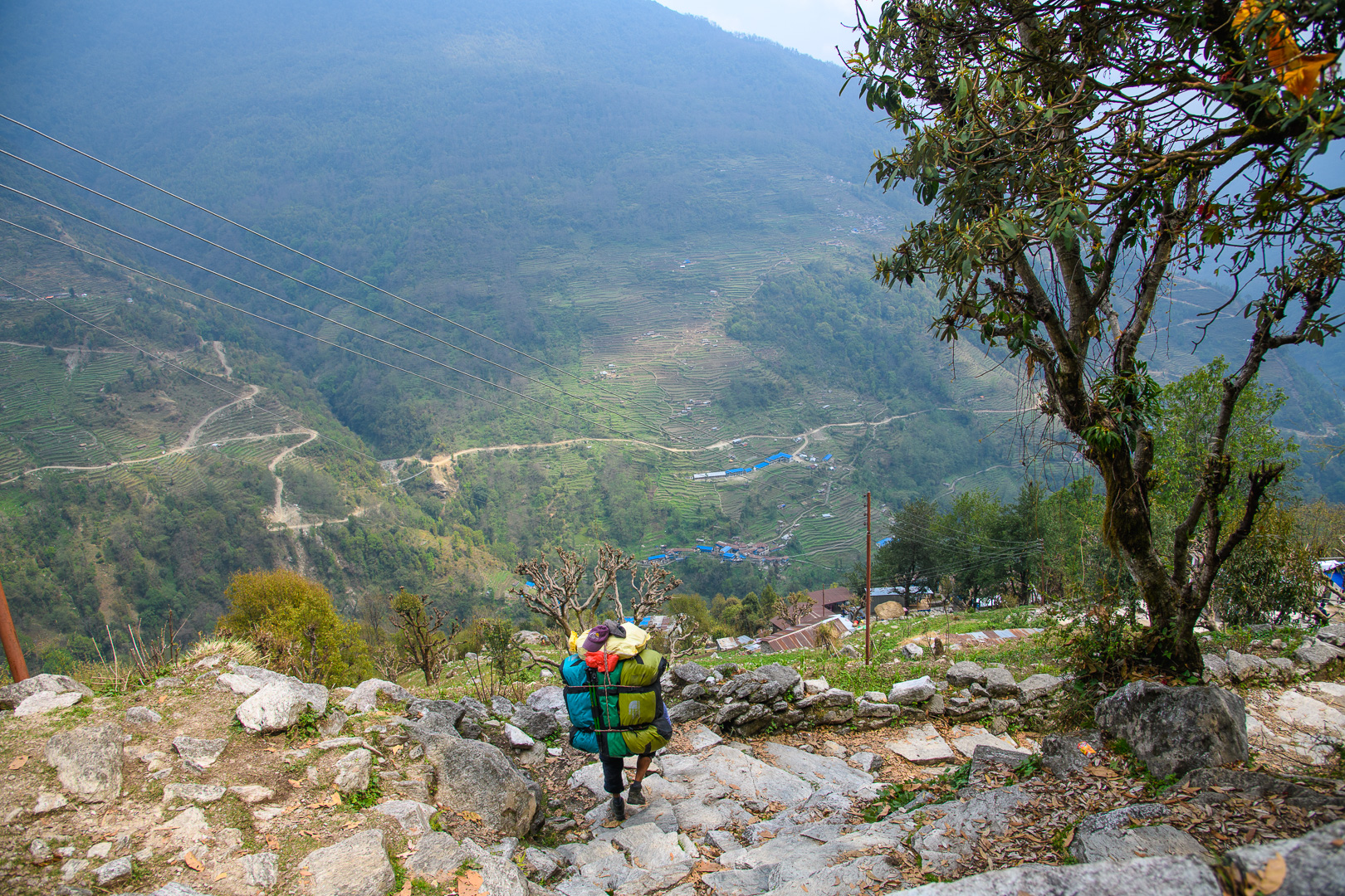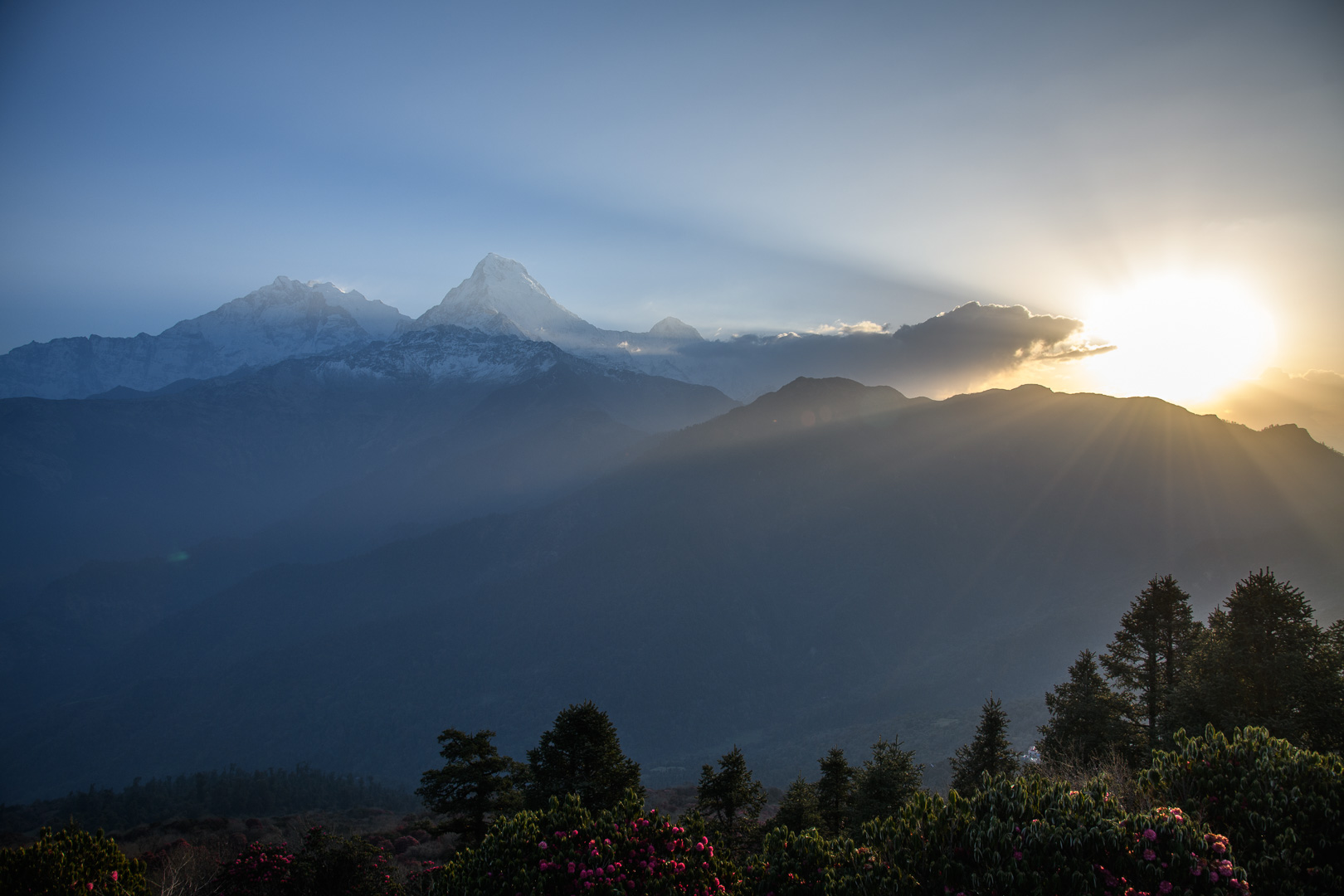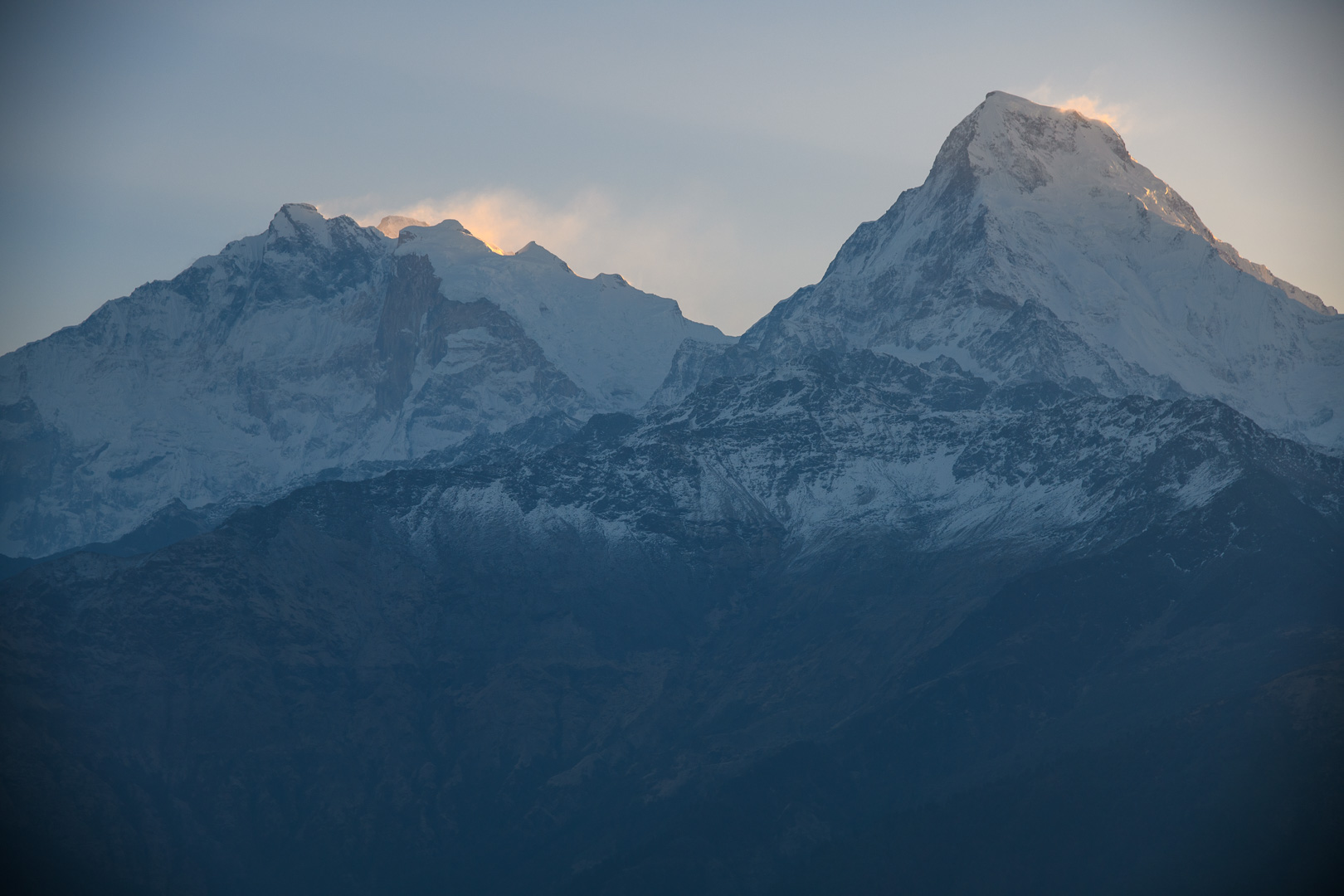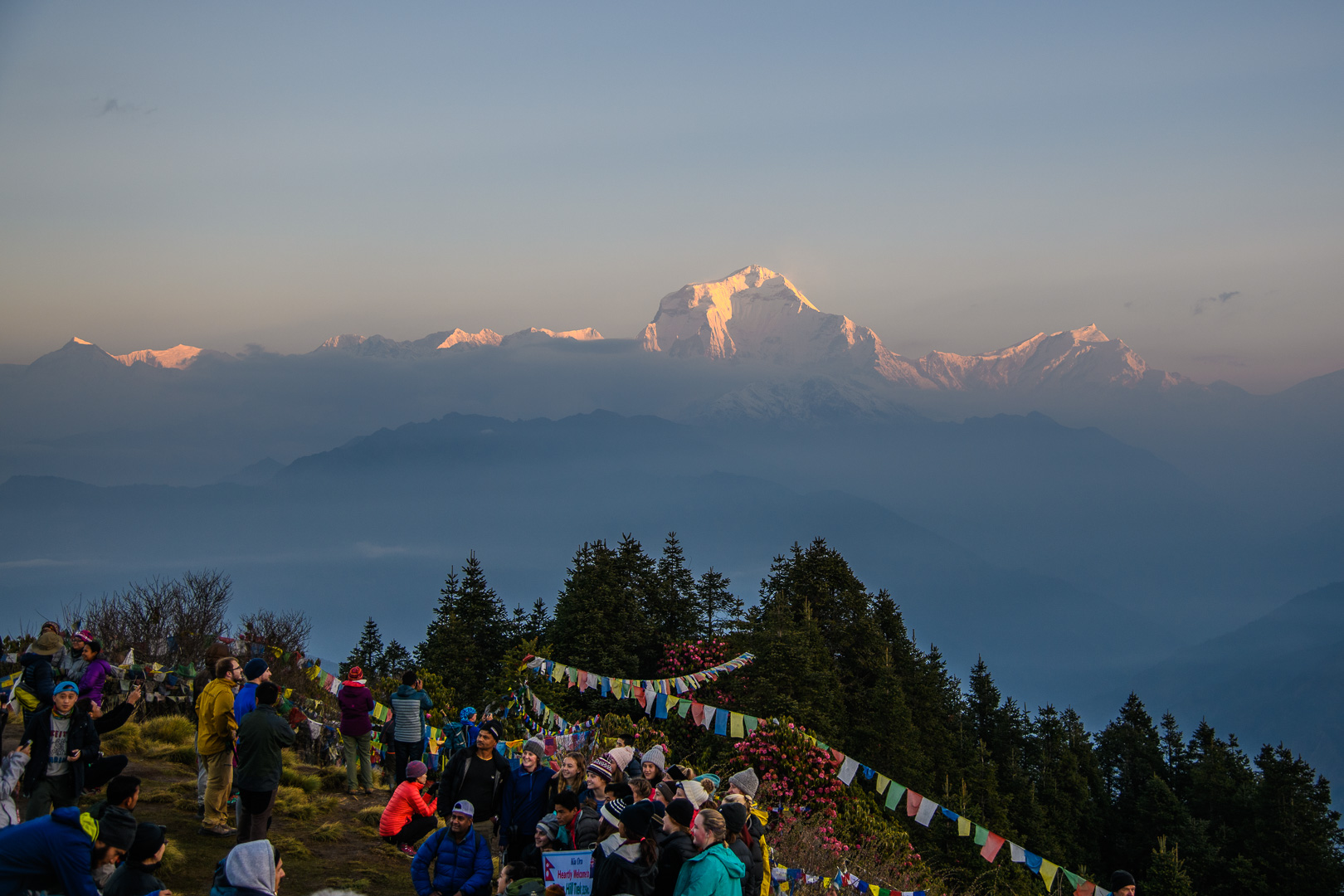 This was to be our longest day, starting at 4.45am in order to reach the summit of Poon Hill 3193m by dawn. This seemed optimistic to me but we plodded up the obligatory steps in the dark with the aid of head-torches. We just made it arriving at the already well populated summit just in time. I was able to secure a spot on the corner of a look-out point, together with another photographer, where we commanded a full view of the stupendous panorama from Dhaulagiri to Annapurna. He was from Canada, very tall and using a substantial monopod, so I set-up one of my walking-poles which, together with a ball-head, can be used as a monopod. Our group guide found me and kindly brought me a hot drink.