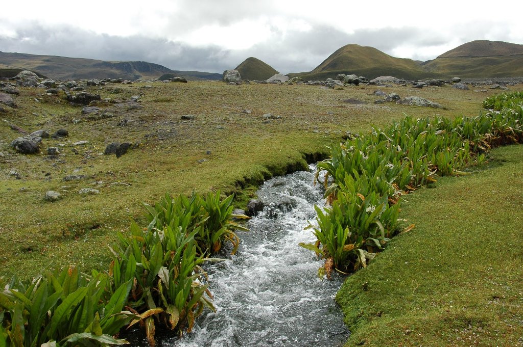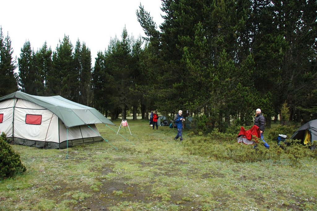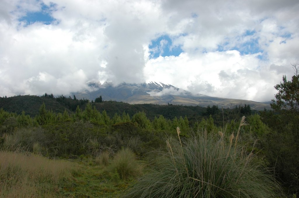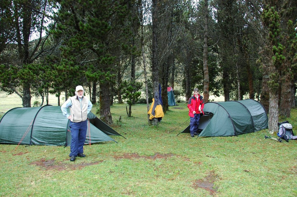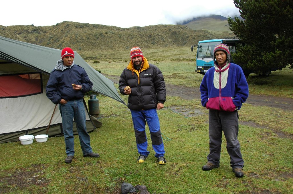 So we went camping anyway in the afternoon, but it was pretty wet and the lodge would have been better. It was about an hour’s drive into and through the park from Hacienda Cienega in an old somewhat clapped-out, but with four-wheel drive, bus which we now had as transport. At least there was plenty of space and it seemed to be able to climb the mountains remarkably well. On arrival we walked to a nearby lake and got quite wet from the heavy rain in the process but at least we saw some lapwings and their young at close quarters – they attacked us. Cotopaxi was also at close quarters but invisible in the cloud. Back at the camp it was all organised similarly to what I had experienced on Kilimanjaro or in Nepal except for the bus being there. We were the only campers at the site.