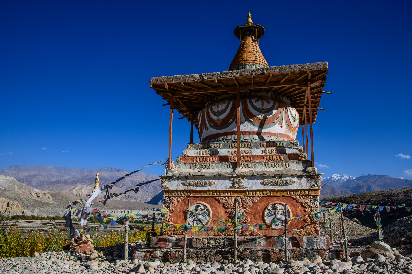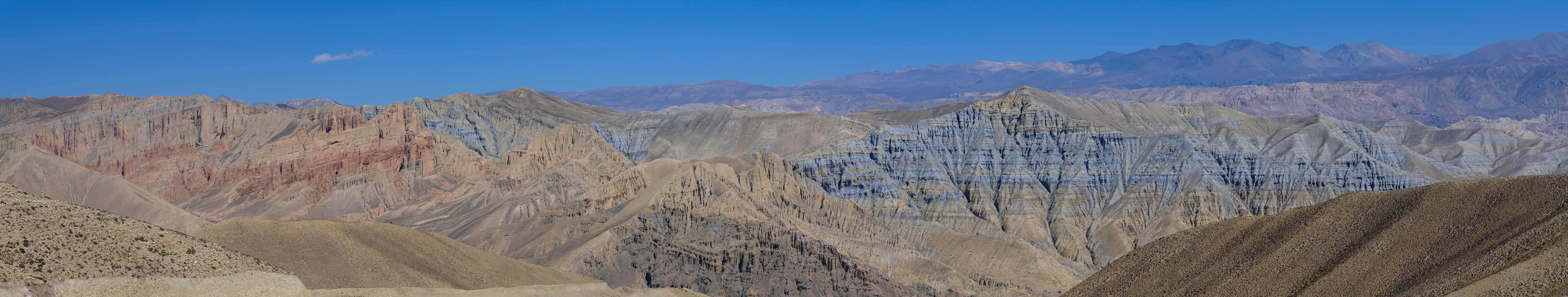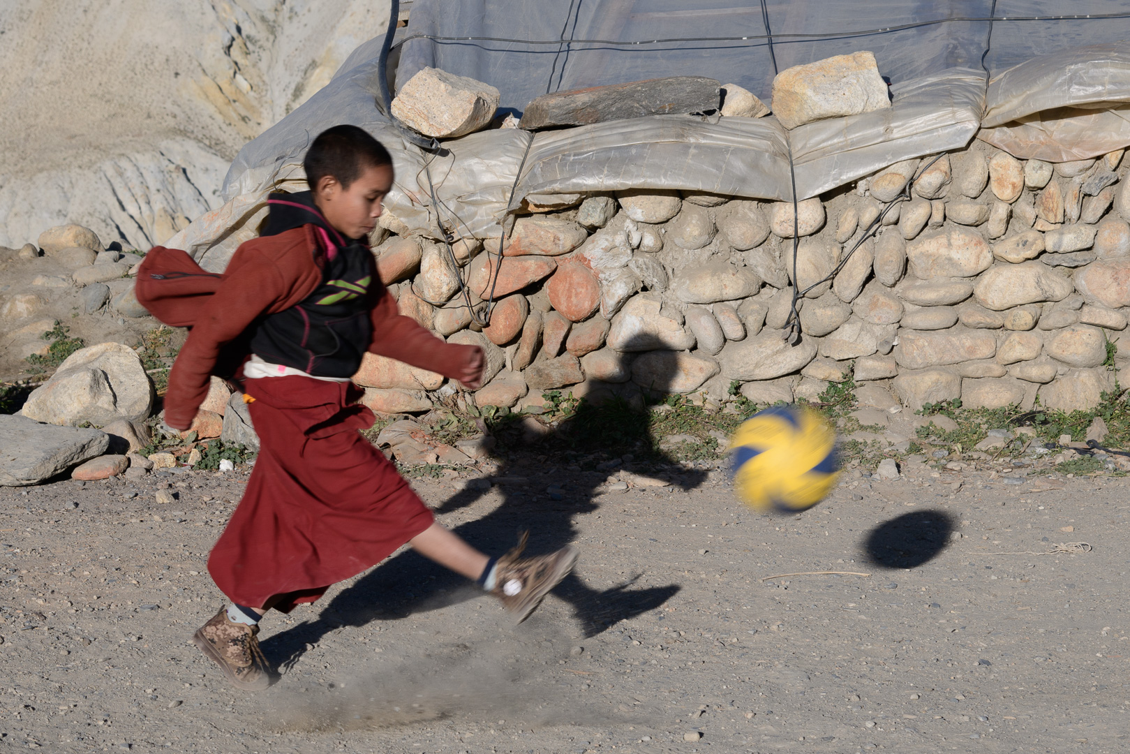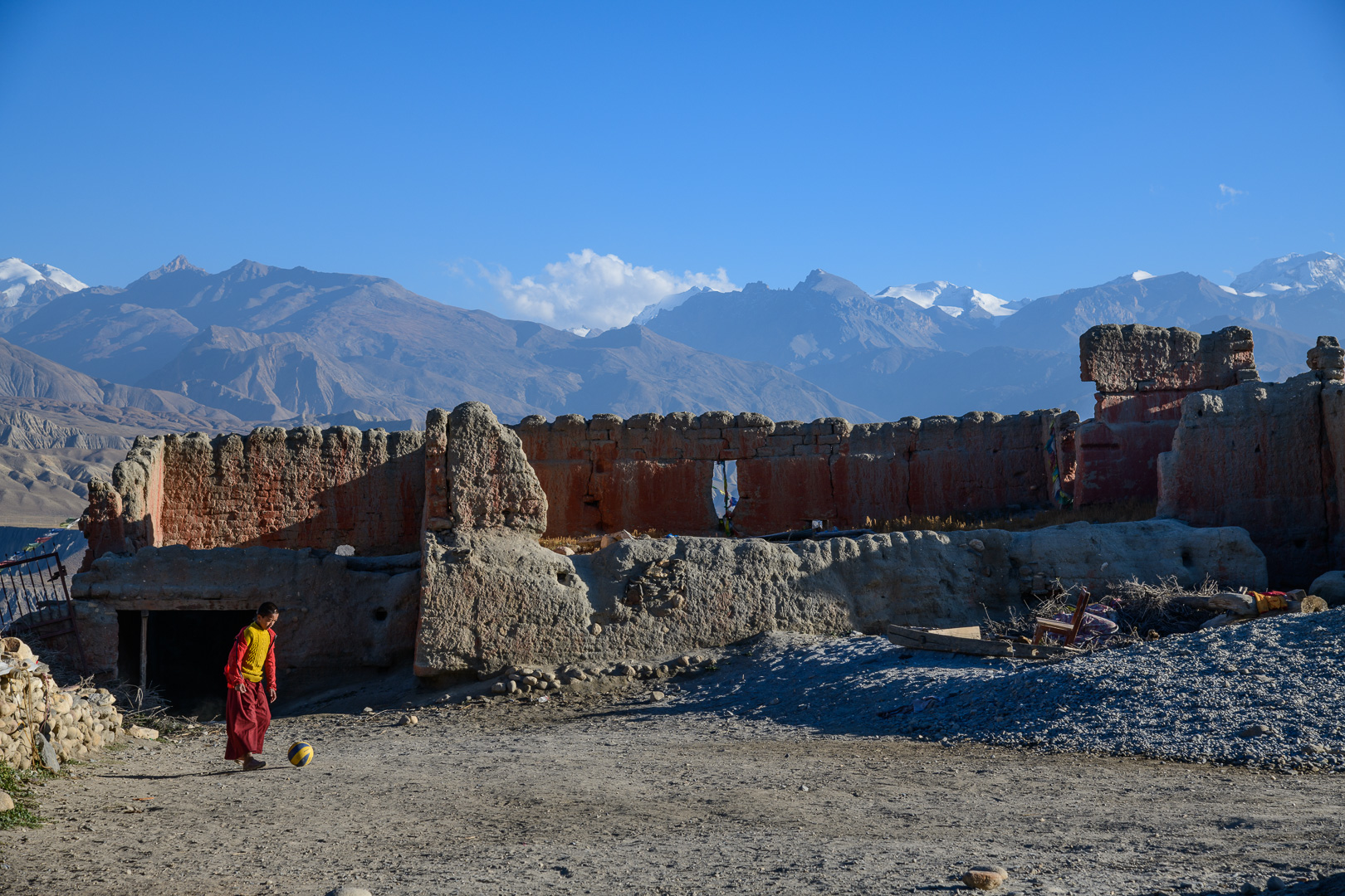A route change was again necessary to avoid road works. This time making the route a little shorter rather than longer by missing out the lower village of Gheling. The highest point of the day was the Nyi La 4020m which was followed after a long and not very interesting stretch by the Ghemi La 3765m. This area is known for the coloured rock formations around Dhakmar. Lunch was in the village of Ghemi and afterwards there would be a climb to another pass at 3870m. I opted again to go with the jeep to the top and then make the long gradual descent to Tsarang on foot. At 3435m we were then nearly back at the level of the nearby but not easily visible Kali Gandaki gorge. Arriving first I had time on my own to visit the famous 700 year old Ghompa (monastery) which is impressively situated on the edge of a gorge next to an ancient castle. It reminded me of the monastery schools which I had seen in Burma with the boys in their red robes playing football.