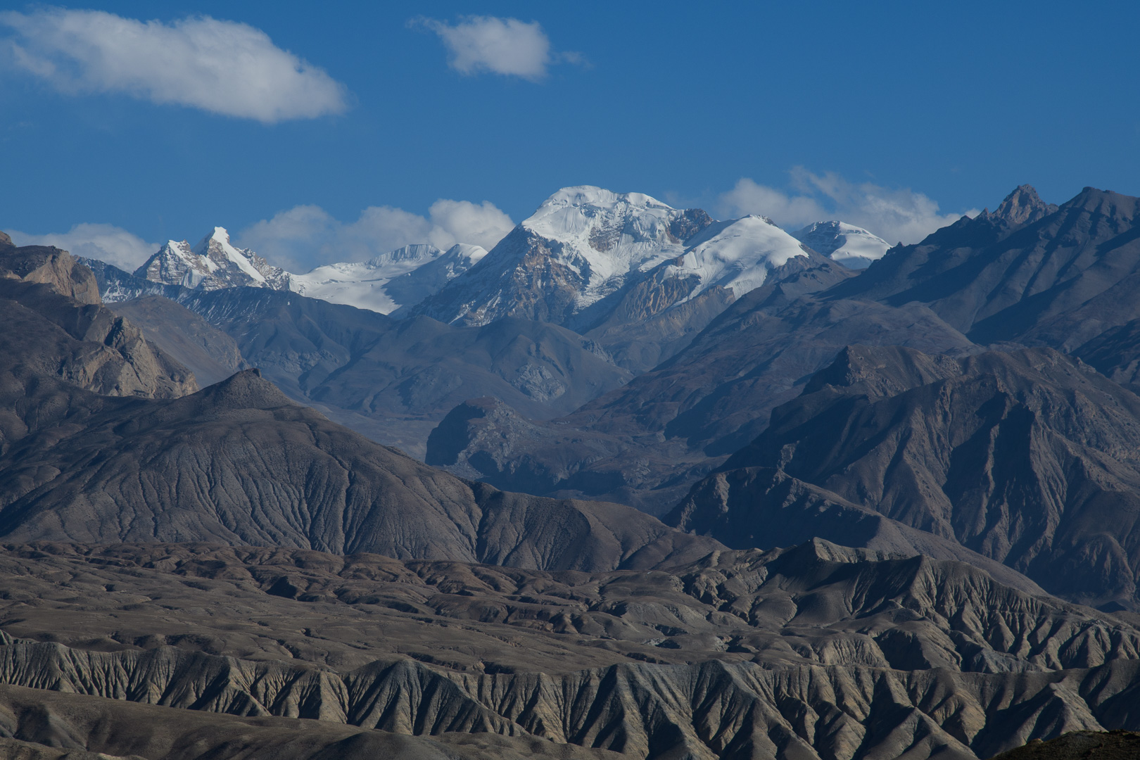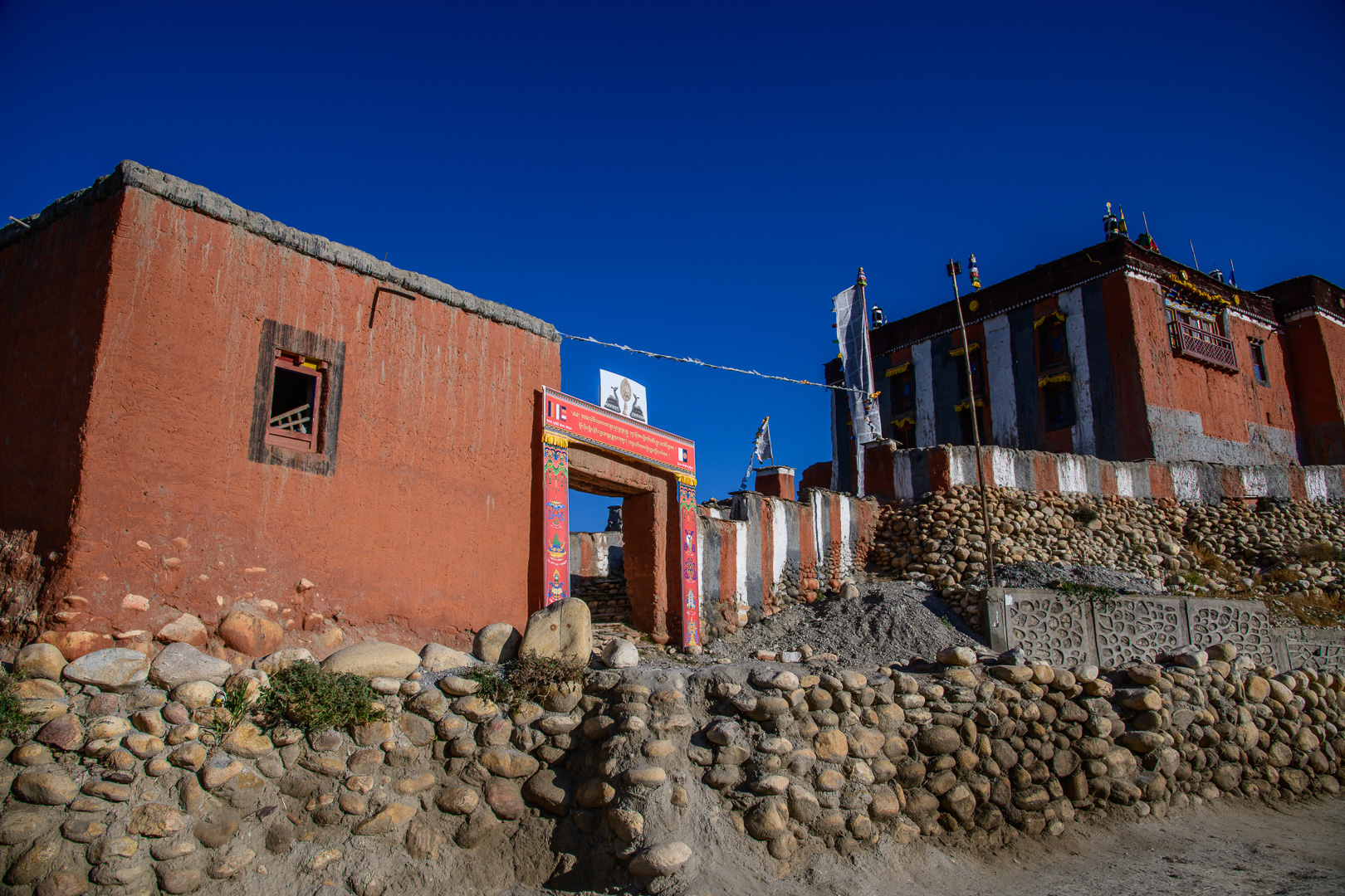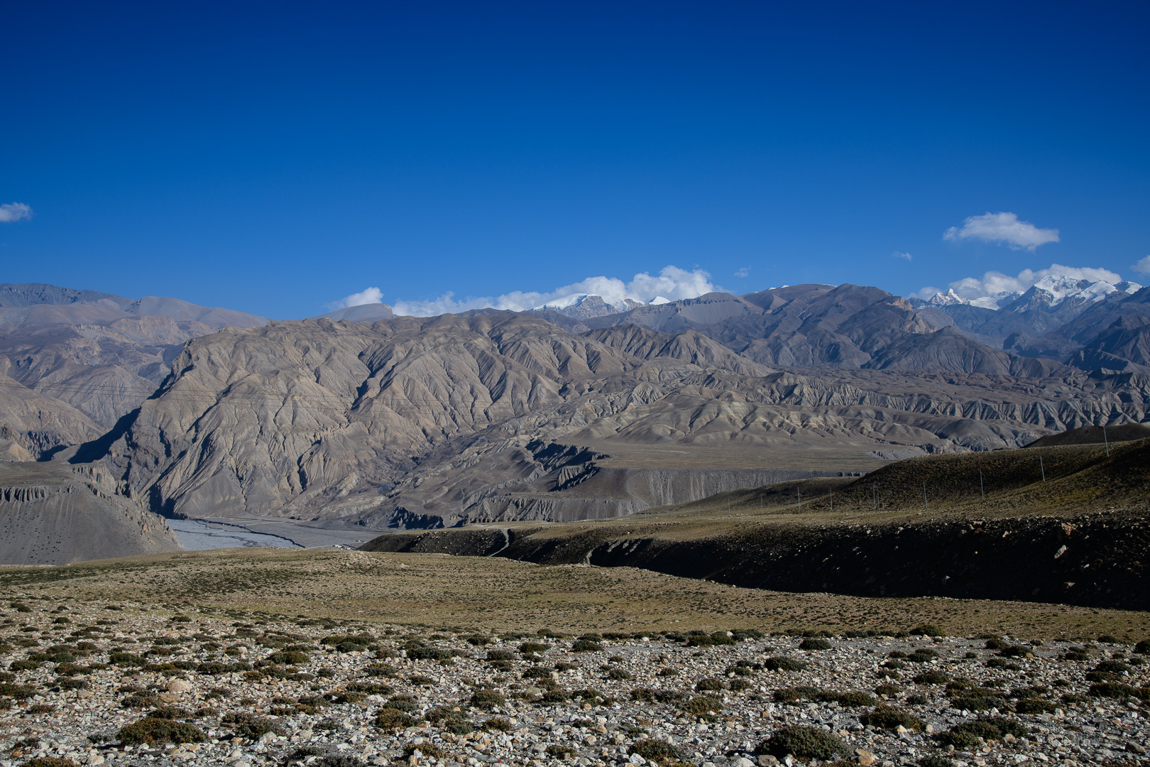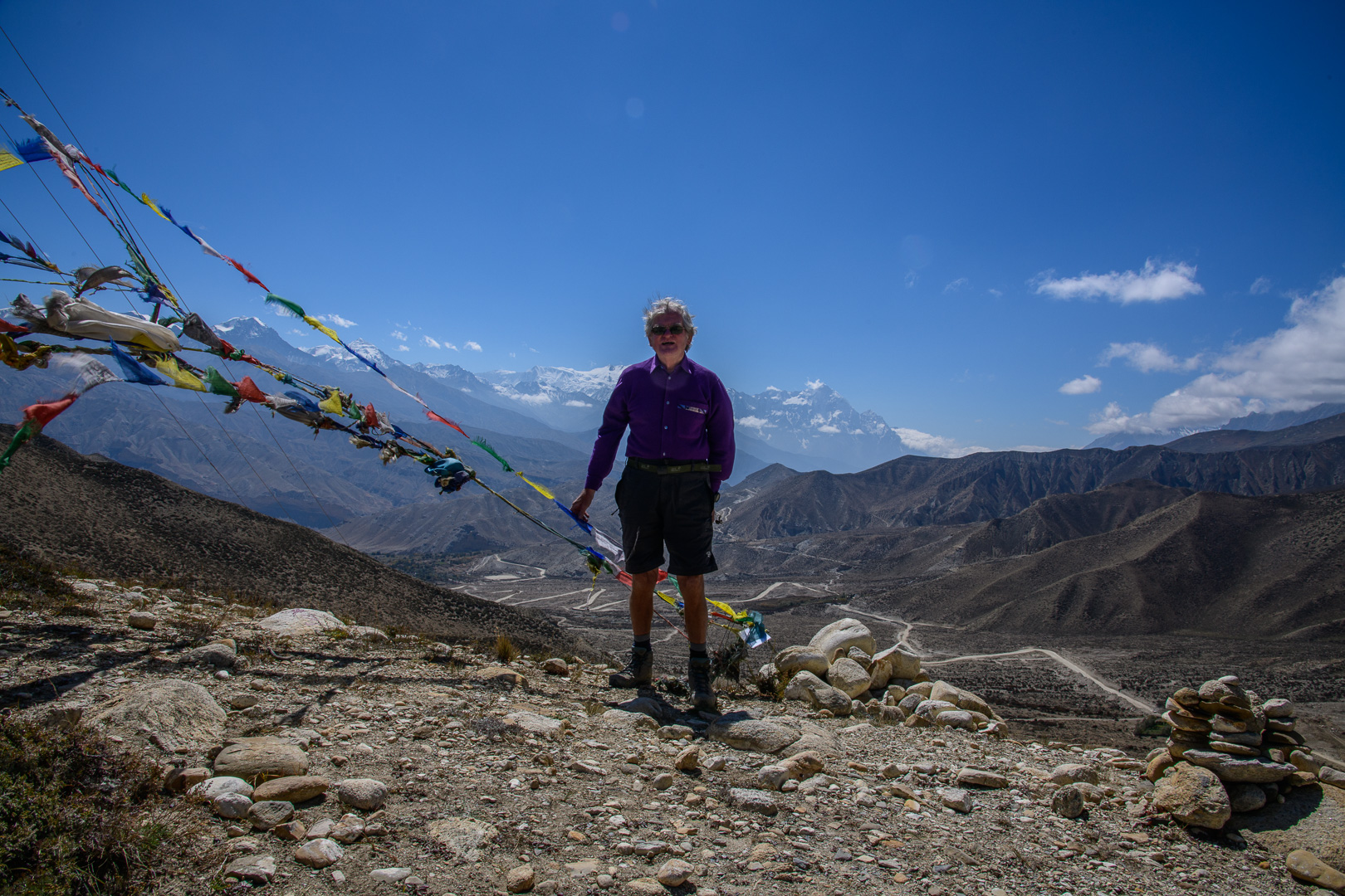 A route change was again necessary to avoid road works. This time making the route a little shorter rather than longer by missing out the lower village of Gheling. The highest point of the day was the Nyi La 4020m which was followed after a long and not very interesting stretch by the Ghemi La 3765m. This area is known for the coloured rock formations around Dhakmar. Lunch was in the village of Ghemi and afterwards there would be a climb to another pass at 3870m. I opted again to go with the jeep to the top and then make the long gradual descent to Tsarang on foot. At 3435m we were then nearly back at the level of the nearby but not easily visible Kali Gandaki gorge. Arriving first I had time on my own to visit the famous 700 year old Ghompa (monastery) which is impressively situated on the edge of a gorge next to an ancient castle. It reminded me of the monastery schools which I had seen in Burma with the boys in their red robes playing football.