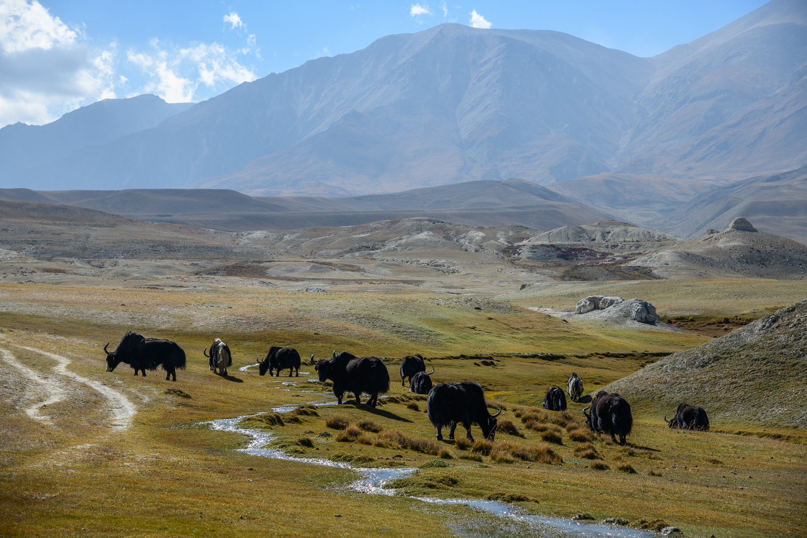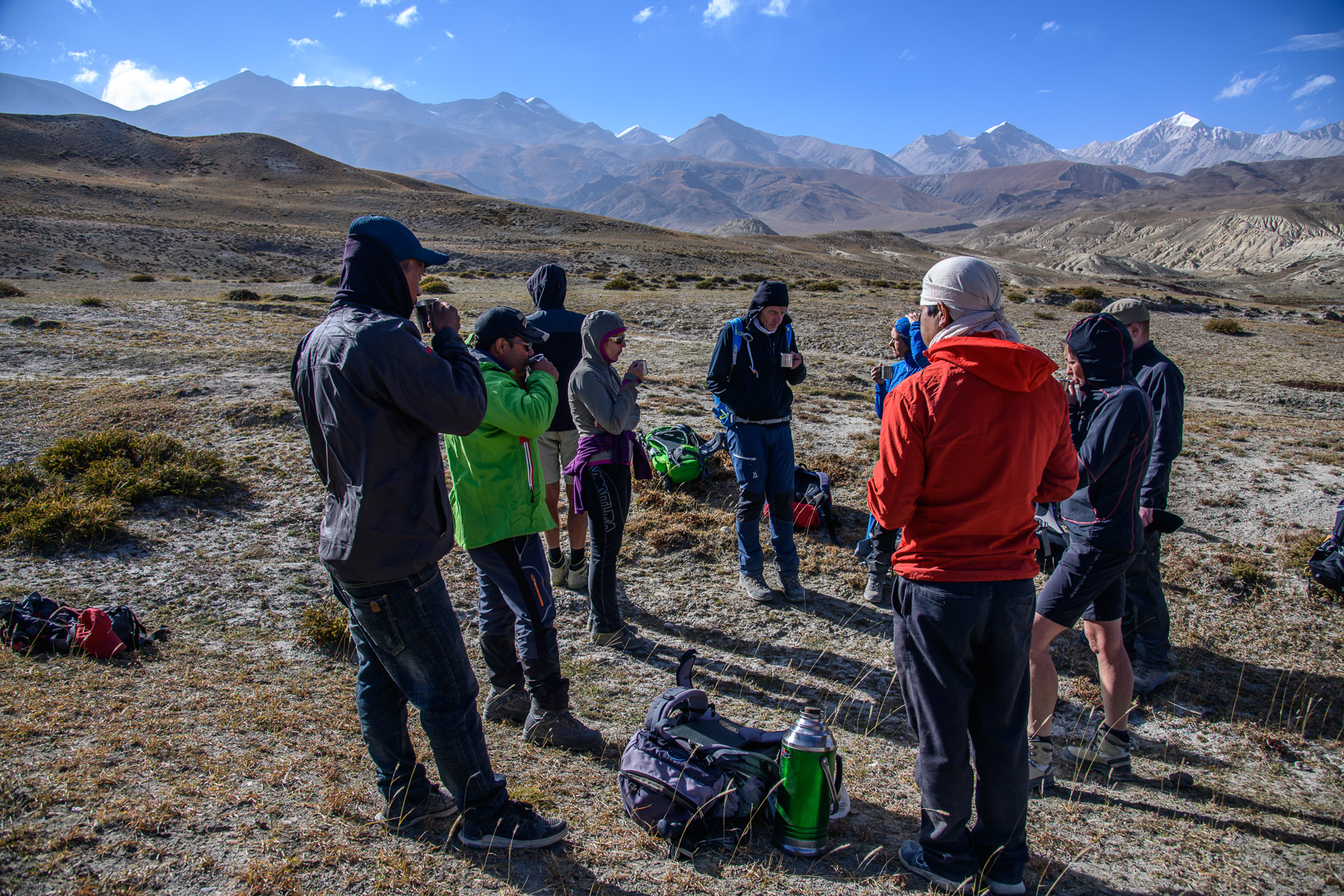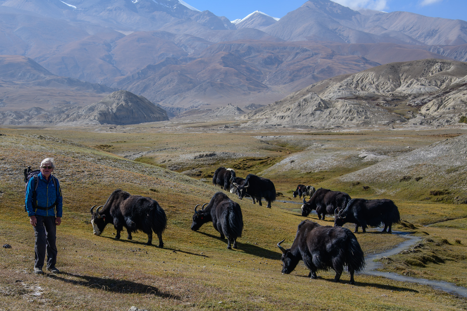 In the afternoon the Sherpa would be walking towards the pass down which the others would be coming in order to bring them a large flask of tea. I could go with him and our timing was perfect. We all met by a large cairn with prayer flags at 4025m at 15:00. We would have been a little earlier but we encountered a heard of yaks on the way. They were the first ones I had seen and I of course took a lot of photos. This Sherpa seemed to be interested in the photography and took pictures of me with the yaks even making use of the zoom lens! The others had enjoyed their walk as had I. It was the first time that I felt that we were really well away from the road.