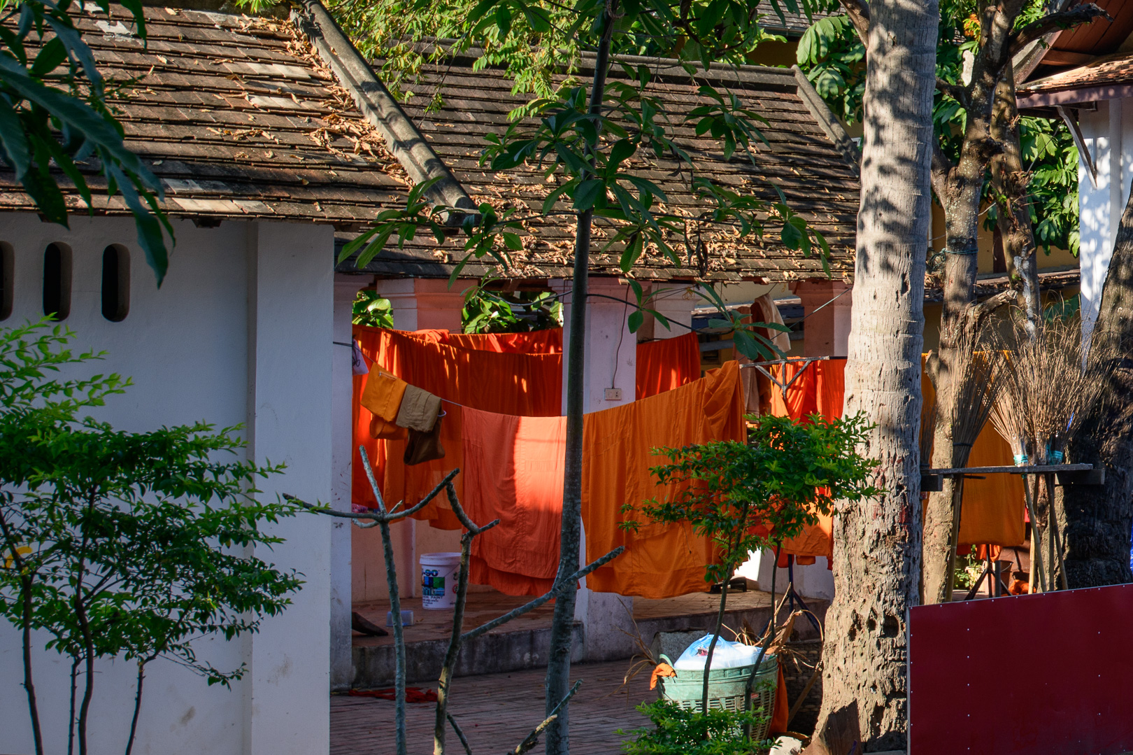 Luang Prabang is an attractive place (UNESCO heritage site) with many old buildings including the monastries. It is picturesquely situated at the confluence of the Nam Khan river with the Mekong. It reminds me of Pokara with the water and the surrounding wooded but less high hills. We had no guided programme today but explored on our own after lunch by the big river (the Mekong). The golden temples lining the main (Wat) street were all shining in the late afternoon sun but monks seemed to be scarce at that time of day. I did though spot some of their orange robes on a washing line. I visited briefly Wat Sibounheuang, Wat Si Moungkhoun, Wat Sop, Wat Saen and Wat Xieng Thong.