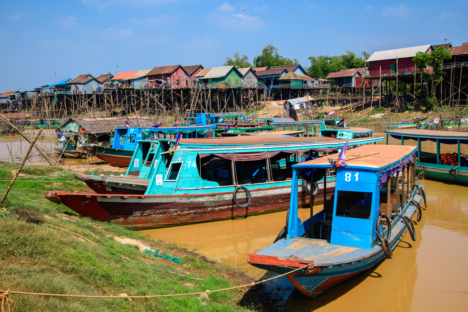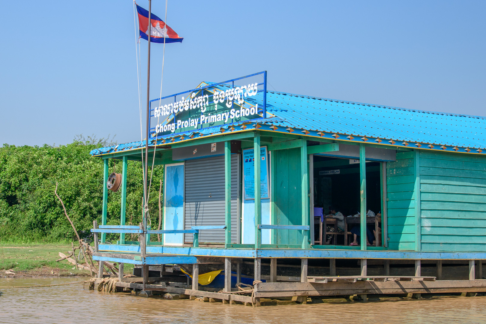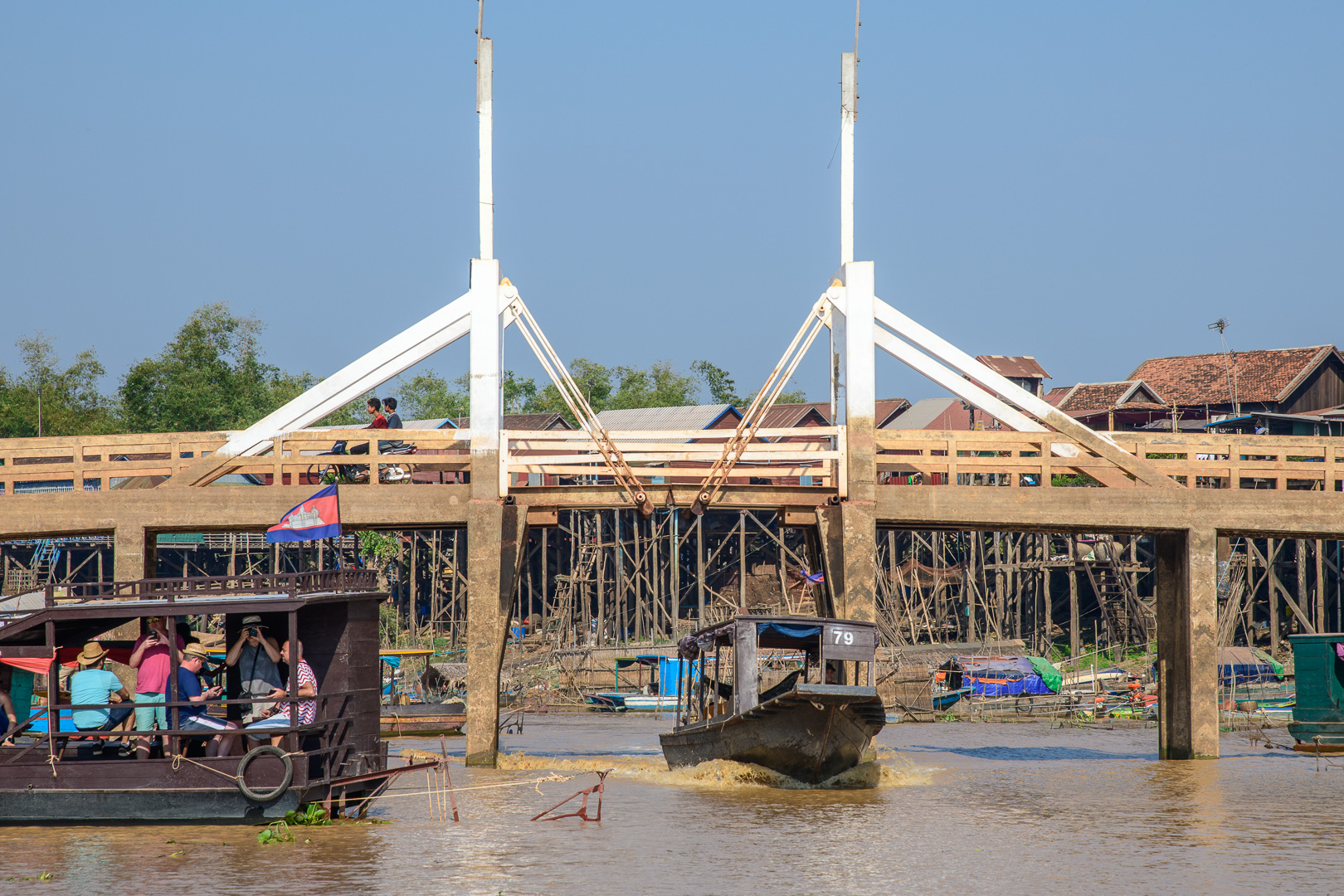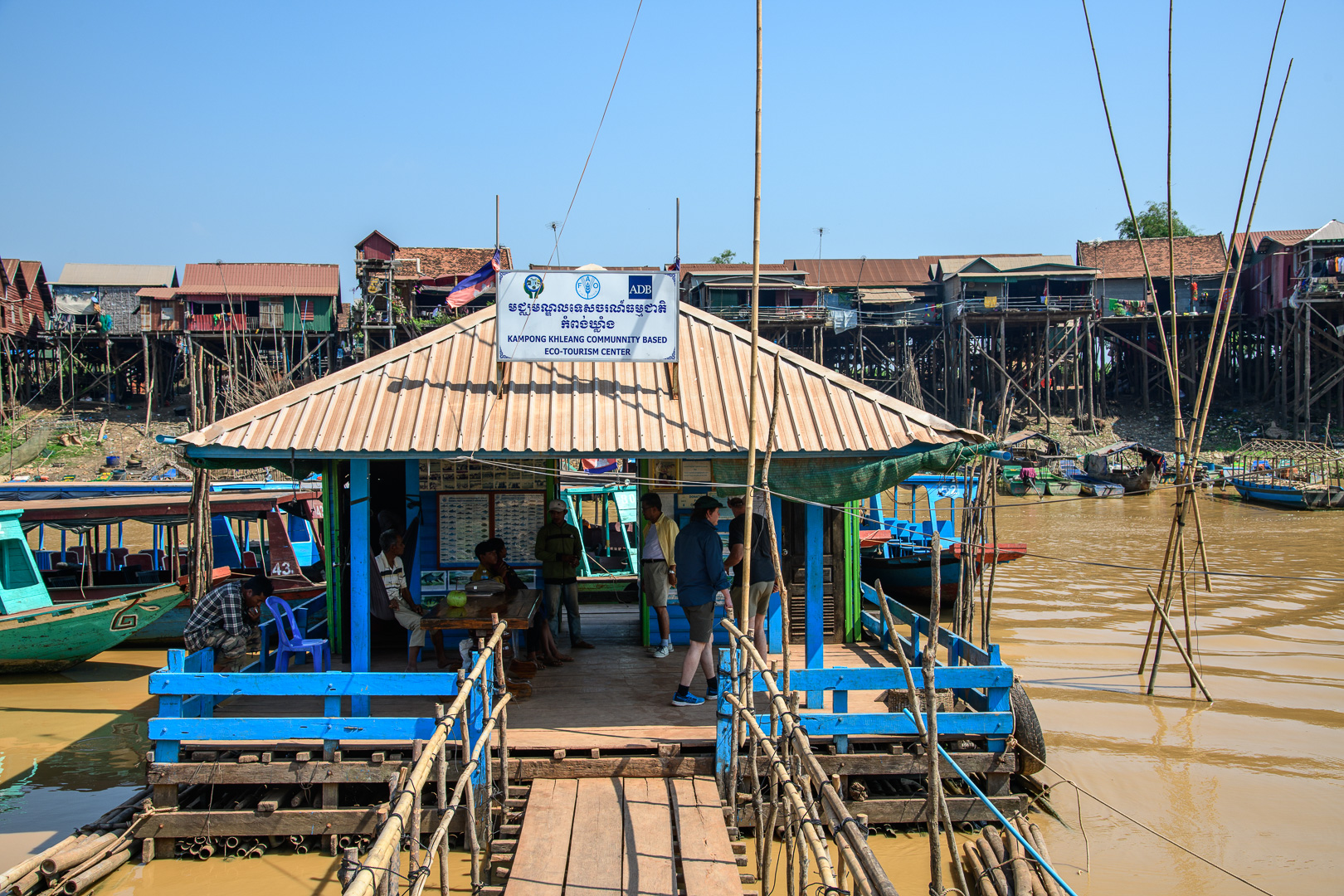 Today we had no delays and not too much traffic but it was a long journey anyway. We stopped at a nice restaurant by a lake for lunch and again later at Kompong Thom to view an ancient Naga bridge. The main attraction of the day was a boat trip on the Tonle Sap, the main lake, from the traditional village of Kompong Khleang. At this time of year the shallow water of the lake looks very muddy and this look transfers itself to the fishing villages built on stilts at the sides of the lake. This does not look very attractive when combined with corrugated iron sheets and plastic used in the house construction. They are still mostly wood of course. The final village which we passed in the boat was actually floating, but we did not approach it very closely, which is perhaps just as well. The nicest building was the Primary School which was painted blue with a big notice outside proclaiming its function. We could even see the little kids at their desks learning.