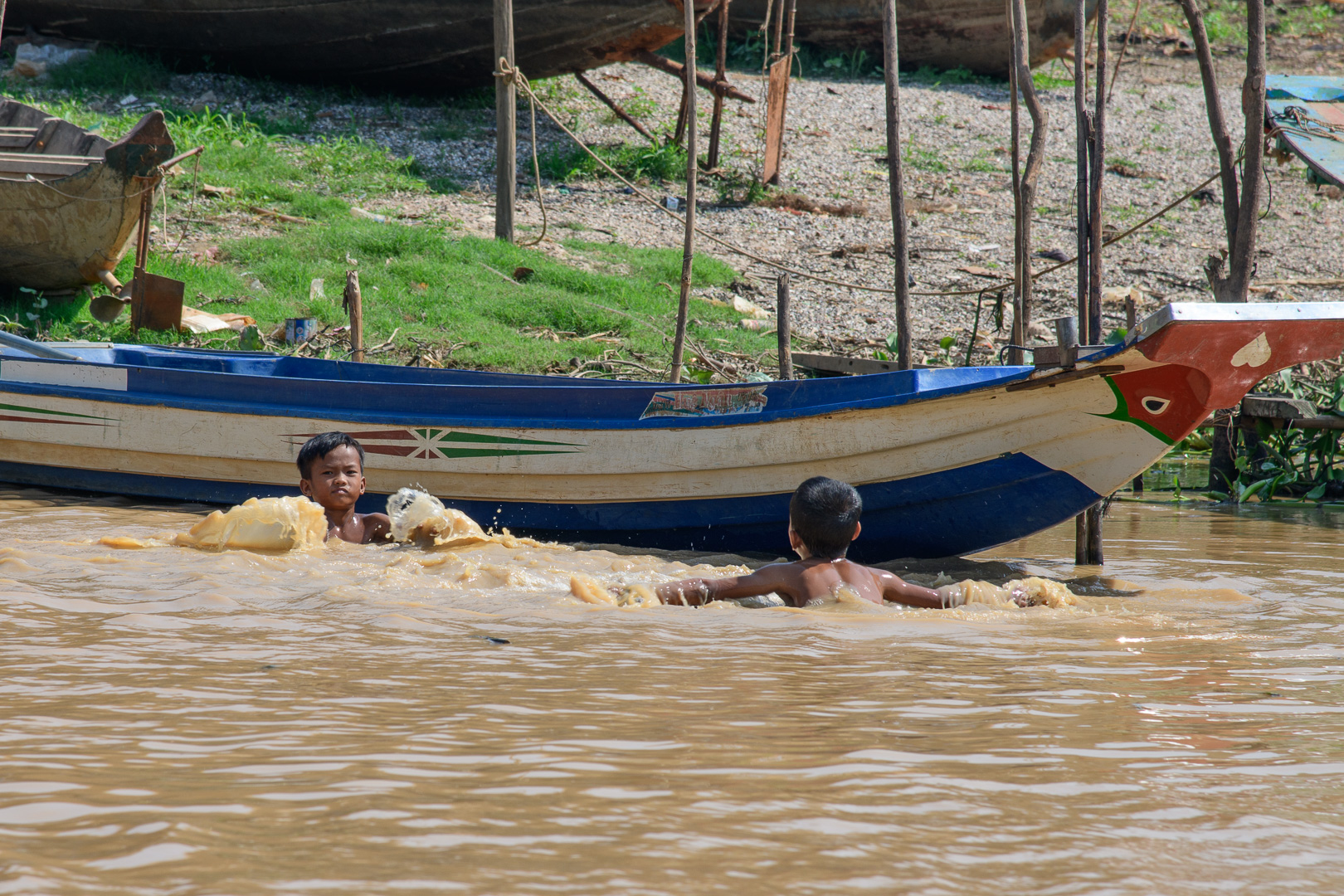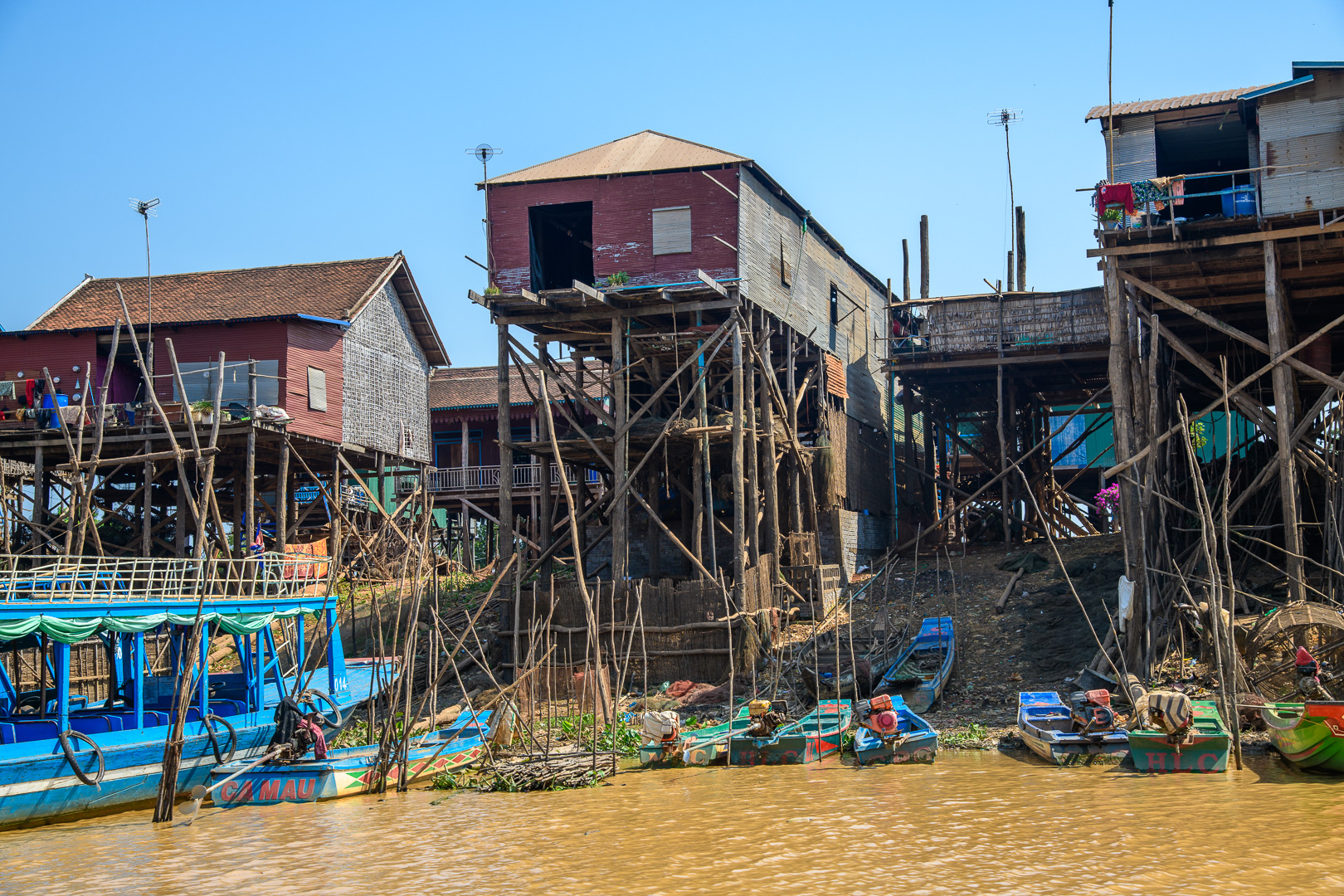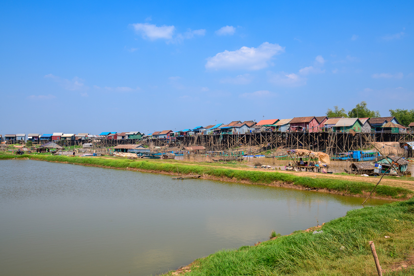 Today we had no delays and not too much traffic but it was a long journey anyway. We stopped at a nice restaurant by a lake for lunch and again later at Kompong Thom to view an ancient Naga bridge. The main attraction of the day was a boat trip on the Tonle Sap, the main lake, from the traditional village of Kompong Khleang. At this time of year the shallow water of the lake looks very muddy and this look transfers itself to the fishing villages built on stilts at the sides of the lake. This does not look very attractive when combined with corrugated iron sheets and plastic used in the house construction. They are still mostly wood of course. The final village which we passed in the boat was actually floating, but we did not approach it very closely, which is perhaps just as well. The nicest building was the Primary School which was painted blue with a big notice outside proclaiming its function. We could even see the little kids at their desks learning.