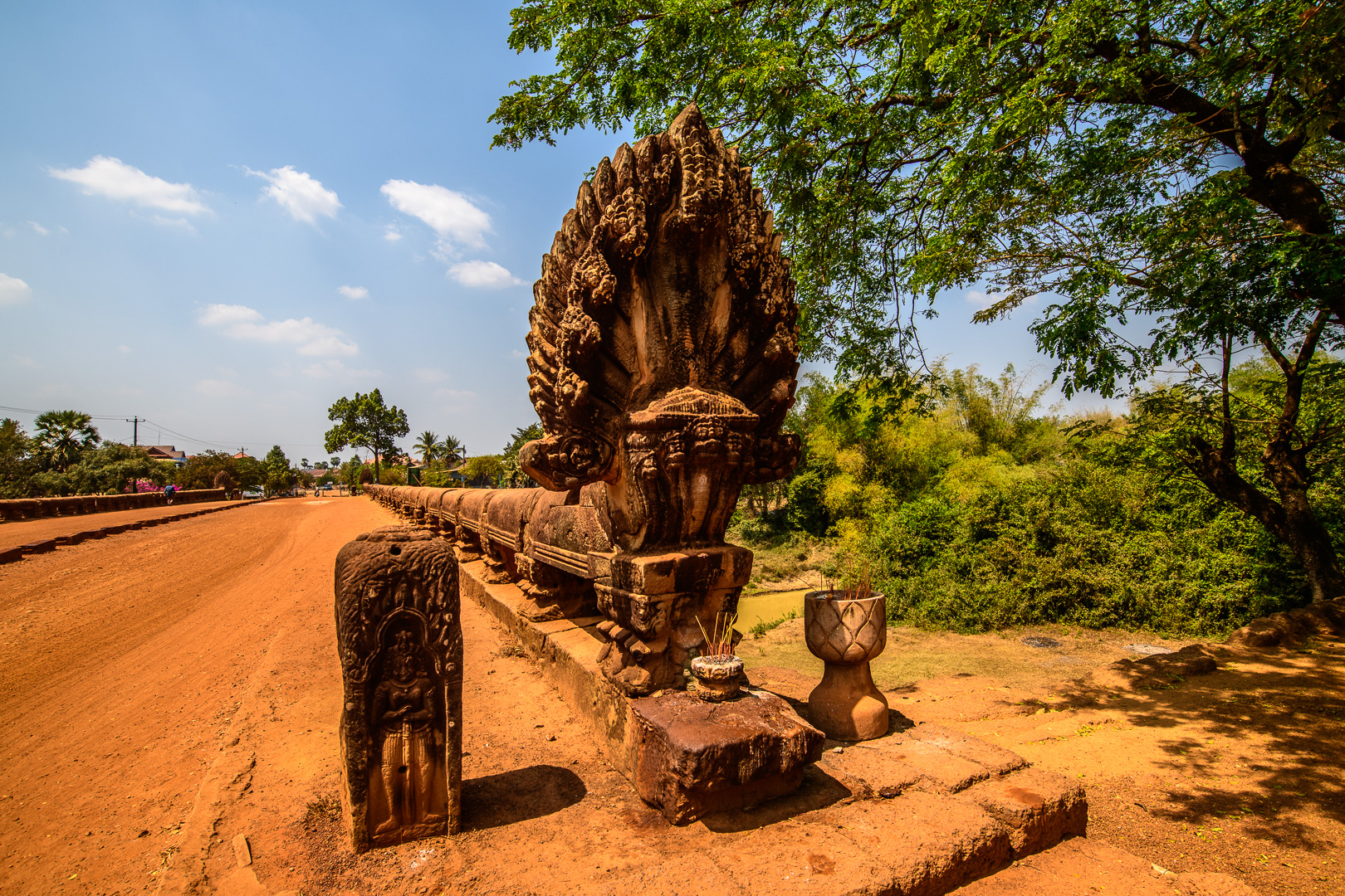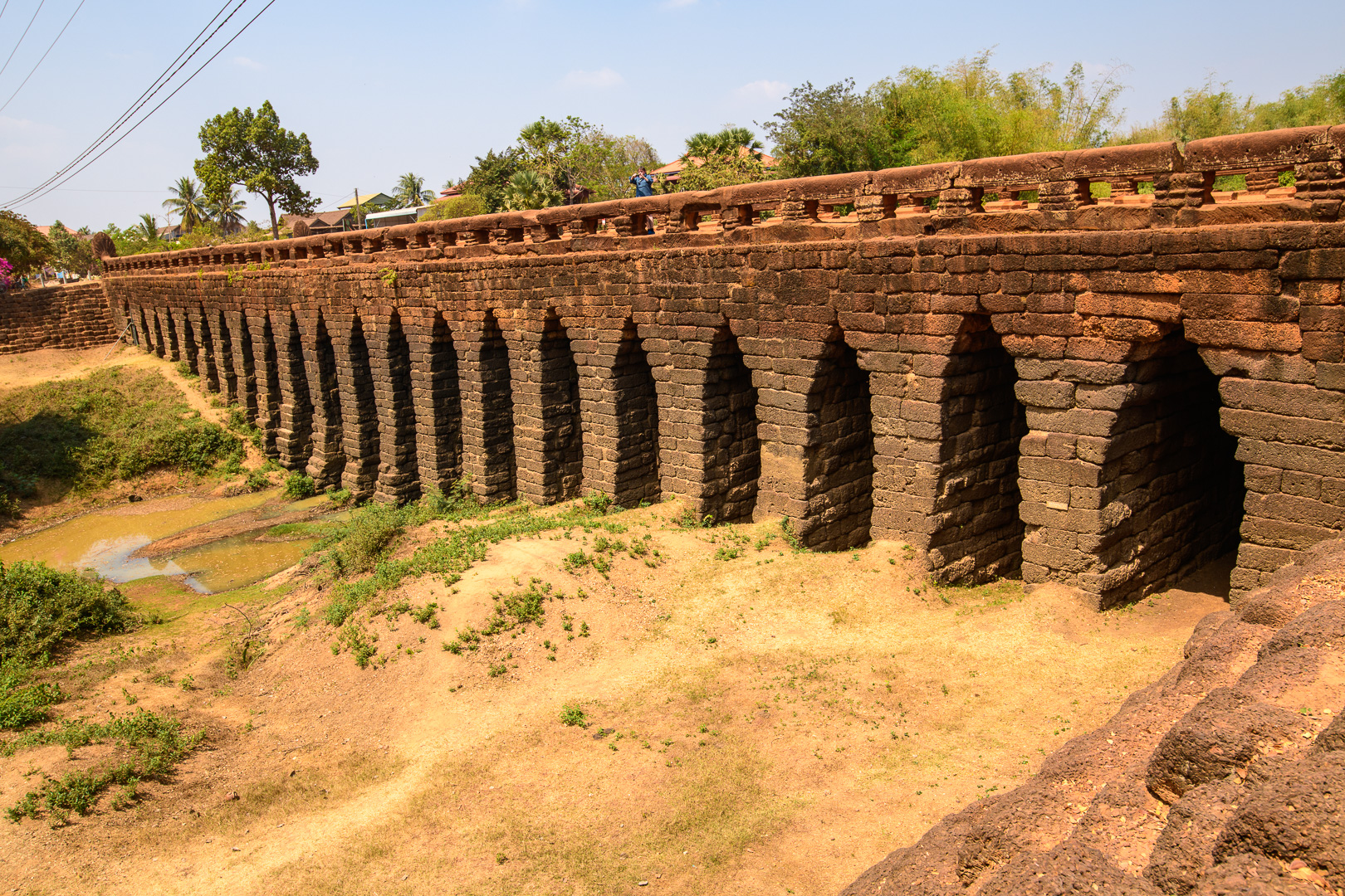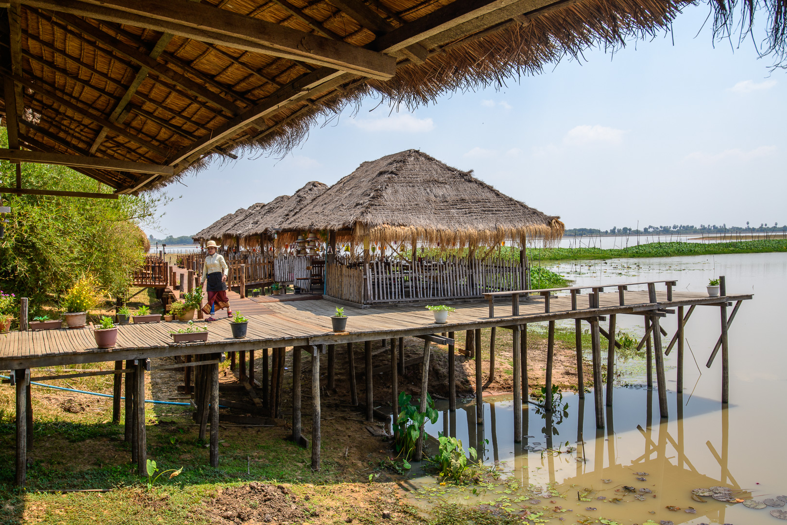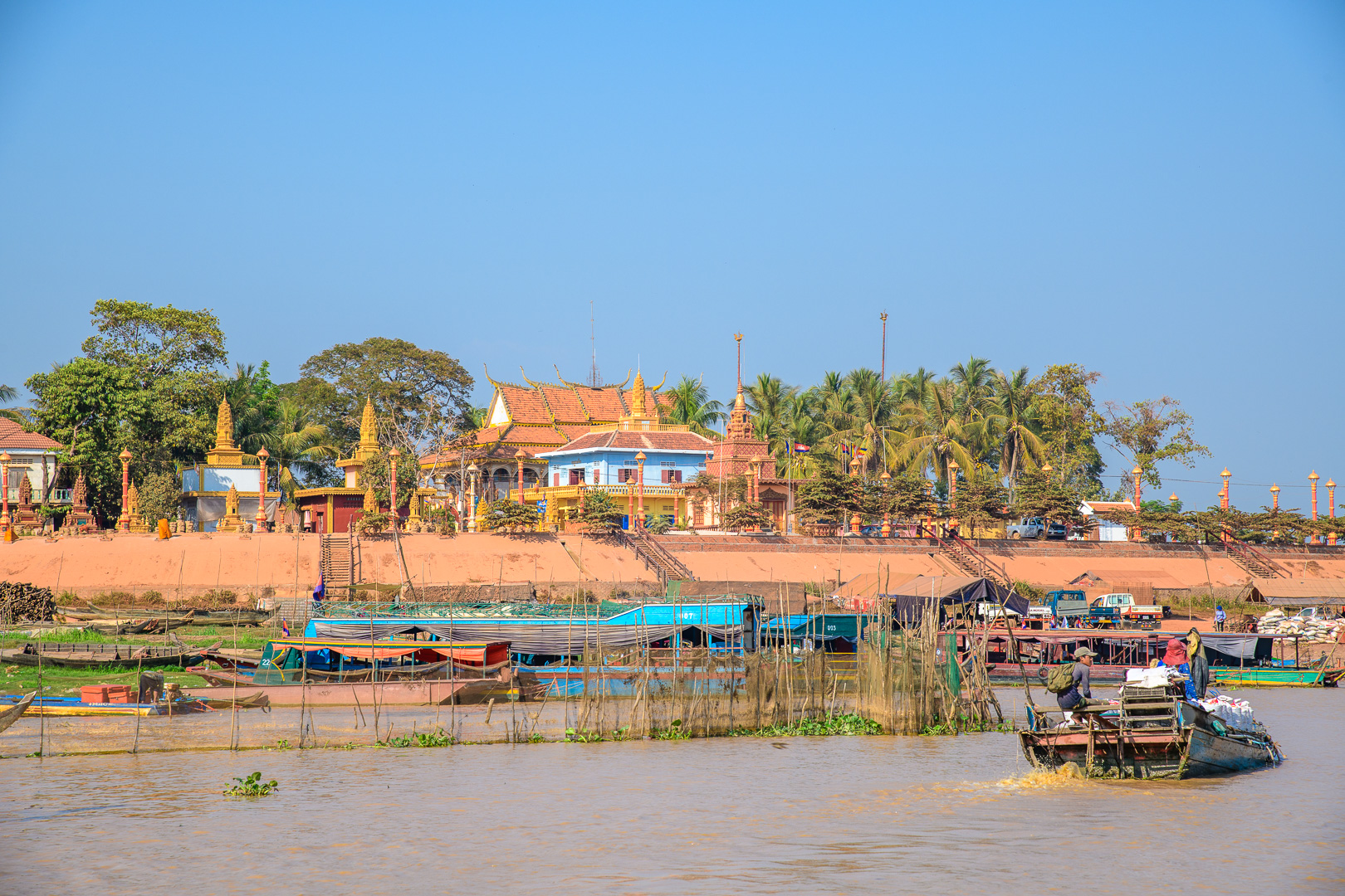 Today we had no delays and not too much traffic but it was a long journey anyway. We stopped at a nice restaurant by a lake for lunch and again later at Kompong Thom to view an ancient Naga bridge. The main attraction of the day was a boat trip on the Tonle Sap, the main lake, from the traditional village of Kompong Khleang. At this time of year the shallow water of the lake looks very muddy and this look transfers itself to the fishing villages built on stilts at the sides of the lake. This does not look very attractive when combined with corrugated iron sheets and plastic used in the house construction. They are still mostly wood of course. The final village which we passed in the boat was actually floating, but we did not approach it very closely, which is perhaps just as well. The nicest building was the Primary School which was painted blue with a big notice outside proclaiming its function. We could even see the little kids at their desks learning.