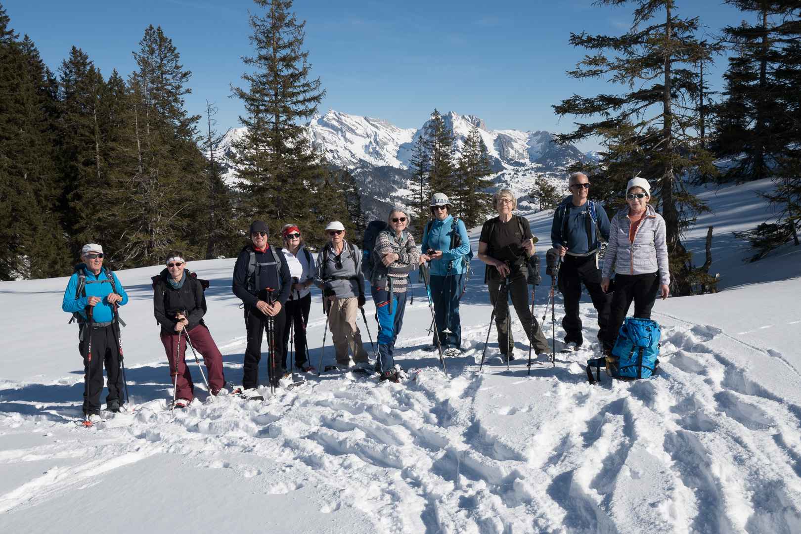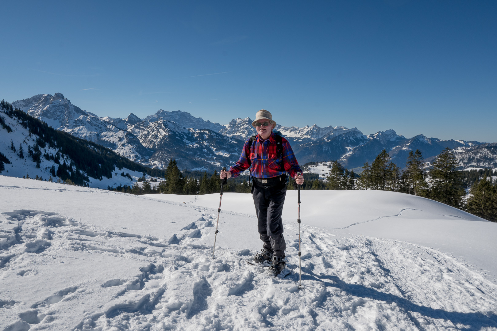 Es hatte sich gelohnt, die weite Reise in Kauf zu nehmen. In Amden herrschte noch die Farbe Grün vor, aber weiter oben an der Busendstation Arvenbüel war es winterlich weiss. Der Trail startet auf 1273 m ü.M. Erst mussten wir etwas absteigen bis zum Beerenbach. Dort zogen wir die Schneeschuhe an und wanderten langsam aufwärts nach Looch. Die eingelegte Pause gab genügend Zeit für das Bewundern und Fotografieren vom Leistchamm und den Glarner Alpen. Die danach folgende Strecke auf der Westseite des Flügenspitz führte durch locker bewaldetes ideales Schneeschuhgebiet.