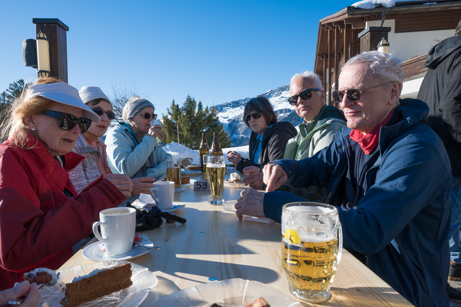 Nach dem Picknick in der Sonne mussten wir mit vollem Bauch ein Stück aufwärts wandern. Hat sich gelohnt, denn vom höchsten Punkt der Tour (1628 m) gab es freie Sicht auf Alpstein, Churfirsten und Toggenburg. Auf der Terrasse der Alpwirtschaft Vorder Höhi setzten wir uns in die Sonne, bis uns der kälter werdende Wind vertrieb. Die anfangs parallel zum Winterwanderweg angelegte Abstiegsroute trennte sich bald von diesem. Wir erreichten den noch tief verschneiten, recht einsamen und wunderschönen Trail am Beerenbach und erreichten bald das Skigebiet Arvenbüel. Den gelungenen Tag feierten wir auf der Restaurantterrasse mit einem Stück des weltzweitbesten Zwetgschenkuchens.