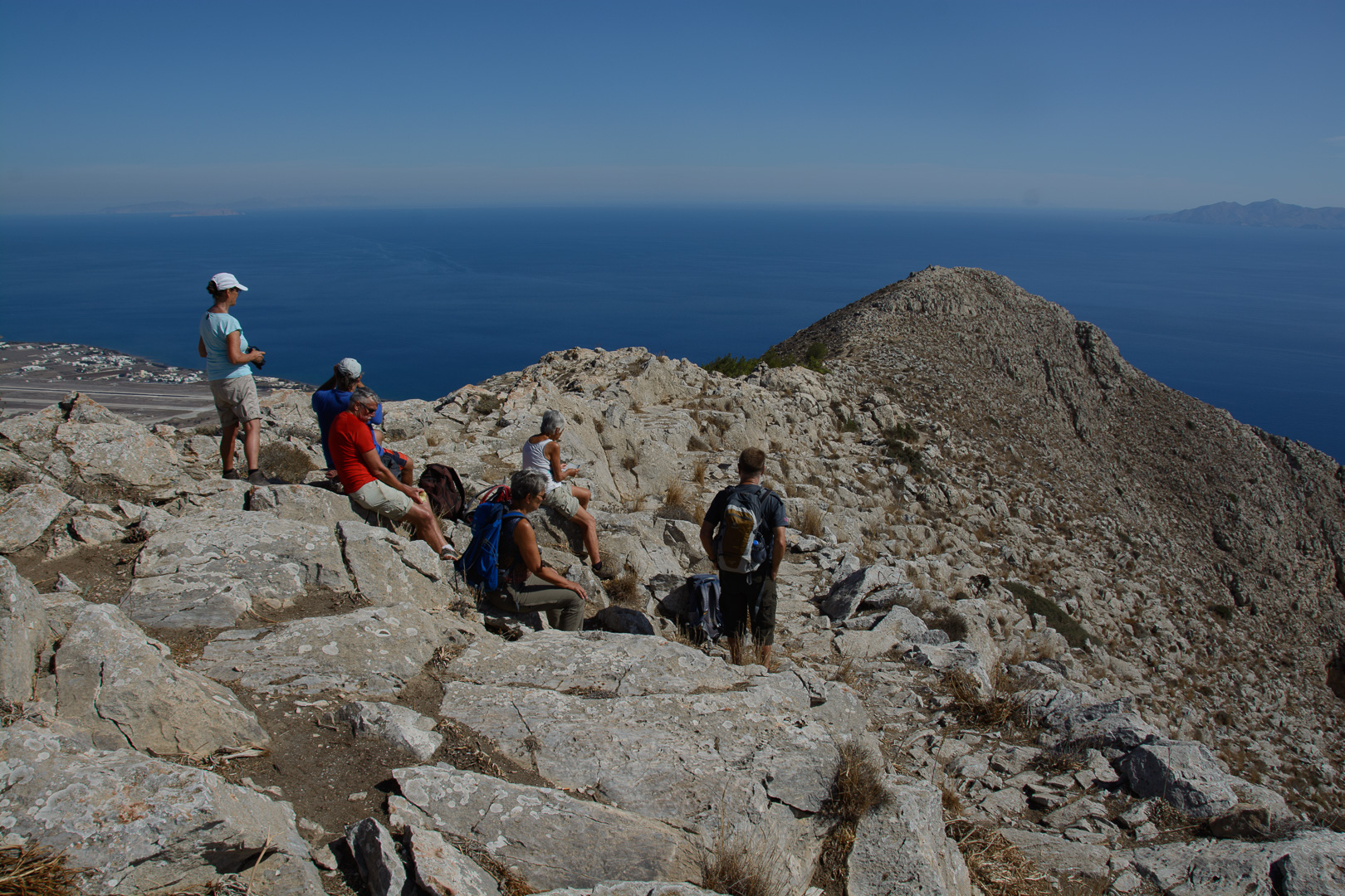 Wir haben den ersten Tagen im Süden in der Hauptstadt Pigadia verbracht. Dort in der Umgebung waren die Wanderungen leicht, sogar lieblich, aber bei die vierte Wanderung durch eine pinienbewachsene Schlucht in der Mitte der Insel bis auf 720m änderten sich die Anspruche schlagartig. Trotzdem haben drei Gipfelstürmer anschliessend die höchste Berg der Insel der Kali Limni mit 1215m bestiegen! |