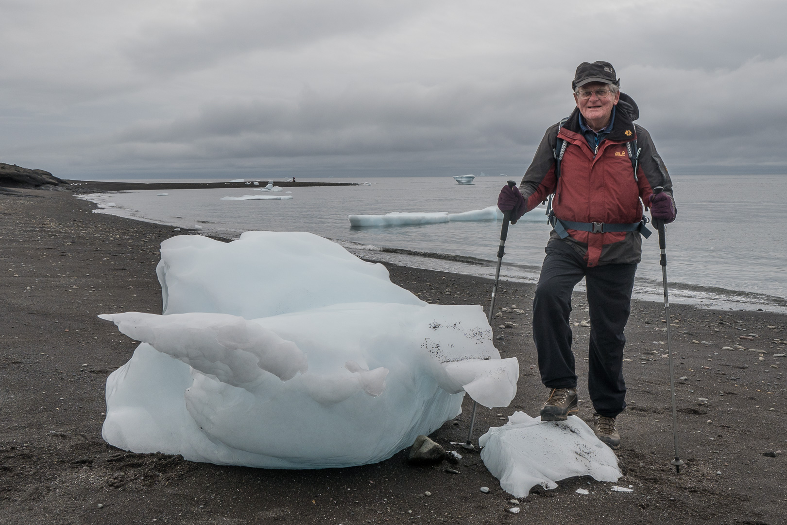 - The weather was still grey, but there was not much rain and we walked along the coast in the opposite direction as the previous day. The Disko Island is of volcanic origin as can be seen in the rocks and landscape. It is strange to see small icebergs stranded on the black beach. There was a much larger ice berg looming over the far side of the village which must be as big as a multi-storyblock of flats. Unfortunately there was no sign of any whales though. I hoped for some sightings on the return trip to the mainland would be somewhat shorter and less rough.