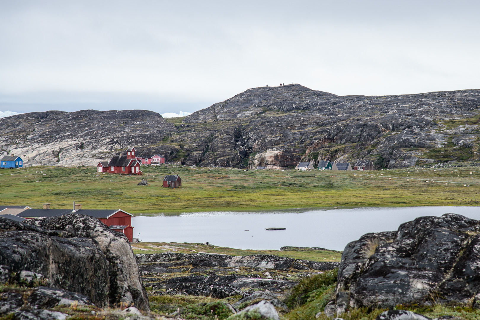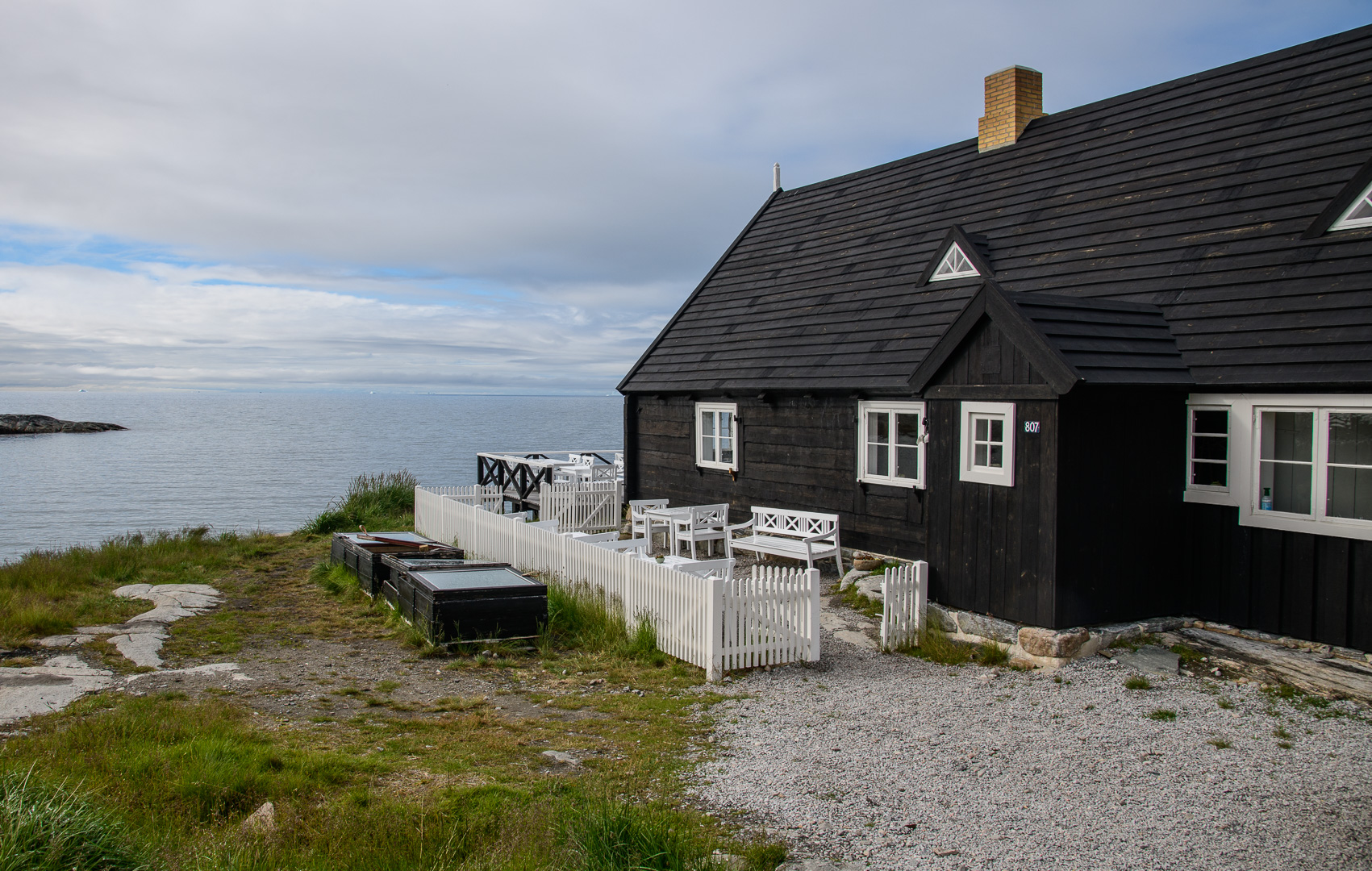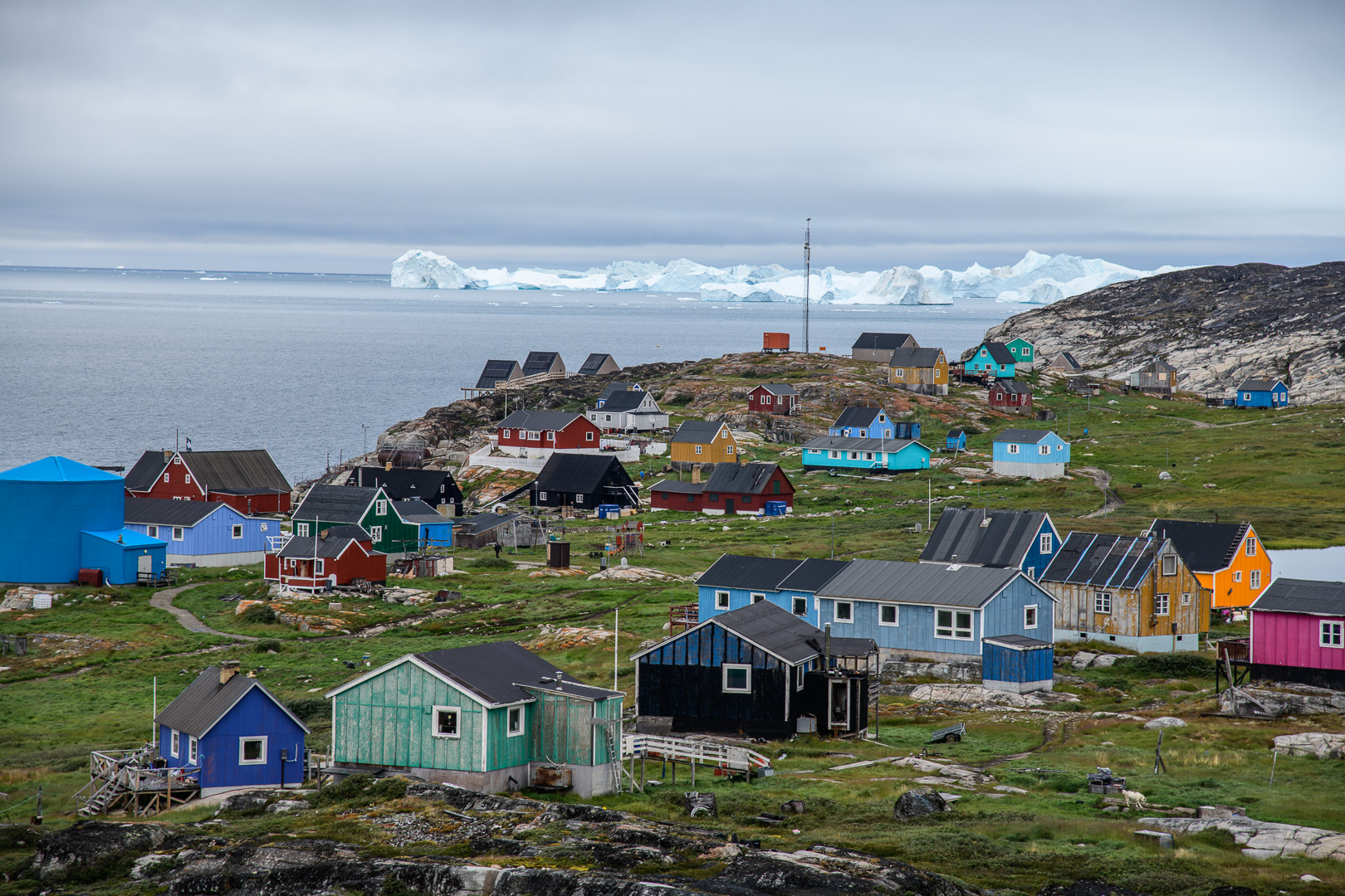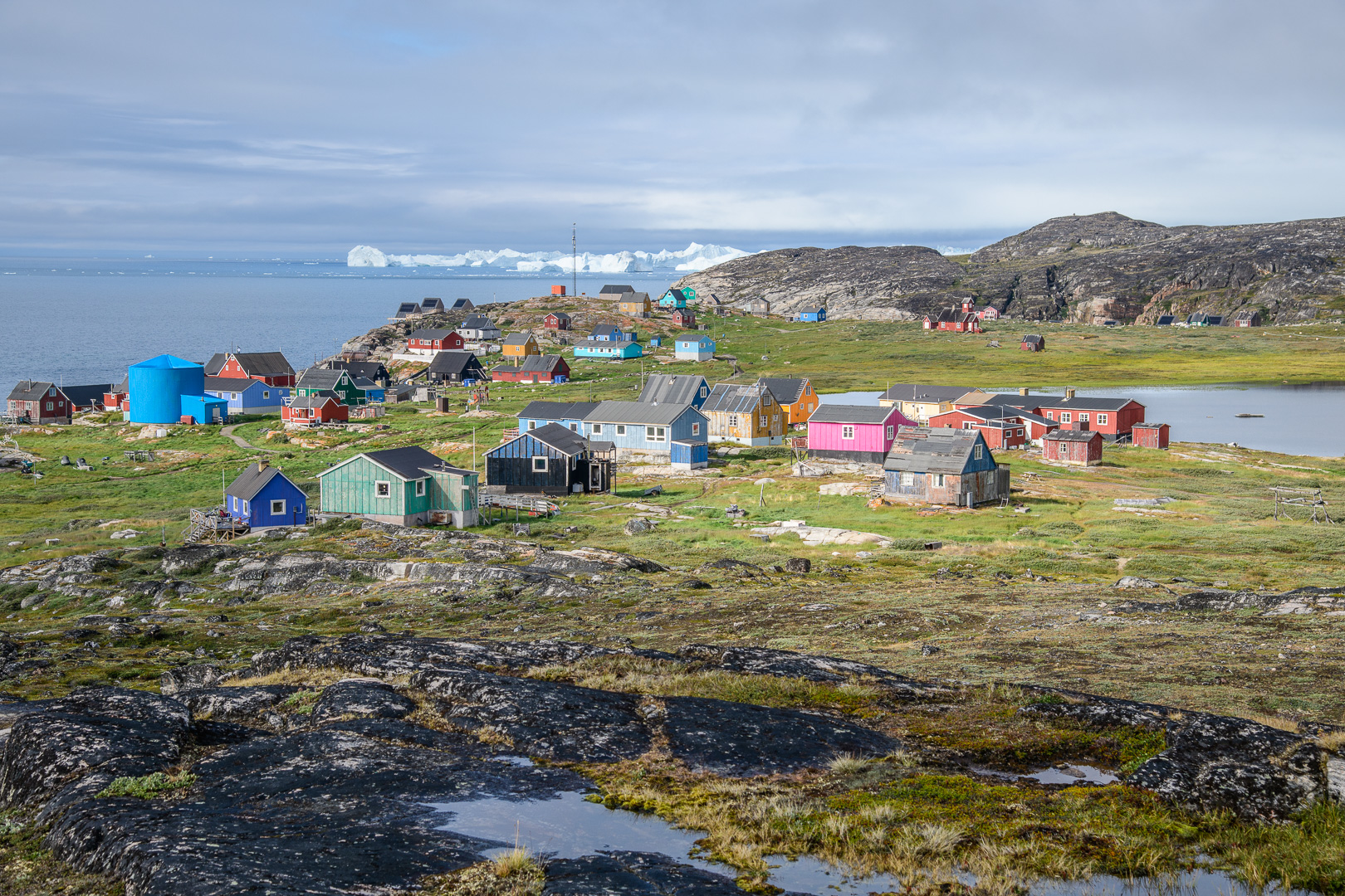 When we arrived at this latest outpost it seemed like the last place on earth, but somebody had had the crazy idea of building a row of luxury lodges on the rocks along the coast. The sun came out in the afternoon as I walked up to the cemetery, the local view point. On the way l was inspected by a group of not so young huskies, but they soon went off to play with a large chunk of polystyrene. They are not kept on tether like the adults. There was a beautiful view across thesea with ice bergs and the Disko Island which we had just left. I was finally using my large camera and telephoto lens, but there were still no whales to be seen. We had dinner in a restaurant which occupied one of the 2 original historic buildings. The holiday had become a sort of boat safari from one small settlement to another and we left again early in the morning for the next one.