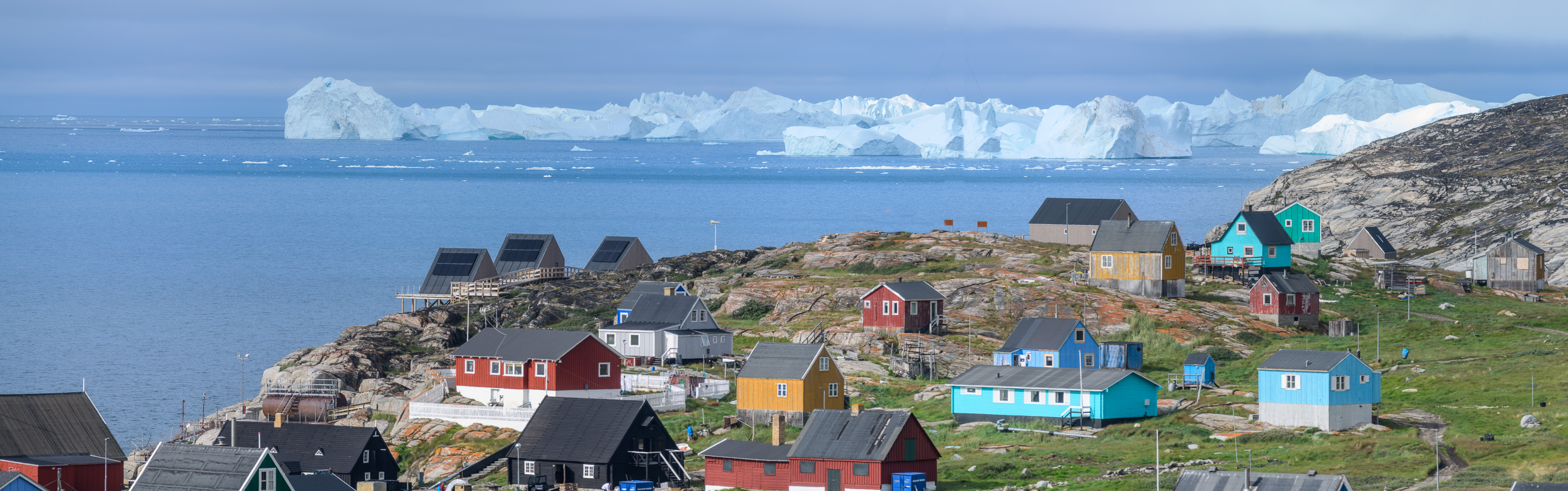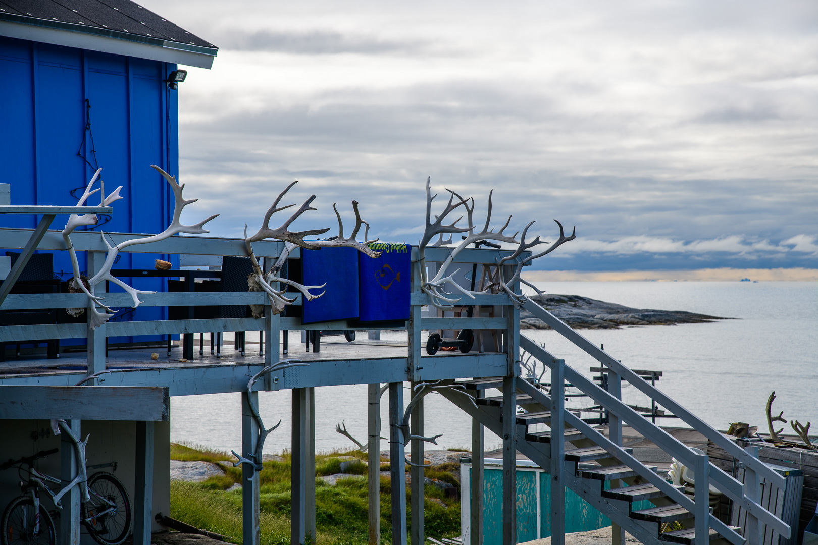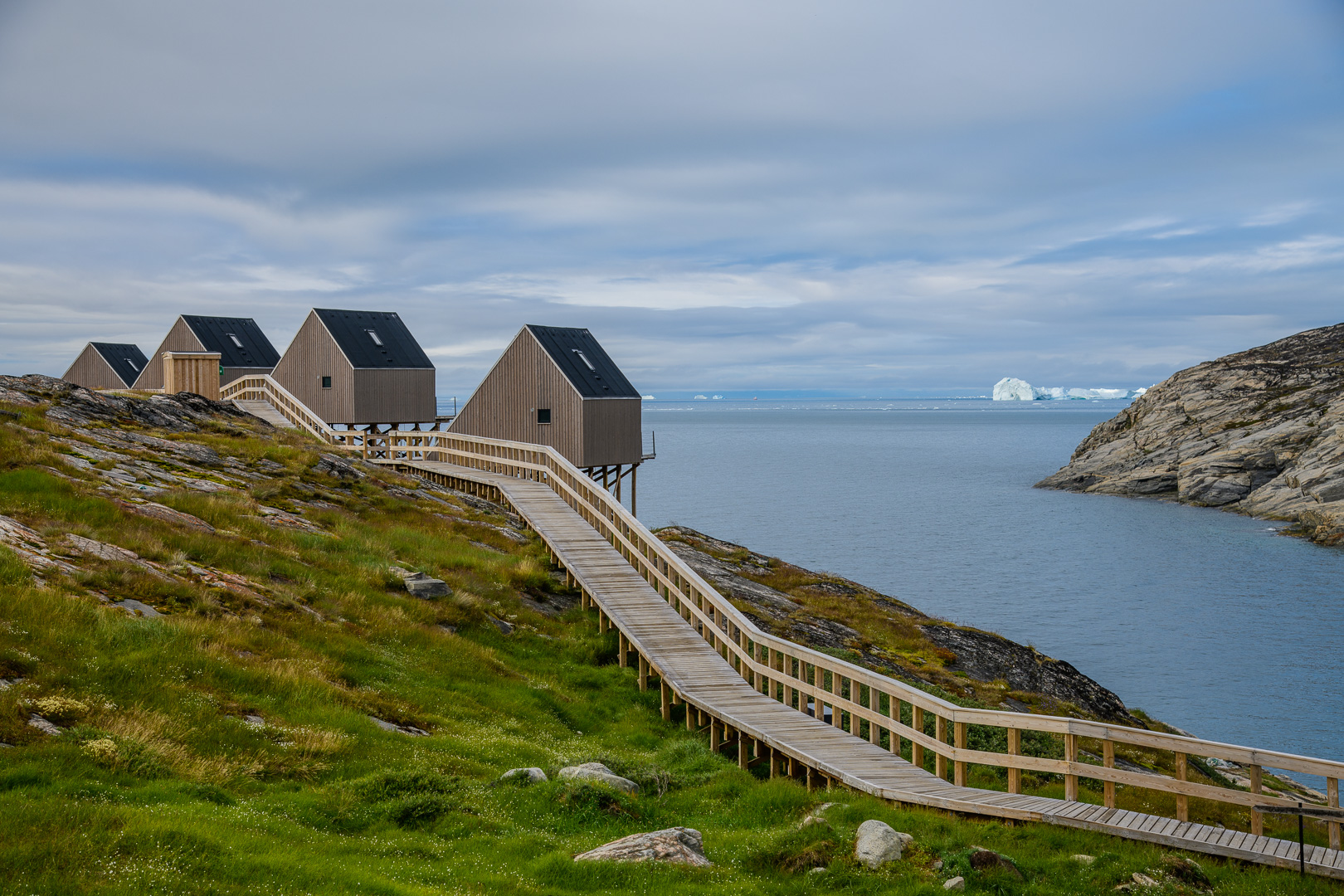 When we arrived at this latest outpost it seemed like the last place on earth, but somebody had had the crazy idea of building a row of luxury lodges on the rocks along the coast. The sun came out in the afternoon as I walked up to the cemetery, the local view point. On the way l was inspected by a group of not so young huskies, but they soon went off to play with a large chunk of polystyrene. They are not kept on tether like the adults. There was a beautiful view across thesea with ice bergs and the Disko Island which we had just left. I was finally using my large camera and telephoto lens, but there were still no whales to be seen. We had dinner in a restaurant which occupied one of the 2 original historic buildings. The holiday had become a sort of boat safari from one small settlement to another and we left again early in the morning for the next one.