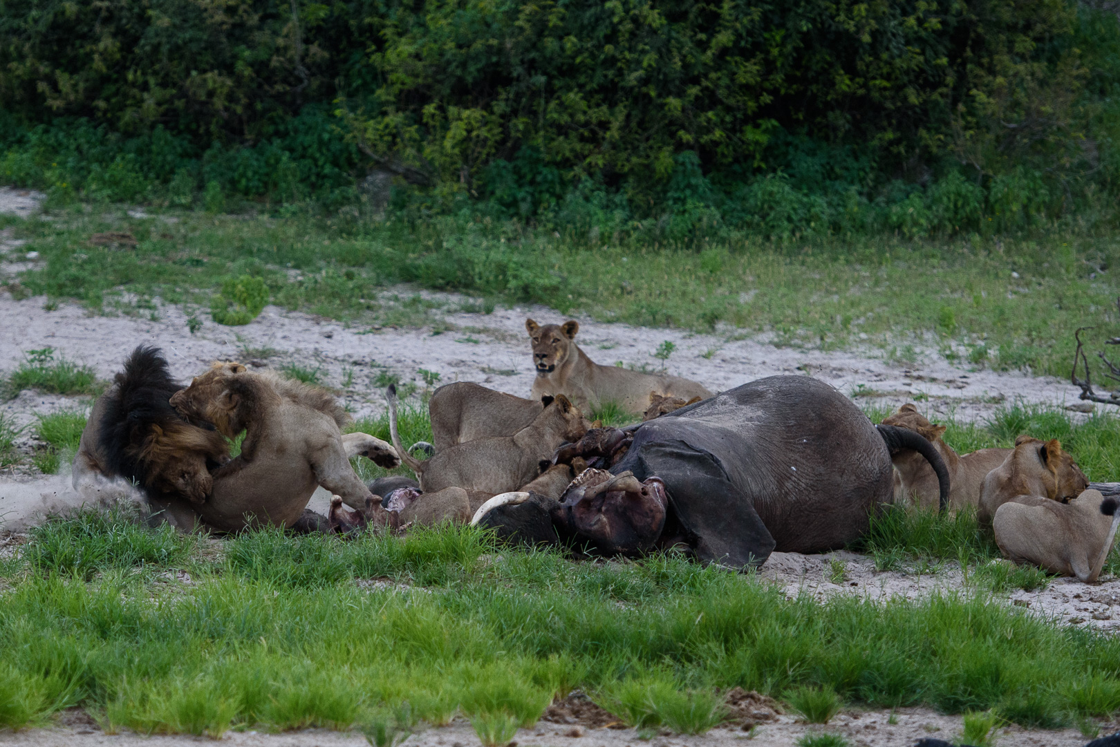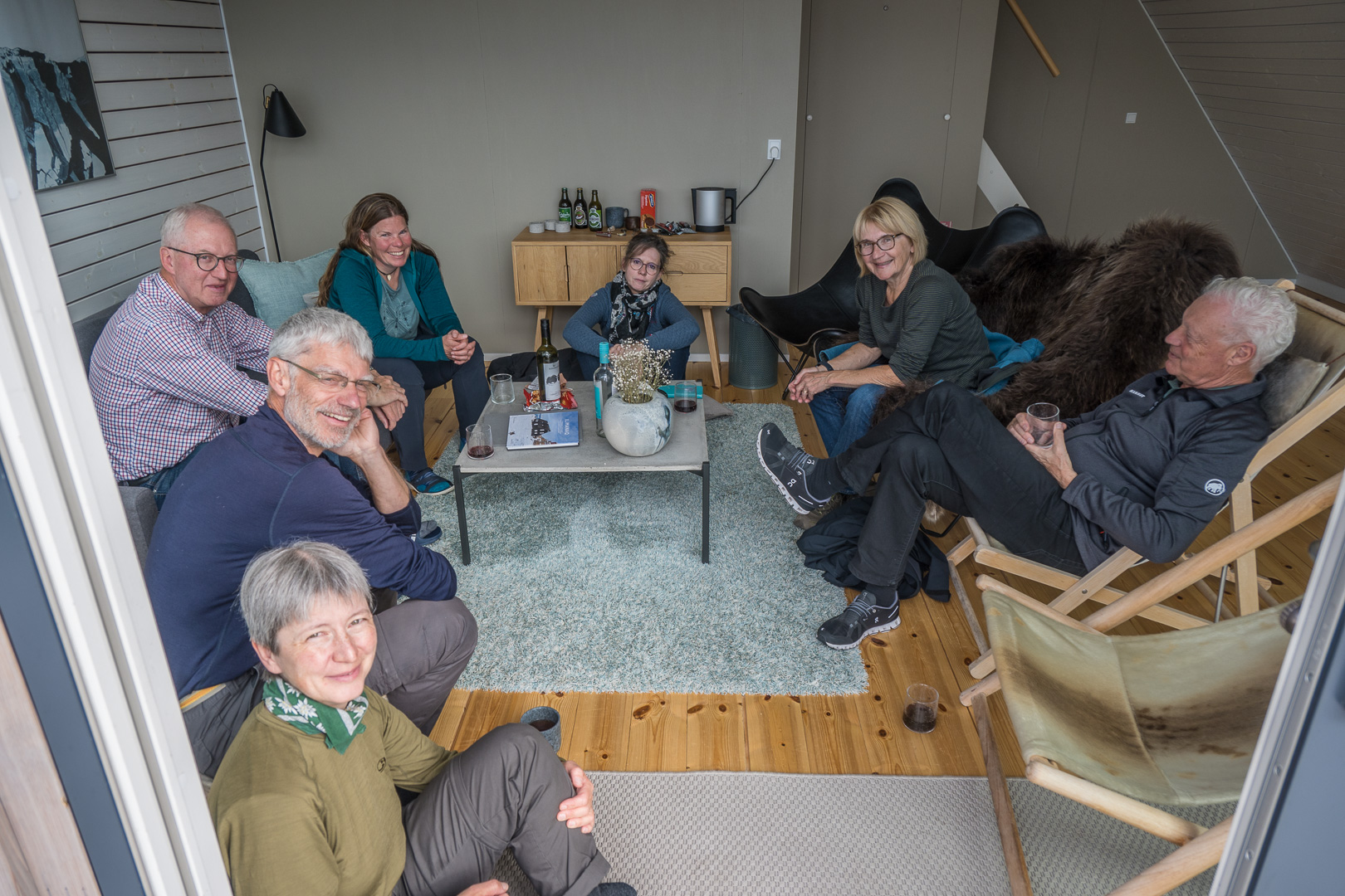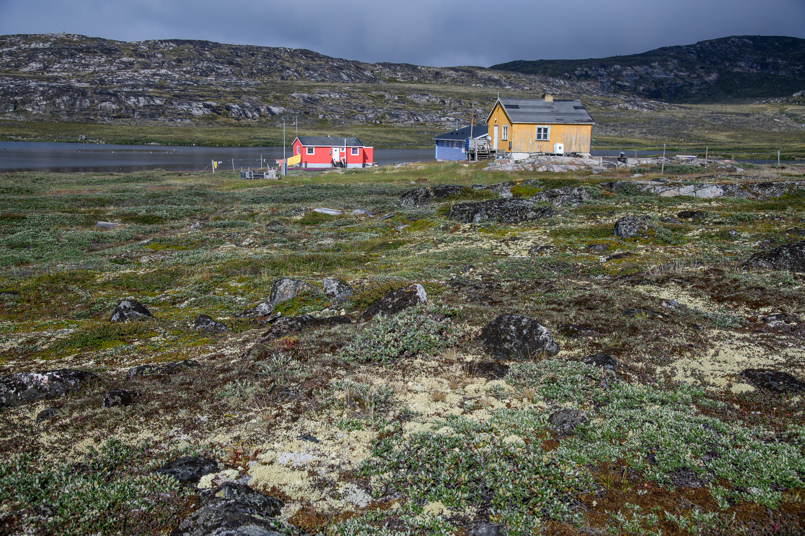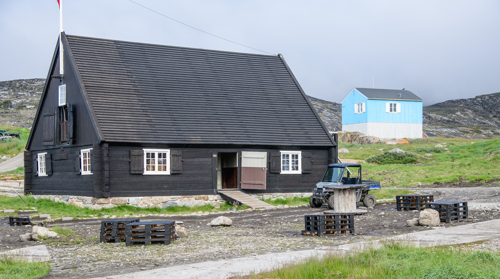 When we arrived at this latest outpost it seemed like the last place on earth, but somebody had had the crazy idea of building a row of luxury lodges on the rocks along the coast. The sun came out in the afternoon as I walked up to the cemetery, the local view point. On the way l was inspected by a group of not so young huskies, but they soon went off to play with a large chunk of polystyrene. They are not kept on tether like the adults. There was a beautiful view across thesea with ice bergs and the Disko Island which we had just left. I was finally using my large camera and telephoto lens, but there were still no whales to be seen. We had dinner in a restaurant which occupied one of the 2 original historic buildings. The holiday had become a sort of boat safari from one small settlement to another and we left again early in the morning for the next one.