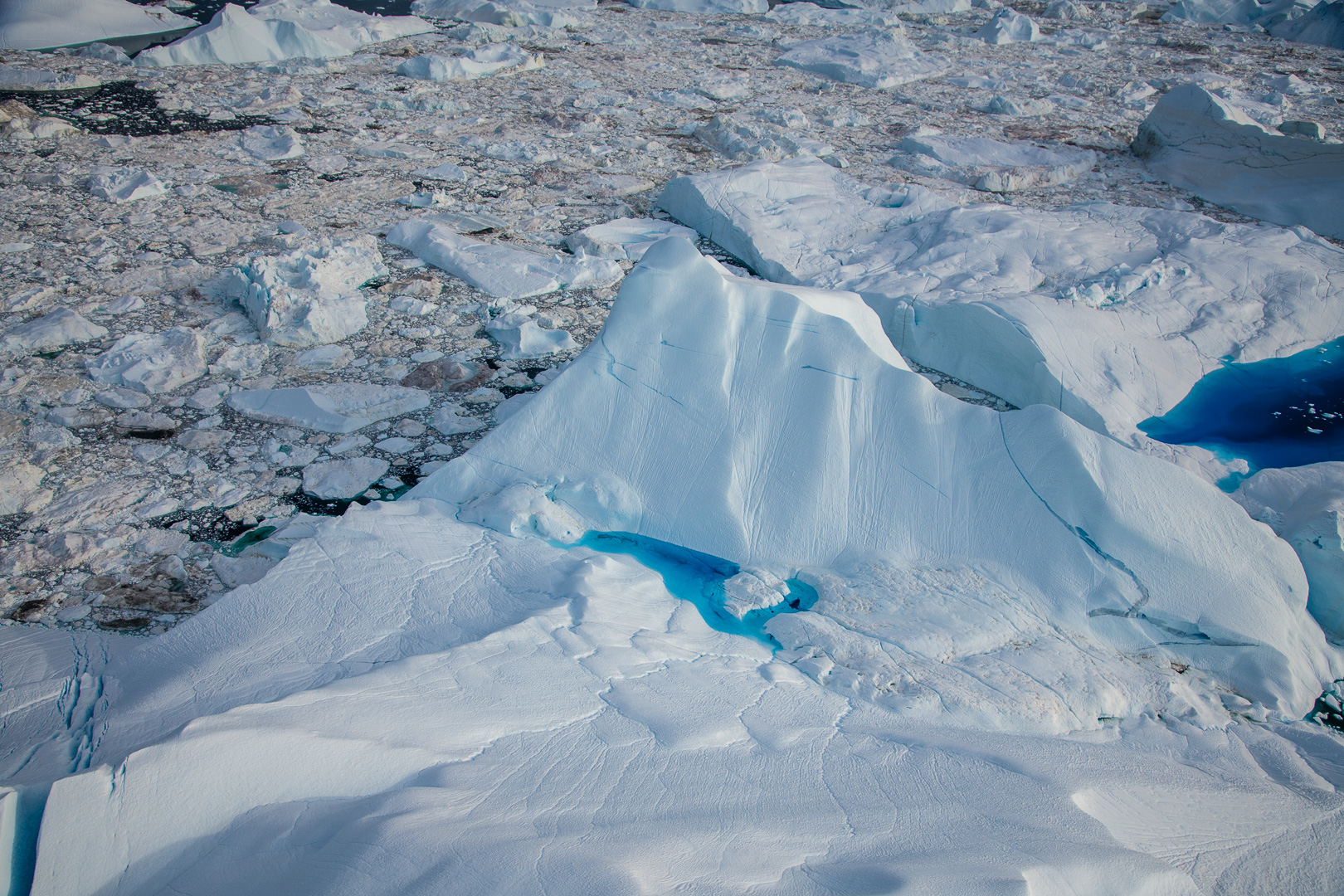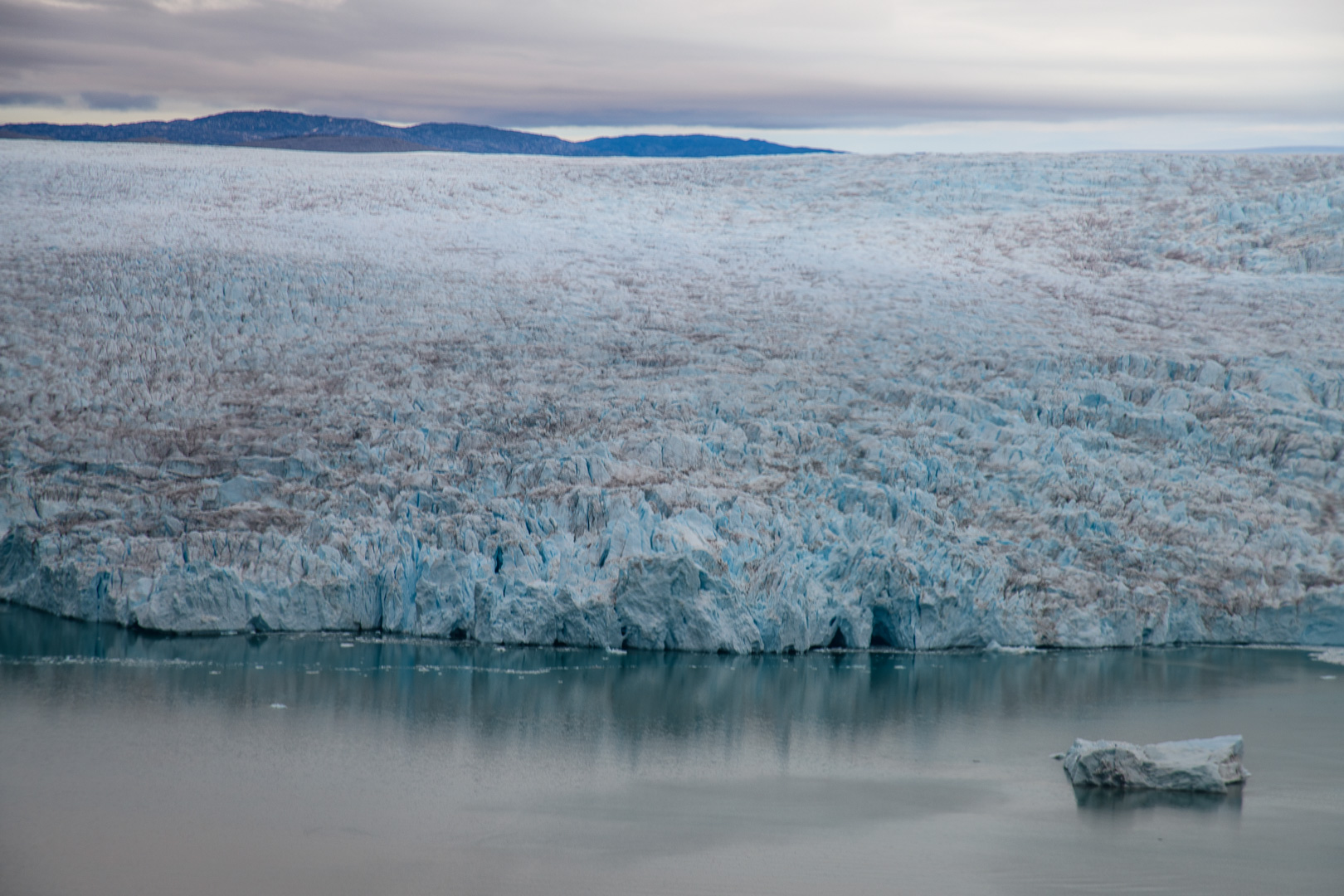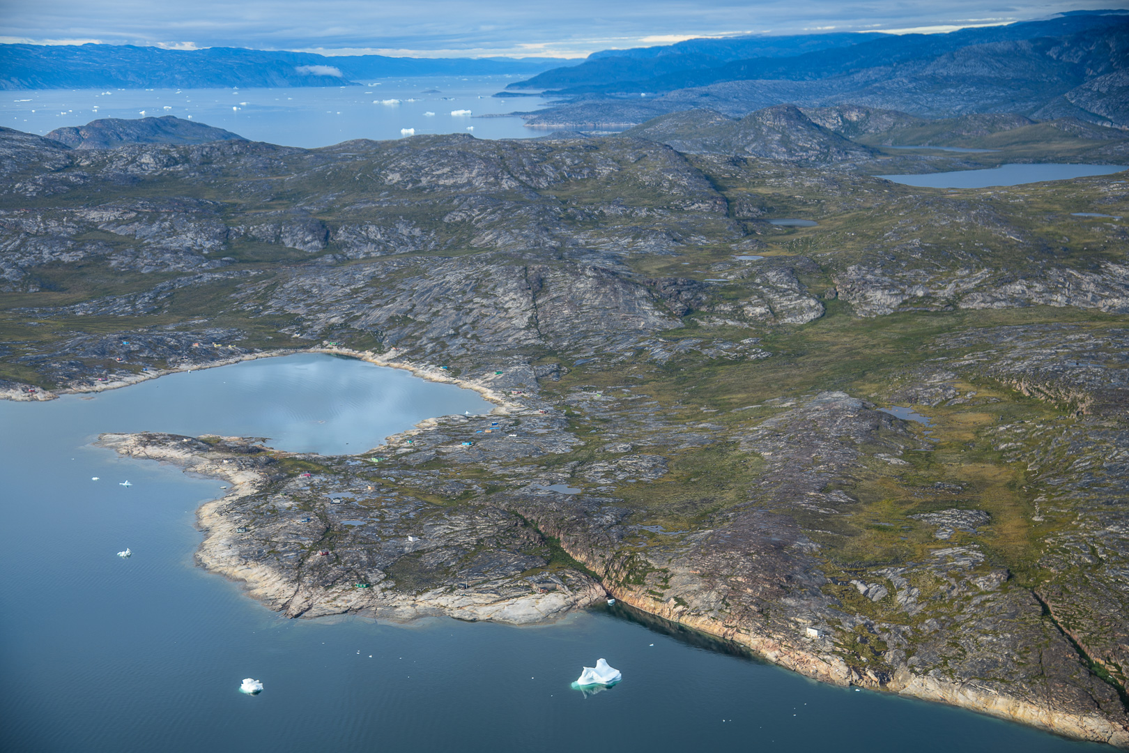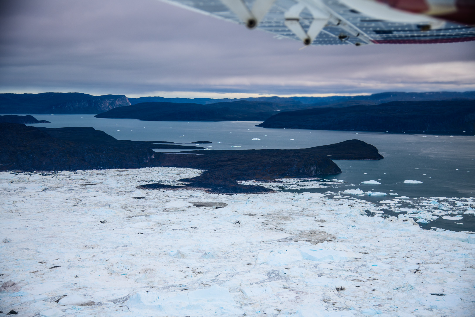 I again opted out of the planned walk and took the last day more easily. Only in the late morning did I think I should take the opportunity to see the glacier more closely. It was possible to make flights by helicopter or light aircraft to the glacier face where it breaks off the inland ice about 50 km inland. The helicopter trips were all booked out but I could go at the end of the afternoon on a one-hour flight with a small 5-seater plane. The round trip from the airport first went to the Avnnarieq side glacier and then along the edge of the inland ice to the head of the Kangia glacier. There great views of the 7 km wide ice cliff where the icebergs break off and then one flies the full length of the fjord packed with giant icebergs. Not all of it can be seen any other way. On reaching the sea even some whales could be spotted. The weather was not perfect but clear enough. I had taken a taxi to the airport and back again (with 2 other people) directly to the restaurant in the centre of town where I was to meet the group, saving walking from the hotel. I was back just in time for our last dinner which consisted of halibut again. After dinner I walked back along the coast and could take photos in the good evening light since I still had my camera with me.