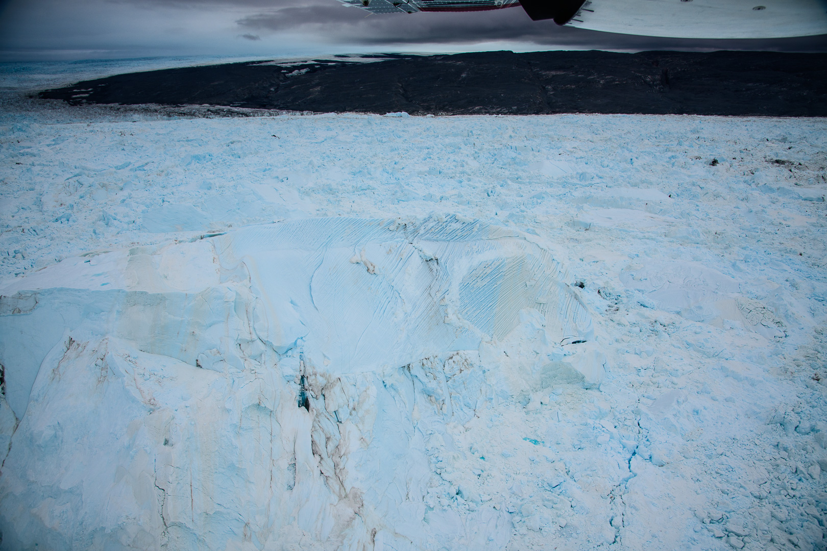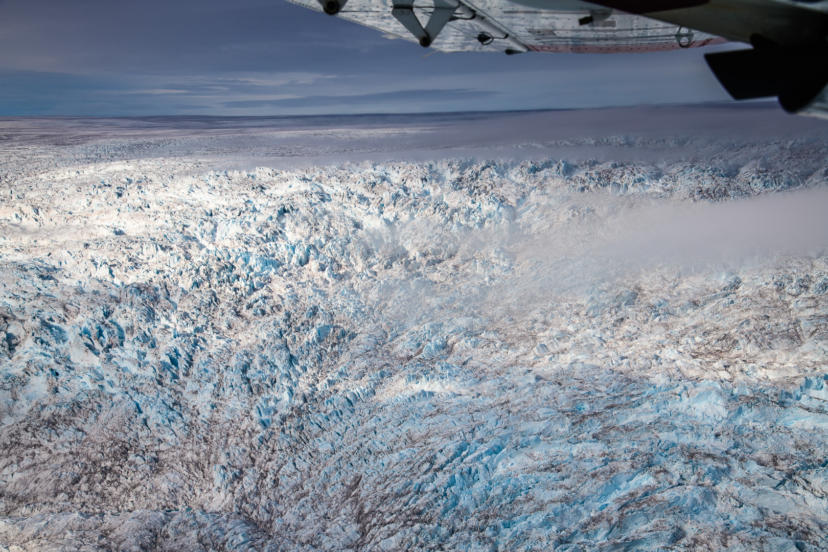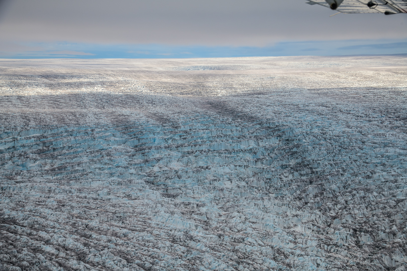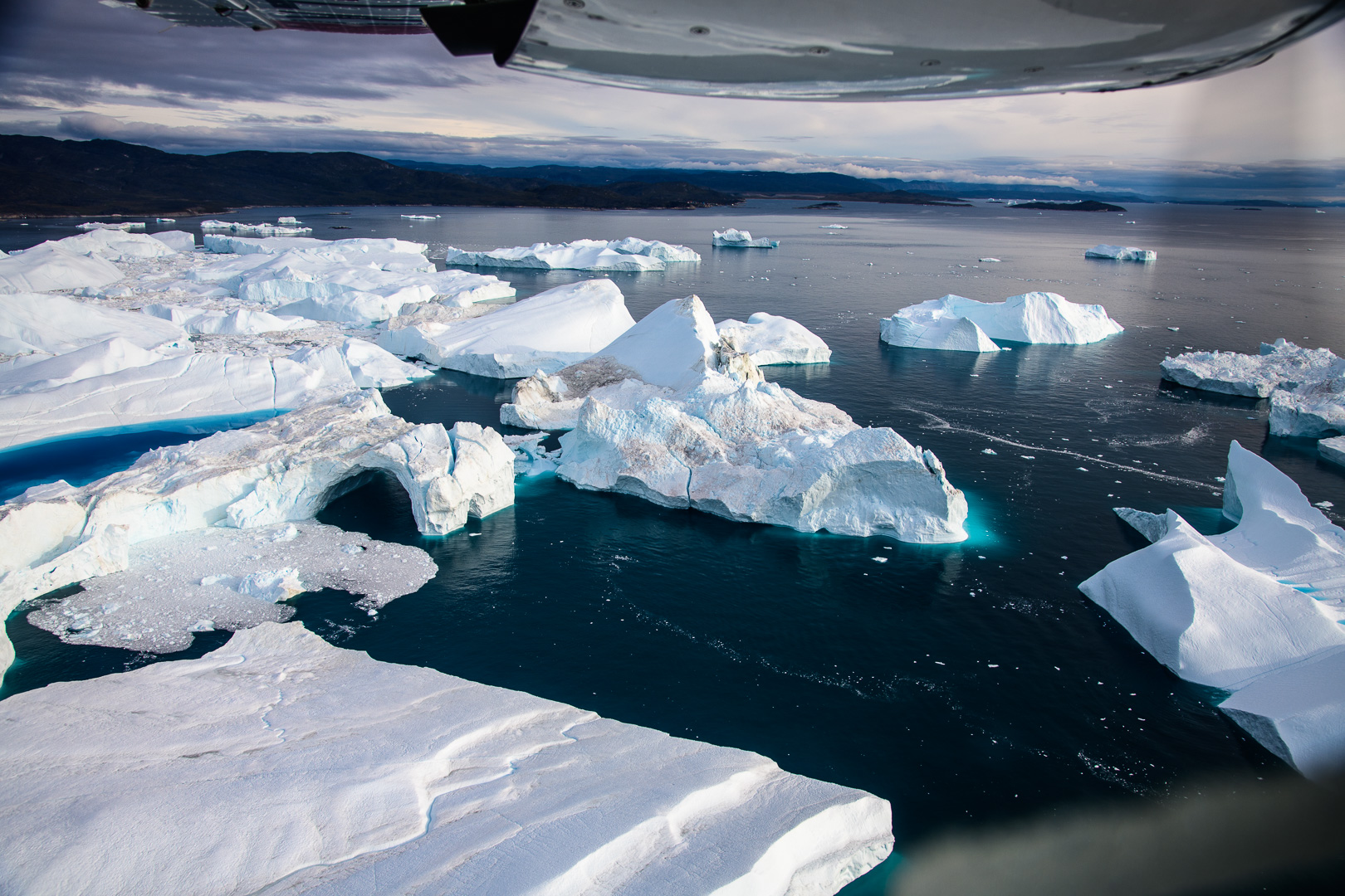 I again opted out of the planned walk and took the last day more easily. Only in the late morning did I think I should take the opportunity to see the glacier more closely. It was possible to make flights by helicopter or light aircraft to the glacier face where it breaks off the inland ice about 50 km inland. The helicopter trips were all booked out but I could go at the end of the afternoon on a one-hour flight with a small 5-seater plane. The round trip from the airport first went to the Avnnarieq side glacier and then along the edge of the inland ice to the head of the Kangia glacier. There great views of the 7 km wide ice cliff where the icebergs break off and then one flies the full length of the fjord packed with giant icebergs. Not all of it can be seen any other way. On reaching the sea even some whales could be spotted. The weather was not perfect but clear enough. I had taken a taxi to the airport and back again (with 2 other people) directly to the restaurant in the centre of town where I was to meet the group, saving walking from the hotel. I was back just in time for our last dinner which consisted of halibut again. After dinner I walked back along the coast and could take photos in the good evening light since I still had my camera with me.