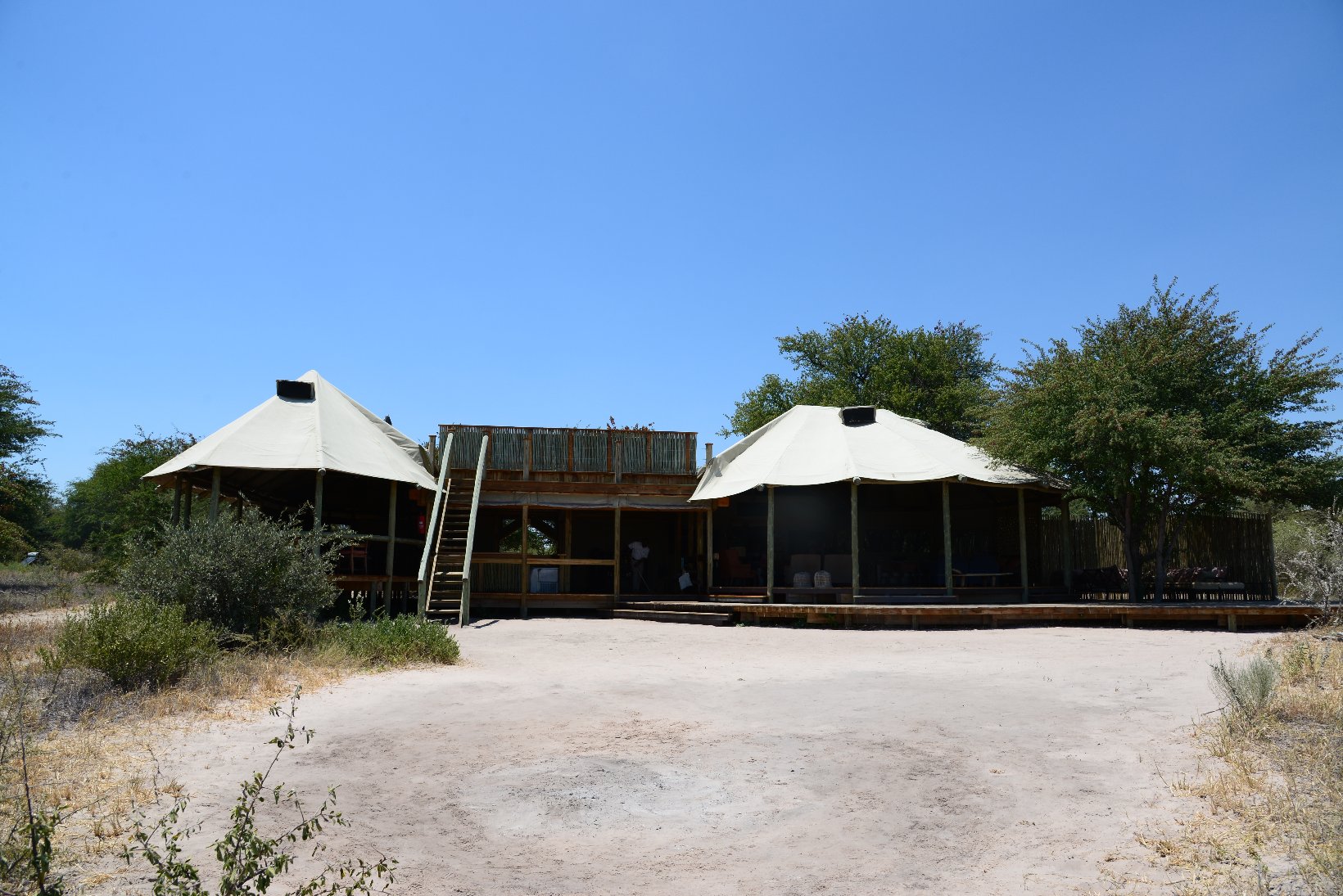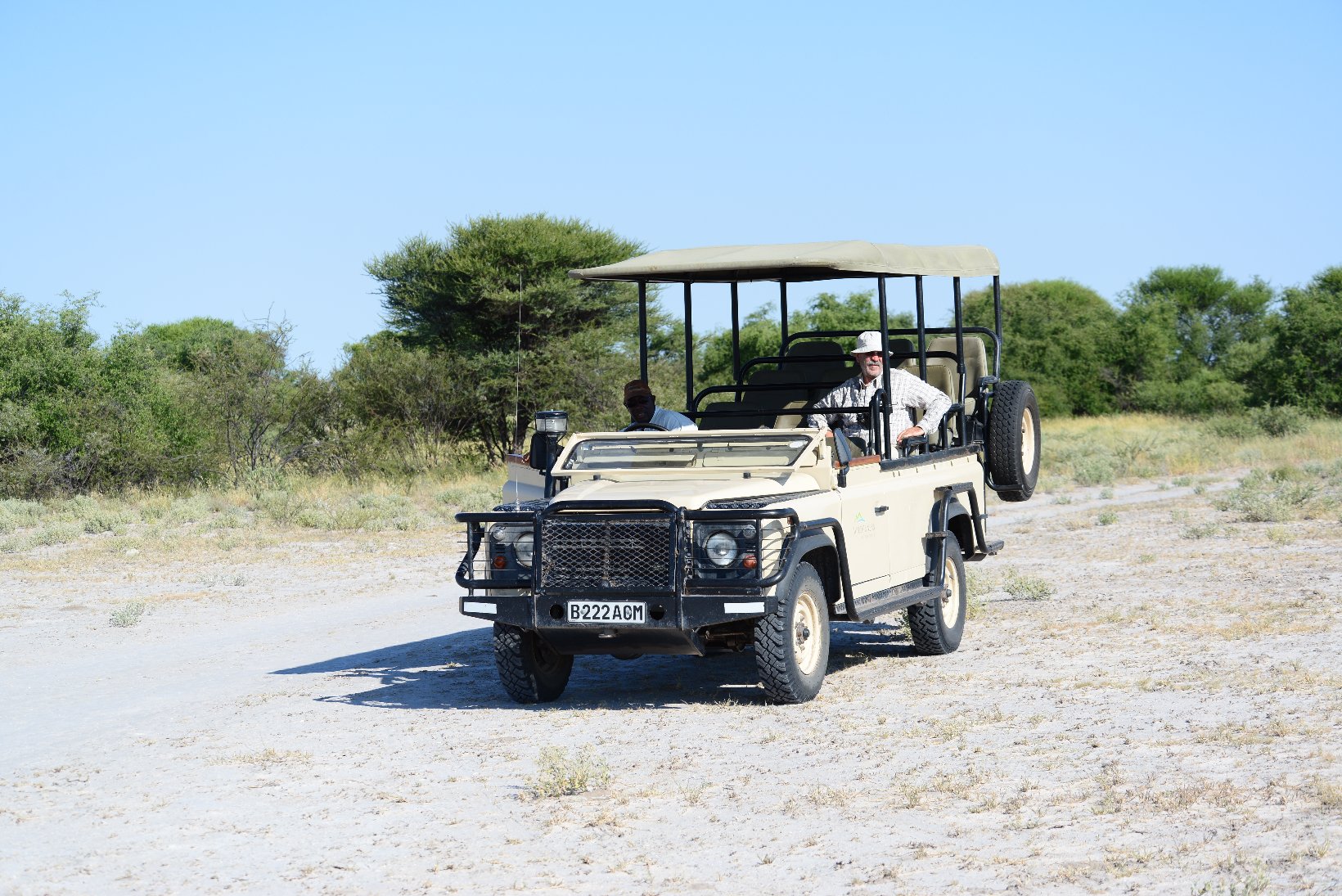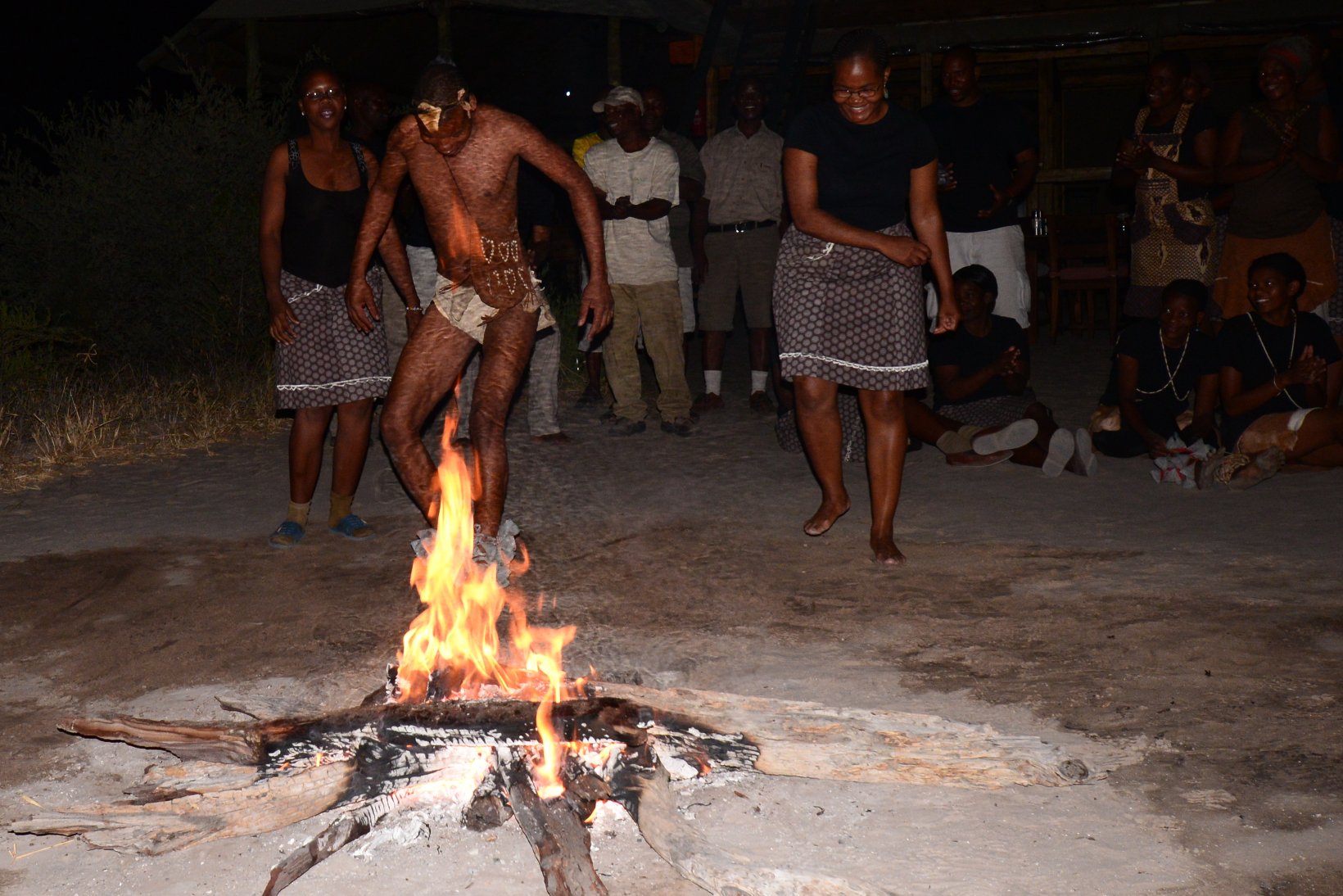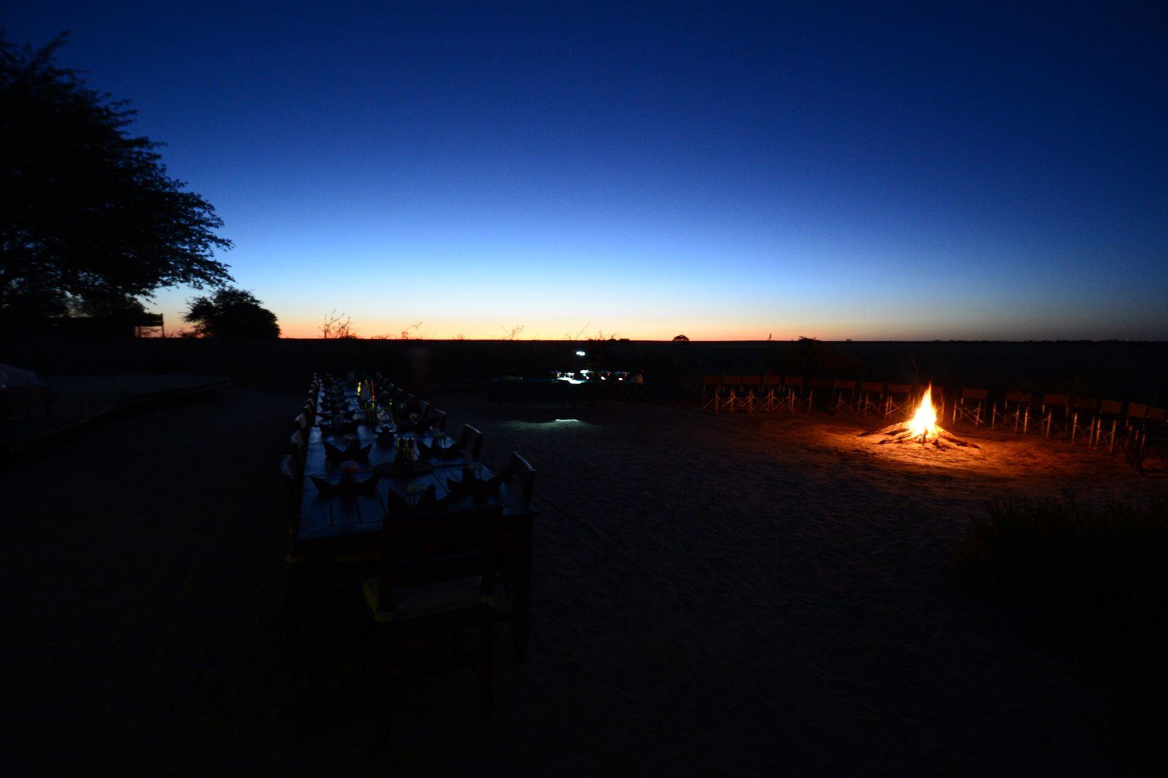After the flight from Johannesburg I transferred from the international to the domestic part of Maun Airport – a walk of a few meters – and made contact with the staff of Wilderness Air who provided me with a single ticket for all my local flights in Botswana. The domestic part was even smaller than the international with a distance from the security check to the departure gate of about 5 meters. In the plane I was privileged to sit in the co-pilots seat but was careful not to press any pedals or move the joystick. The flight lasted about one hour before the Kalahari Plains lodge came into view at the edge of a large dry ‘pan’. central lodge building is a simple open wooden construction with a lounge, bar and dining area. The en-suite individual lodges have canvas and netting walls and a veranda overlooking the pan. The guide collected the 5 passengers with an open 9-seater Land Rover and my first safari drive started at about 16.30. The morning drive starts around dawn at 6.00 and this became my normal schedule for the next 12 days. Breakfast is provided at 5.30, lunch at 11.00 and dinner at about 20.00. This makes a long day but there is time for a siesta during the hottest part of the day, at least if one is not changing lodges. One evening the lodge staff provided entertainment in the form of singing and dancing round a camp fire followed by dinner under the stars.