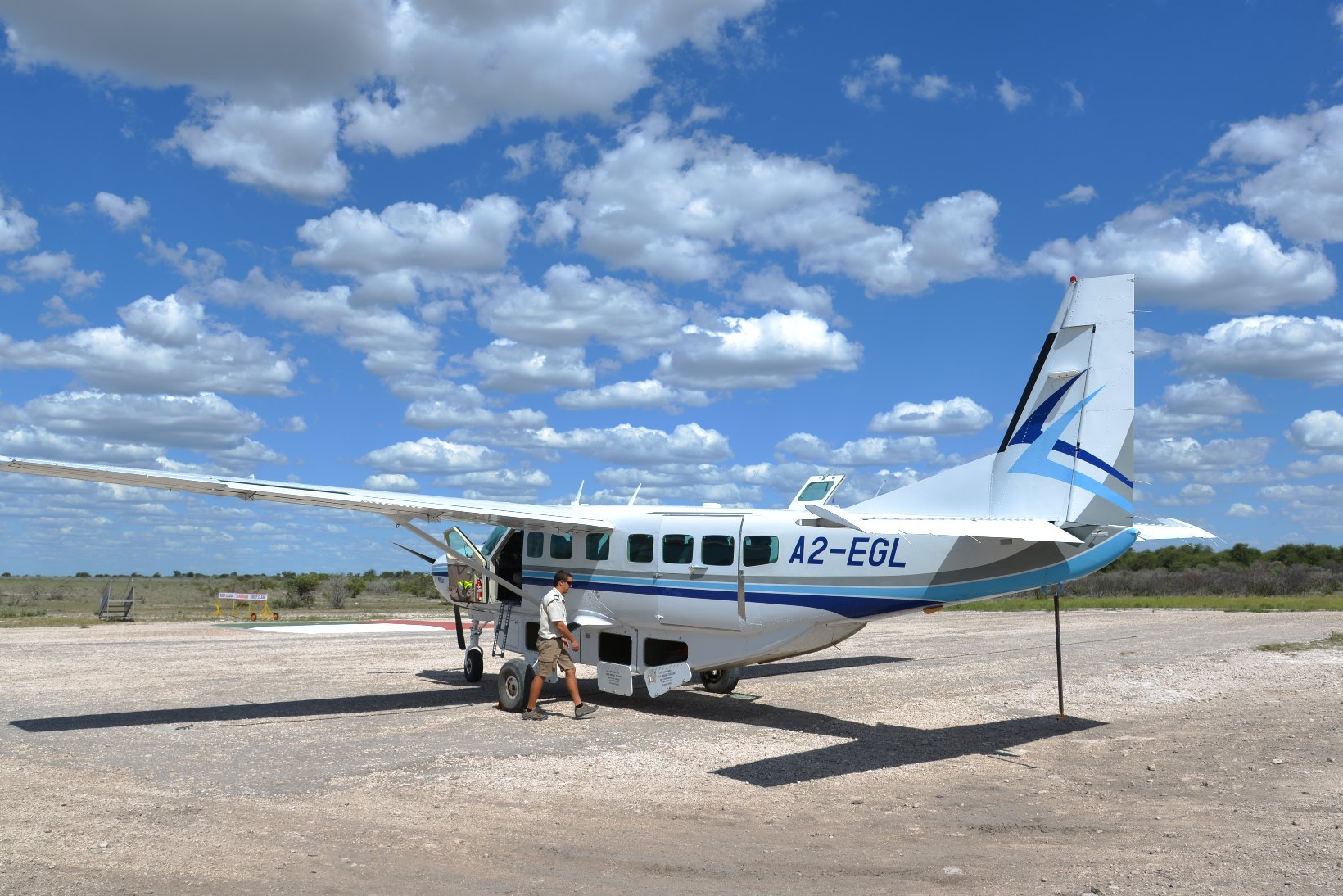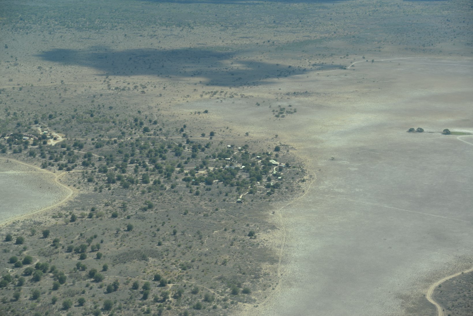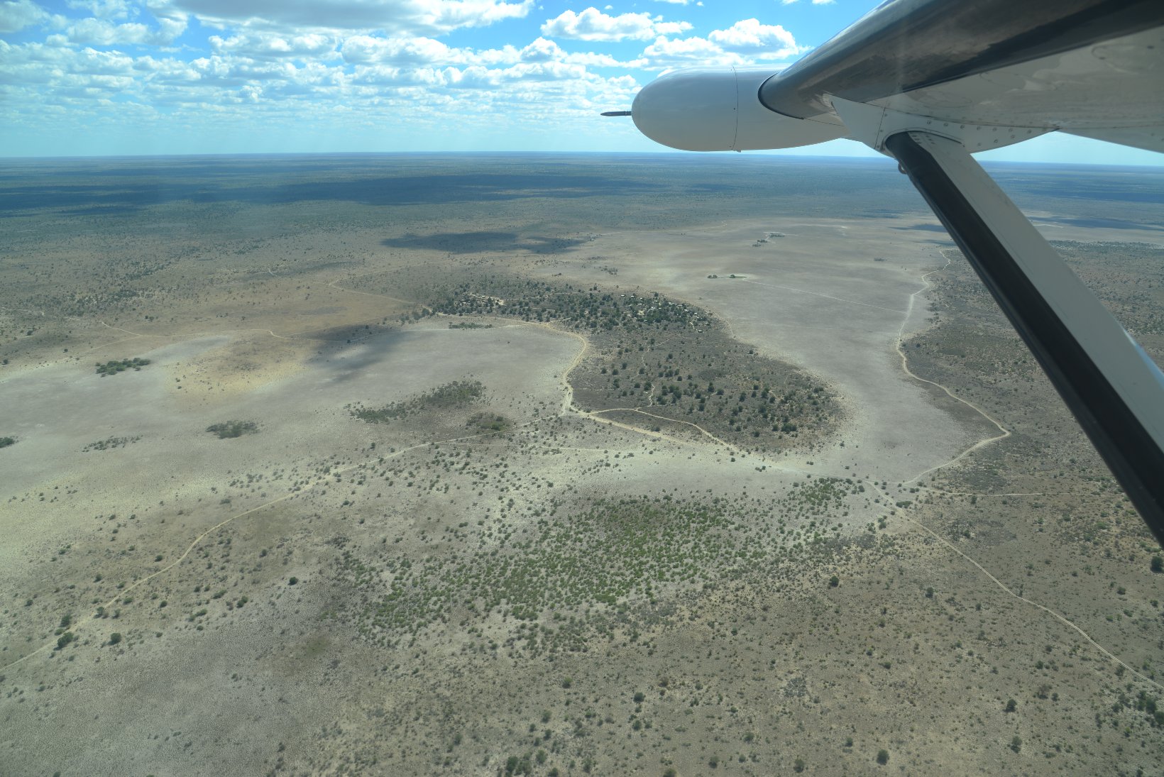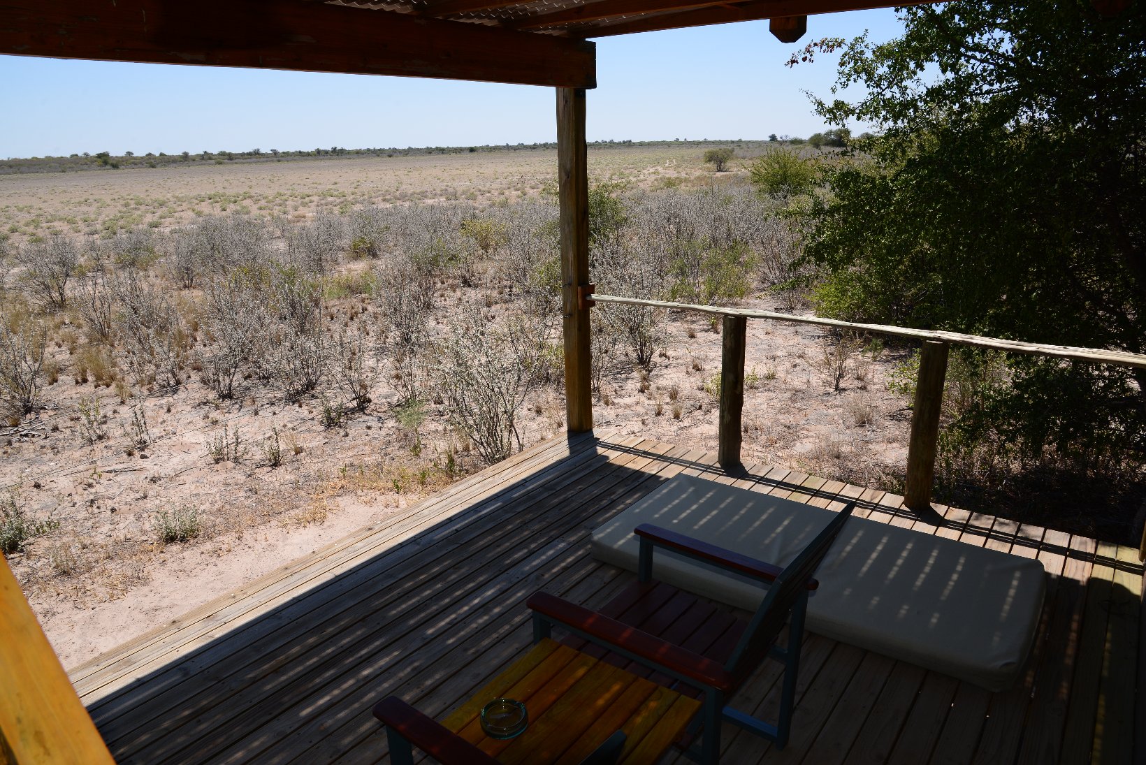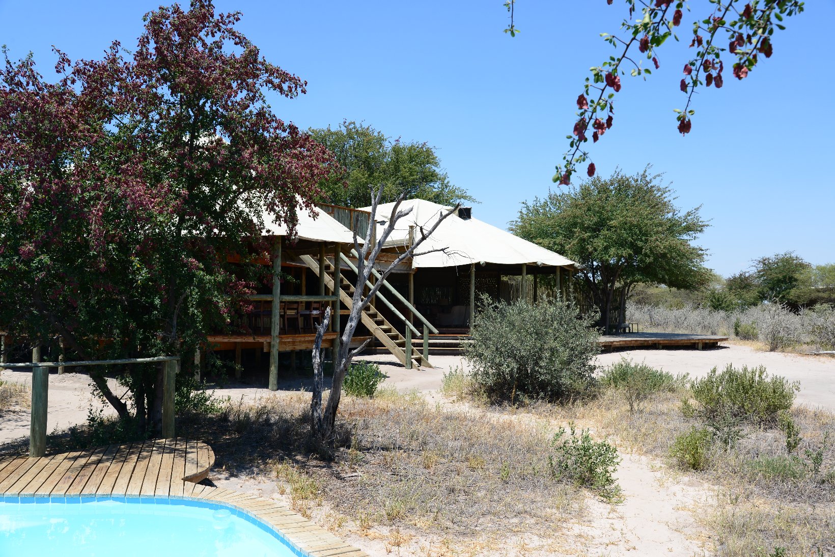 After the flight from Johannesburg I transferred from the international to the domestic part of Maun Airport – a walk of a few meters – and made contact with the staff of Wilderness Air who provided me with a single ticket for all my local flights in Botswana. The domestic part was even smaller than the international with a distance from the security check to the departure gate of about 5 meters. In the plane I was privileged to sit in the co-pilots seat but was careful not to press any pedals or move the joystick. The flight lasted about one hour before the Kalahari Plains lodge came into view at the edge of a large dry ‘pan’. central lodge building is a simple open wooden construction with a lounge, bar and dining area. The en-suite individual lodges have canvas and netting walls and a veranda overlooking the pan. The guide collected the 5 passengers with an open 9-seater Land Rover and my first safari drive started at about 16.30. The morning drive starts around dawn at 6.00 and this became my normal schedule for the next 12 days. Breakfast is provided at 5.30, lunch at 11.00 and dinner at about 20.00. This makes a long day but there is time for a siesta during the hottest part of the day, at least if one is not changing lodges. One evening the lodge staff provided entertainment in the form of singing and dancing round a camp fire followed by dinner under the stars.