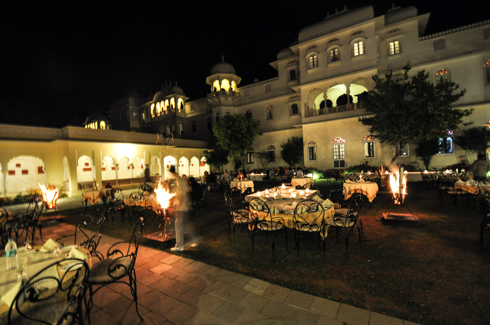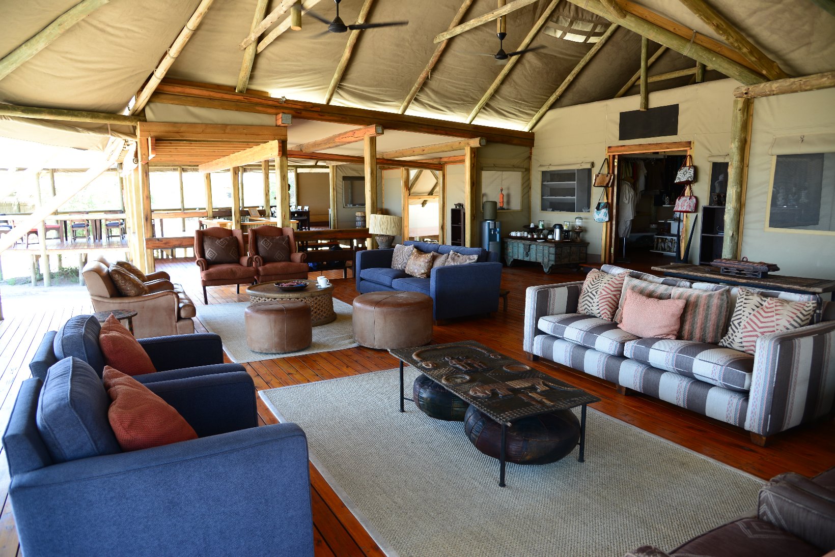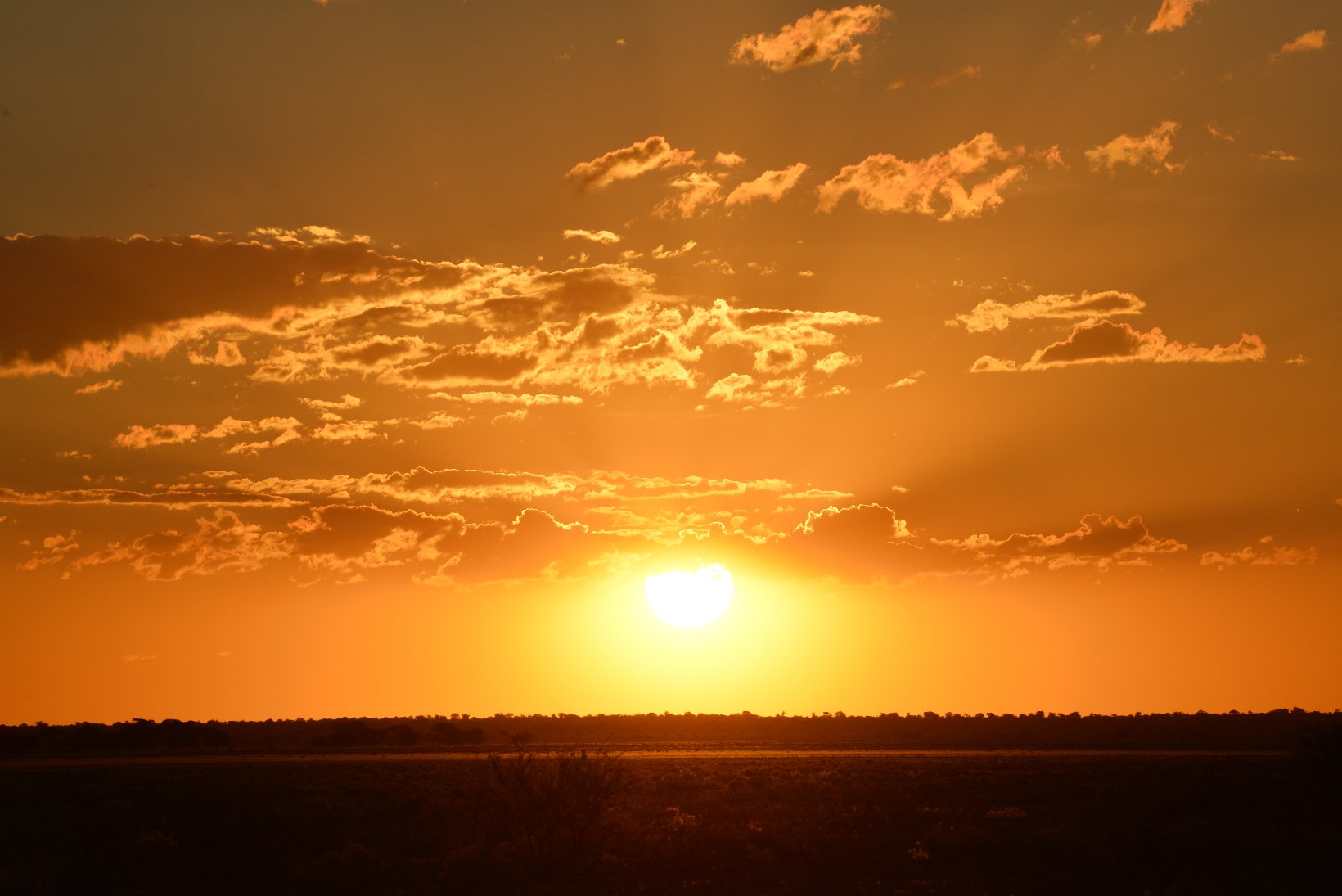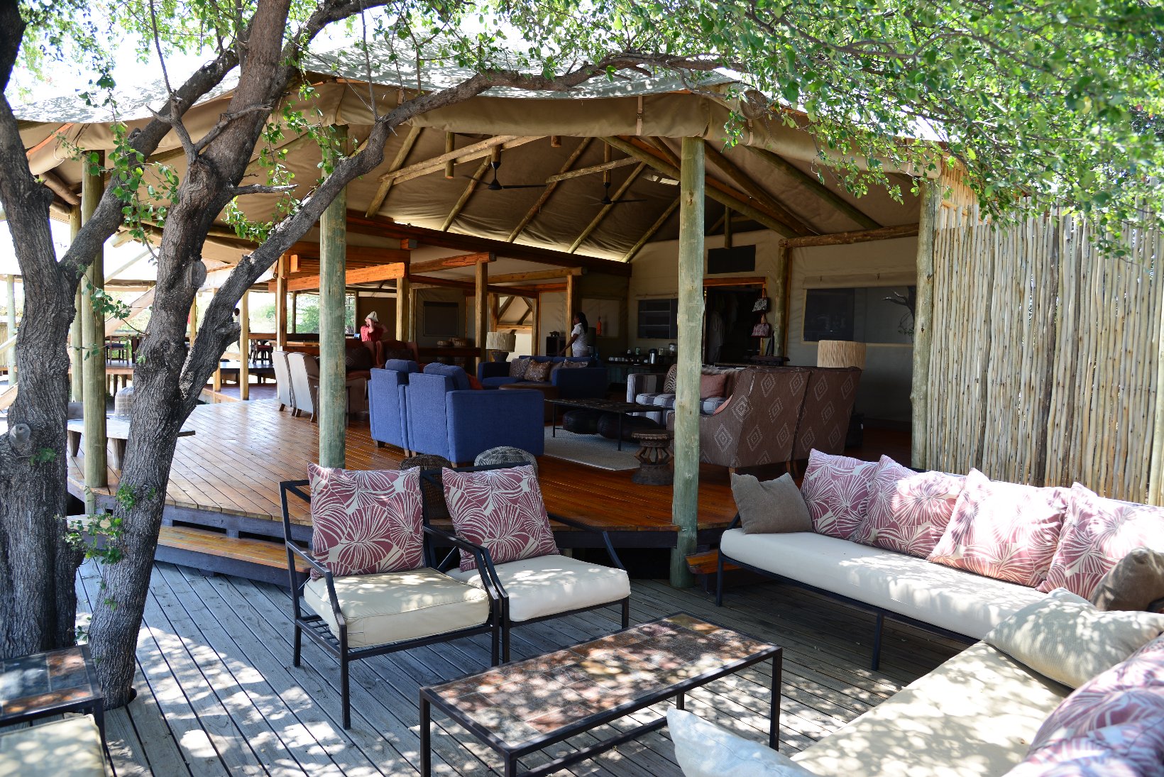 After the flight from Johannesburg I transferred from the international to the domestic part of Maun Airport – a walk of a few meters – and made contact with the staff of Wilderness Air who provided me with a single ticket for all my local flights in Botswana. The domestic part was even smaller than the international with a distance from the security check to the departure gate of about 5 meters. In the plane I was privileged to sit in the co-pilots seat but was careful not to press any pedals or move the joystick. The flight lasted about one hour before the Kalahari Plains lodge came into view at the edge of a large dry ‘pan’. central lodge building is a simple open wooden construction with a lounge, bar and dining area. The en-suite individual lodges have canvas and netting walls and a veranda overlooking the pan. The guide collected the 5 passengers with an open 9-seater Land Rover and my first safari drive started at about 16.30. The morning drive starts around dawn at 6.00 and this became my normal schedule for the next 12 days. Breakfast is provided at 5.30, lunch at 11.00 and dinner at about 20.00. This makes a long day but there is time for a siesta during the hottest part of the day, at least if one is not changing lodges. One evening the lodge staff provided entertainment in the form of singing and dancing round a camp fire followed by dinner under the stars.