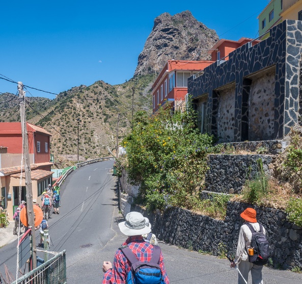 Nochmals etwas Botanik: Opuntien/Kaktusfeigen wachsen hier zahlreich. Die Pflanze stammt aus Zentral- und Südamerika. Auf ihr lebt die Cochenille-Schildlaus. Anschaulich erzählt uns Carlo vom roten Farbstoff, indem er eine zwischen seinen Fingern zerdrückt. Zu guter Letzt das Wolfsmilchgewächs (Euphorbia). Wenn man es schneidet, tritt eine Milch aus, die ist giftig. Zu Zeiten, als die Insulaner sich vor den Konquistadoren verstecken mussten, verwendeten sie diese Milch zum Fischen. Nach dem Verzehr der leicht toxischen Fische sollen sie dann etwas Bauchschmerzen bekommen haben. Durch mannshohen Schilfwald und grüne Weinterrassengelangen wir in Vallehermoso an. Am Dorf–eingang streifen wir den Friedhof Santa Clara. Jemand wirft die Frage auf, ob diese Fächer an der Wand Urnen Gräber seien. Nein, die Särge werden eingemauert. Der Boden ist ja aus Vulkanischem Gestein und lässt keine Erdbestattung zu. |