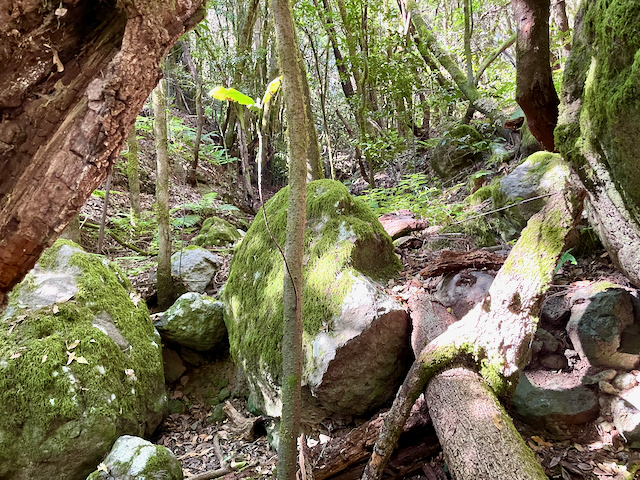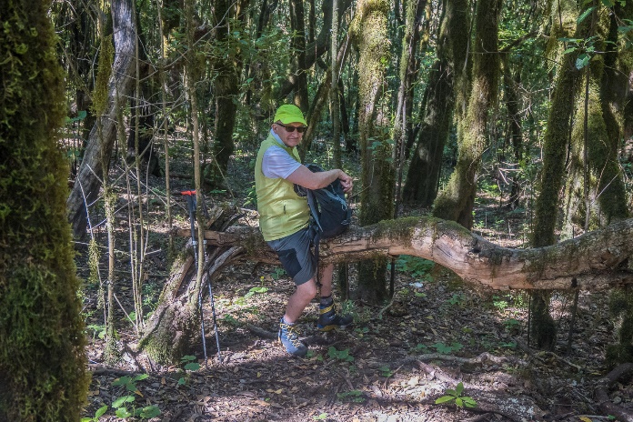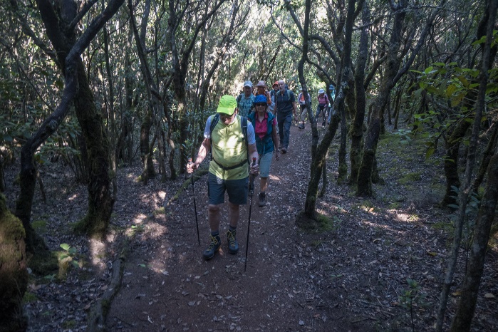 Die Landschaft auf der Wanderung war atemberaubend, mit üppigen Wäldern, erstens meistens aus Heide- (Erika) und Gagelbäumen (MyricaFaya) und später, unter der kleinen Lourdes Kapelle (Ermita de Lourdes) vorwiegend aus Lorbeerbäumen. Es gab ein paar Panoramablicke auf die umliegenden Berge und wir erkannten El Roque, der unsere gestrige, viel schwierigere Wanderung stets begleitet hatte. Wir trafen auch auf eine Vielzahl von Pflanzen, aber nicht von Tierarten, außer die hungrigen Vögel, die uns beim Picknick besuchten. Kanarienvögel auf der Insel sind im Gegensatz zu den gezüchteten Kanarien, nicht ganz gelb, sondern grüngelb. |