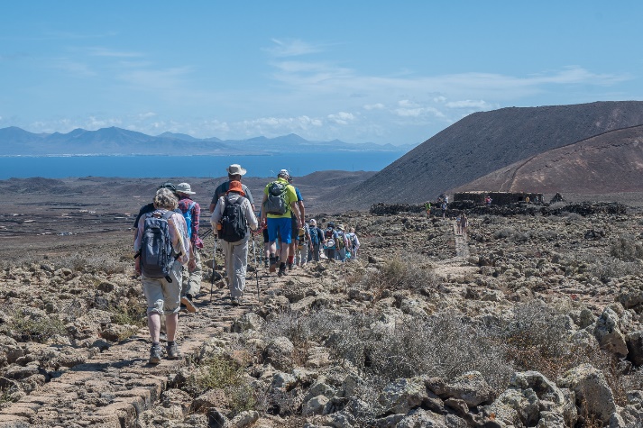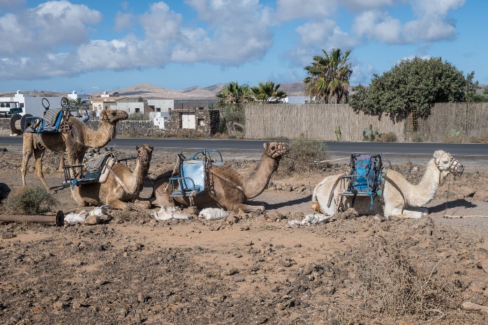 Ich hatte keine Möglichkeit Tina am Vortag zu treffen, so wir mussten zuerst die Wander–programm für der Woche besprechen. Die geplante Wanderung bis Majanicho an der Nordküste haben wir als etwas zu lang gefunden und sie hat eine Variante auf den Calderón Hondo mit mit Anfang und Ende in Lajares vorgeschlagen. Nach einer kurzen Busfahrt starteten wir dann in Lajares und kamen bald eine Kamel Karavan, die auf Kundschaft wartete, vorbei. |