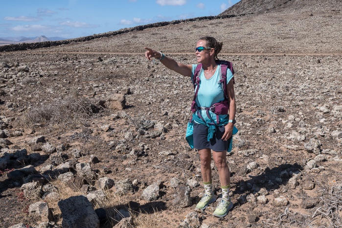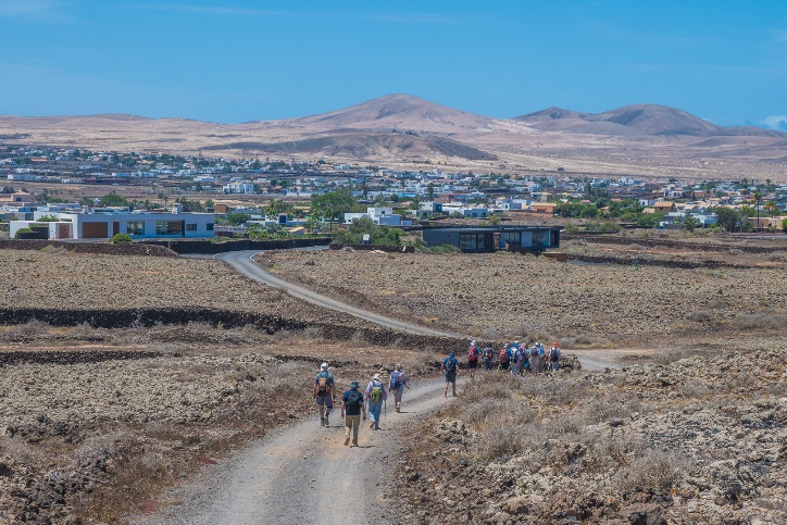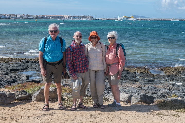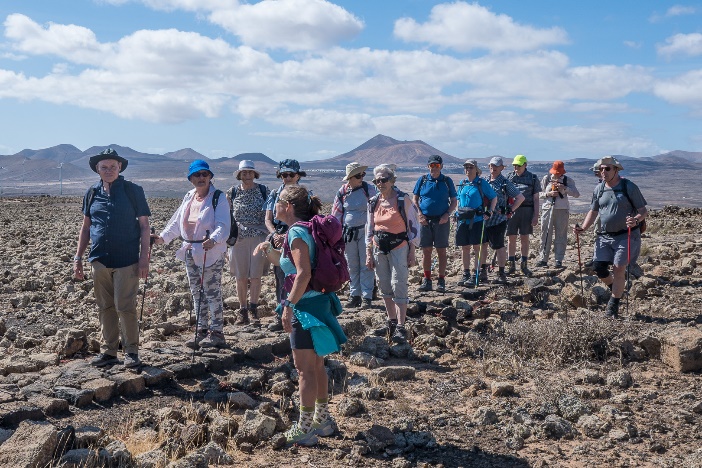 Dies war unsere erste Wandertag auf Fuertaventura. Nach eine sehr schöne Wanderwoche auf dem gebirgige und teilweise bewaldete Insel La Palma befanden wir uns in eine relative flache und sehr karge Landschaft. Die kleinen vulkanischen Hügel erreichen kaum 500m, nicht hoch genug um die Feuchtigkeit der Passatwinde einzufangen. Manche fragten sich ob die Gegend wirklich zum Wandern geeignet war. Jedenfalls freuten wir uns die neue Wanderleiterin, eine junge schicke Deutsche Frau namens Tina, zu treffen. Sie wohnte seit ihrer Jugend in der Nahe in einem Dorf Lajares und war volle Enthusiasmus für Fuerteventura. Lajares war eine kleine verschlafene Ortschaft bis es von Surfer und alternative Leute entdeckt wurde. Es liegt günstig um die von Brandung gepeischten Strände sowohl an der Ost- als auch an der Westküste zu erreichen. Es gibt noch keinen hohen Hotels im Ort aber am Rand schon manchen einstöckigen villaartigen Anwesen. |