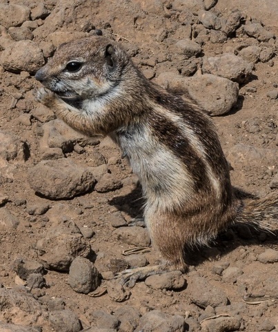 Oben angekommen erwarteten unstraumhafte Ausblicke über die Insel und das Meer bis nach Lanzarote. Der Abstieg erfolgte zuerst auf de gleichem Weg, aber dann mehr nach Norden zu einen alten Ruine, wo wir unsere Mittagspause genommen haben. Wir wurden besucht von neugierigen gestreiften Eichhörnchen die an unseren Proviant teilhaben wollten. |