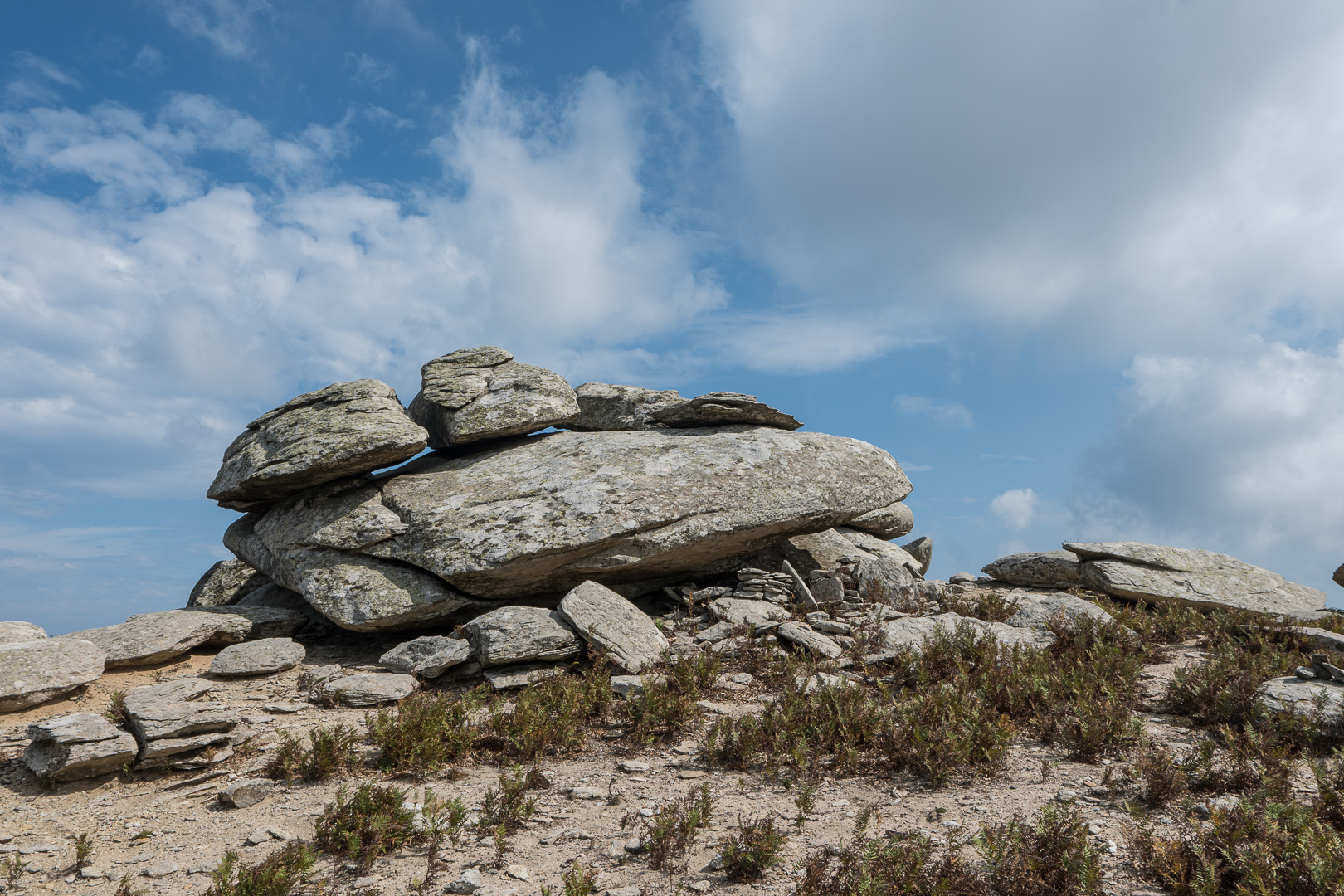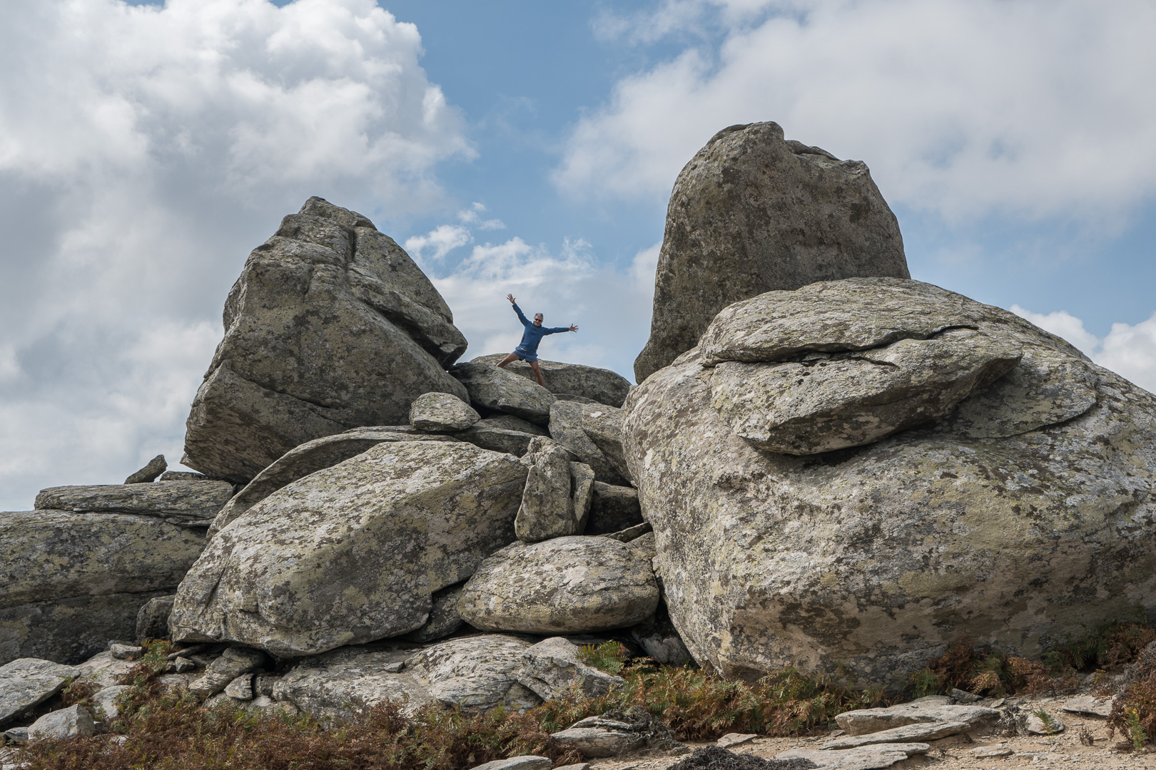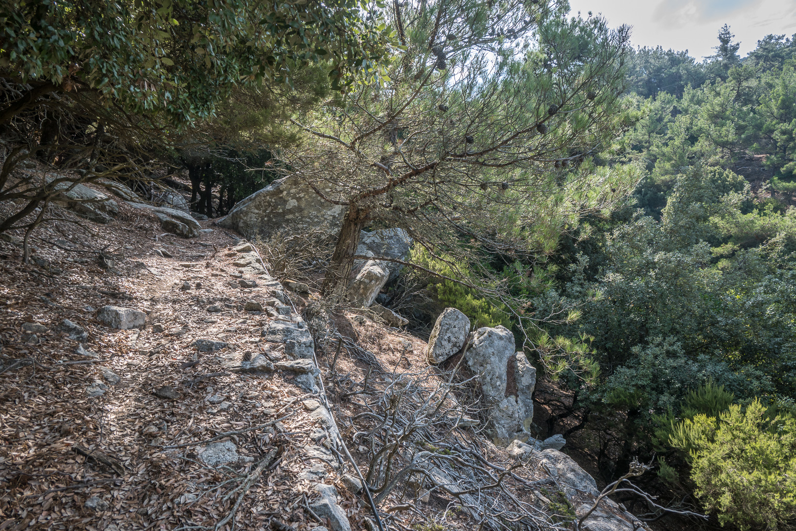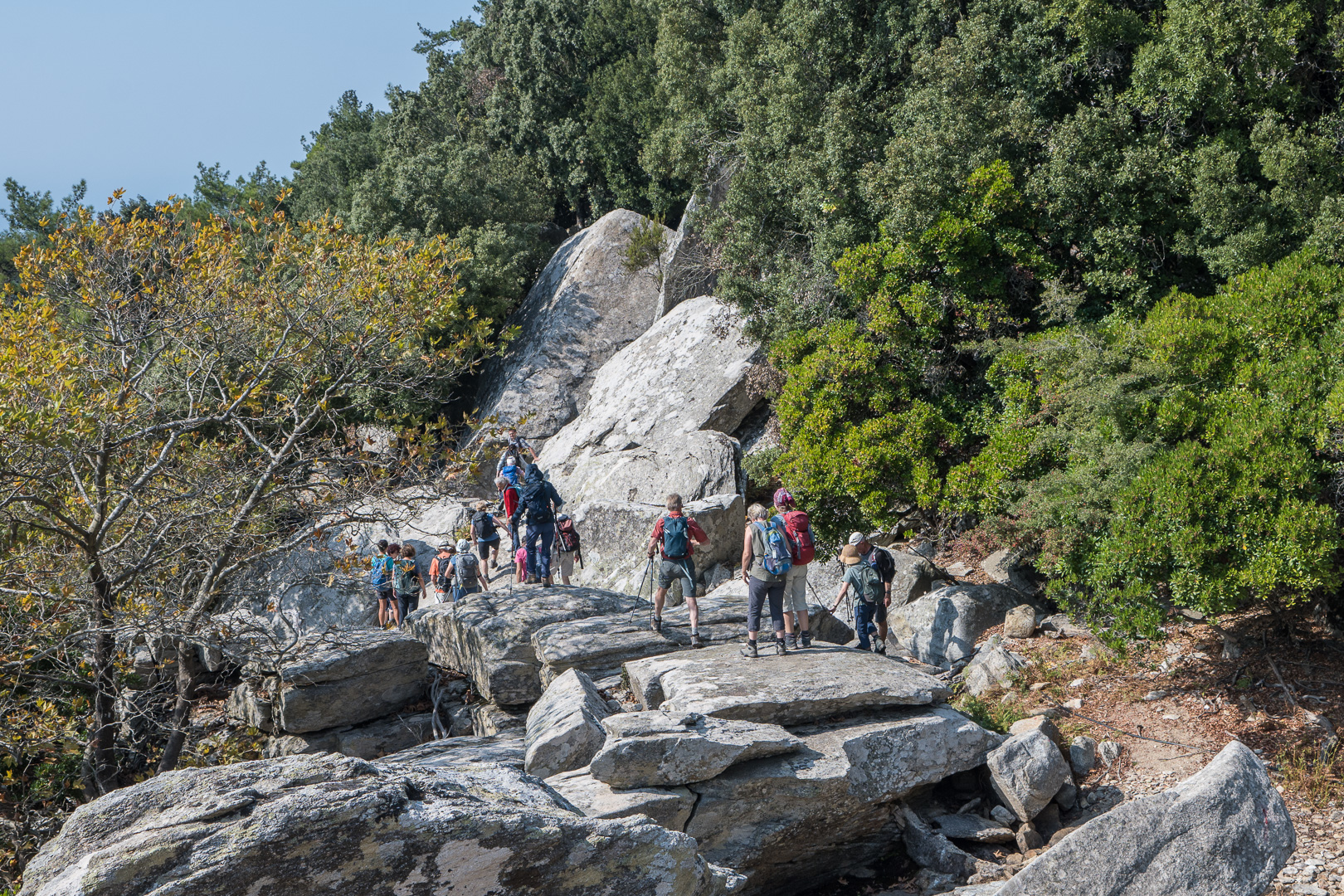 Vom idyllischen Kloster Mundé führt unser Pfad aufwärts zuerst durch Steineiche Wald und dann durch eigentümliche Berglandschaften zu einer Hochalp. Wir laufen an und über gewaltige Steinblöcke. Man kann oder muss auf manche klettern. Auf ca 800m (Seladi) erreichen wir der Hauptkamm der Insel und es öffnet sich einen weiten Blick nach Süden. Zurück auf den Hochalp stossen wir auf eine Berghütte unter eine der riesigen Steine gebaut. Hier verwöhnt uns ein Hirt mit einer am Feuer gebratenen Wildziege. Ein ganz besonderer Leckerbissen!