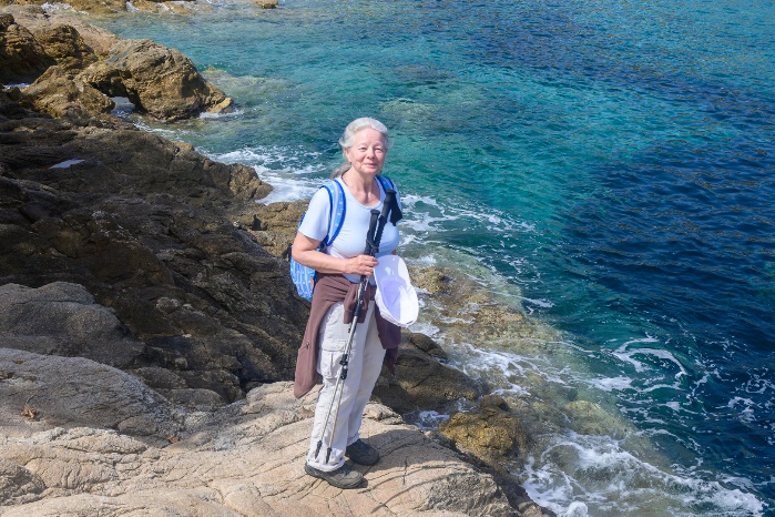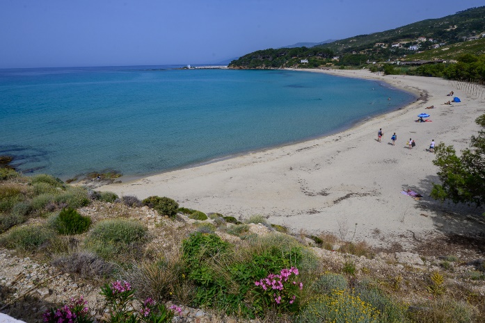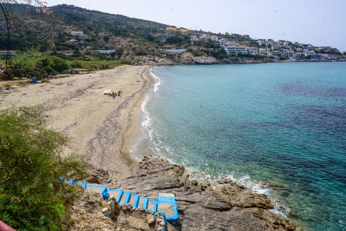 Dann haben wir die Treppen verschmäht und kletterten mit Hilfe von Peter über die Klippen zum Nächsten Strand Mesakti, wo uns eine Deutsche Dame im Eva-Kostüm behilflich war von den Felsen hinunter in den Sand zu steigen. Dann gings weiter den langen Strand entlang und hinauf durch einen kleinen Pinienwald zum Dorf von Gialiskari. |