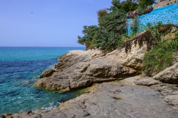 Am anderen Ende vom Dorf führten einige Treppe von der Strasse hinunter zum Strand Livadi. Hier war der Strandbar noch geschlossen, weil die Bade-Saison noch nicht richtig begonnen hat. Wir durchstreiften den ganzen Strand bis den Sand aufhörte. |