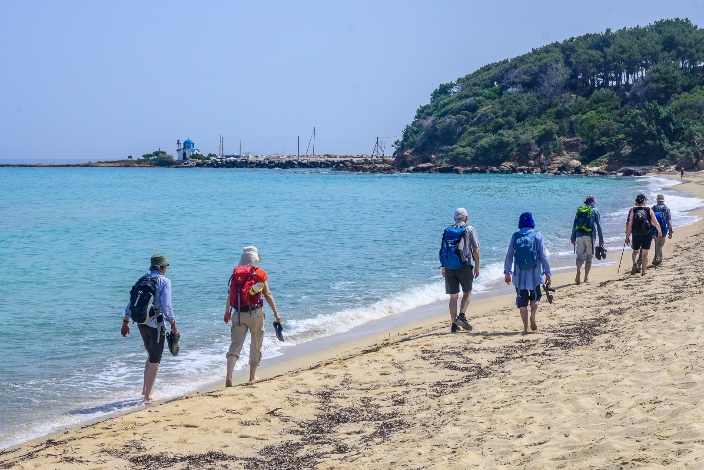 Heute unternahm die ganze Gruppe eine Küstenwanderung von unseren Hotel Cavos Bay zum nahegelegenen schönen Stränden Livadi und Mesaki. Duna die Hündin von Christina war auch dabei und genoss es sichtlich frei am Strand herum zu springen. Die Route ging zuerst durch den Dorf Armenistis wo wir in der Schlucht einige Wasserschildkröten sahen. |