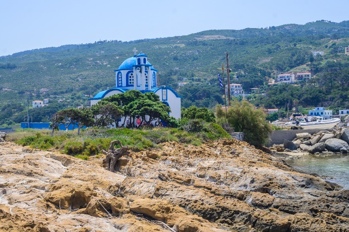Bei den Auserstehungs-Kirchlein in der Nähe des Hafens hat Christina uns von der griechischen Mythologie über Daedalos und Ikaros vorgelesen. Der Rückweg war eigentlich frei und jede könnte sein eigenes Programm machen. Manche sind sogar wieder über die Felsen zum ersten Strand geklettert. |