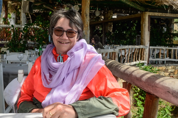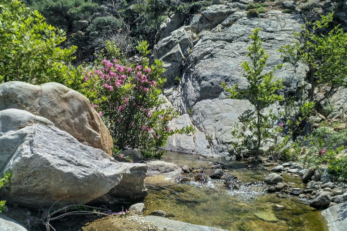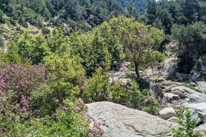 | Das Tal ist sehr grün, es hat Kiefern und das Rosa der Oleanderbüsche leuchtet in der Sonne. Im Bachbett hat es grosse Steine und natürliche Wasserbecken. Wir verweilen etwas am Wasser und hören das muntere Quaken von Fröschen. Gerne würde man hier länger bleiben, es erinnert mich ans Verzasca Tal. Manche der Kiefern sind krank, an ihren Stämmen flattern weisse Bäuschchen-wie Watte oder Fötzelchen von WC Papier. Ein Schädling entzieht den Bäumen das Wasser und durch die Rinde kommt diese „Zuckerwatte“ heraus. Die Bienen saugen daraus den Zuckersaft. | |